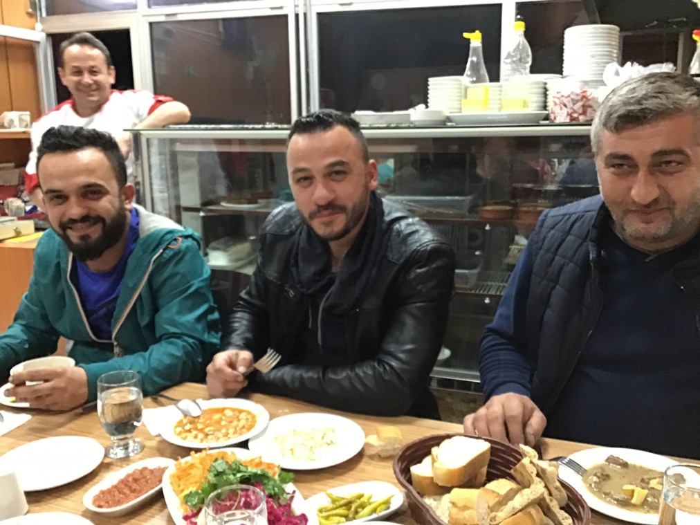 Sachant que nous restions pour la soirée, les trois mécanos nous invitent à dîner. Un petit restau où ils ont leurs habitudes. Evidement, nous n’avons pas pu les inviter ni même régler nos repas. Nous pensions aller nous coucher ensuite mais que nenni ! Nos turcs avaient envie de continuer la soirée. Nous nous sommes retrouvés de nuit, au bord d’un lac, sous une pluie battante, à l’abri d’une porte de coffre de voiture à danser sur de la techno turque en buvant une bière. Et oui, le voyage, c’est aussi cela. Cela reste un excellent moment.