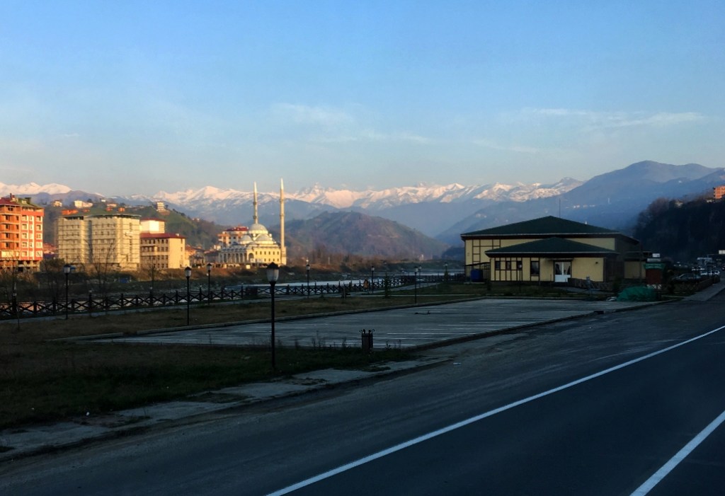 Avant de passer la frontière entre la Géorgie et la Turquie, nous nous arrêtons pour faire le plein et manger un morceau dans le restaurant de la station service. En fait, rien n’était prêt dans les cuisines. On nous a apporté thé et gâteau de semoule pour nous faire patienter. Il était 13h30. Puis, le cuistot a commencé à éplucher les légumes, à faire les boulettes et faire chauffer un four pour faire mijoter tout cela. En attendant, on patientait. On s’est alors aperçu qu’une flaque se formait sous la roue arrière droite, c’était du liquide de frein. La réparation kazakh n’avait pas tenu … Le patron de la station a appelé un collègue mécano et nous voilà partis au garage. Rien à faire pour réparer. La solution adoptée, démonter les freins sur la roue, pincer le tuyau de liquide de frein pour arrêter la fuite et laisser la roue en « roue libre ». Ca n’arrangeait pas nos affaires pour passer les cols mais au moins on pouvait rouler. Jeff a dû être encore plus doux sur le freinage …