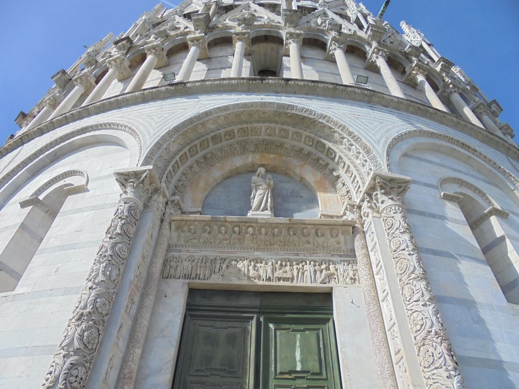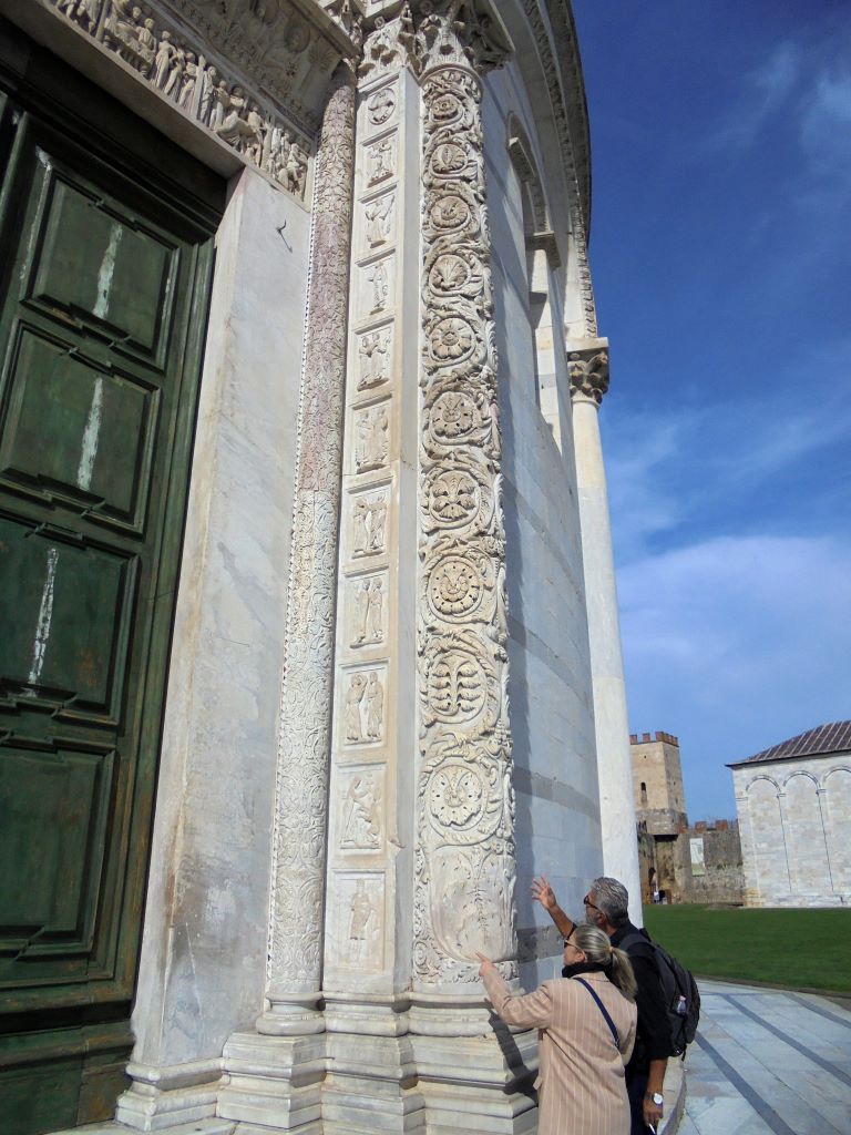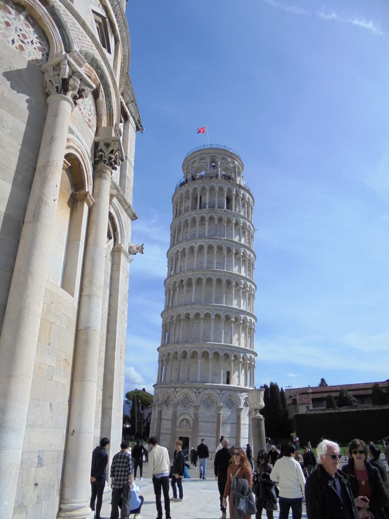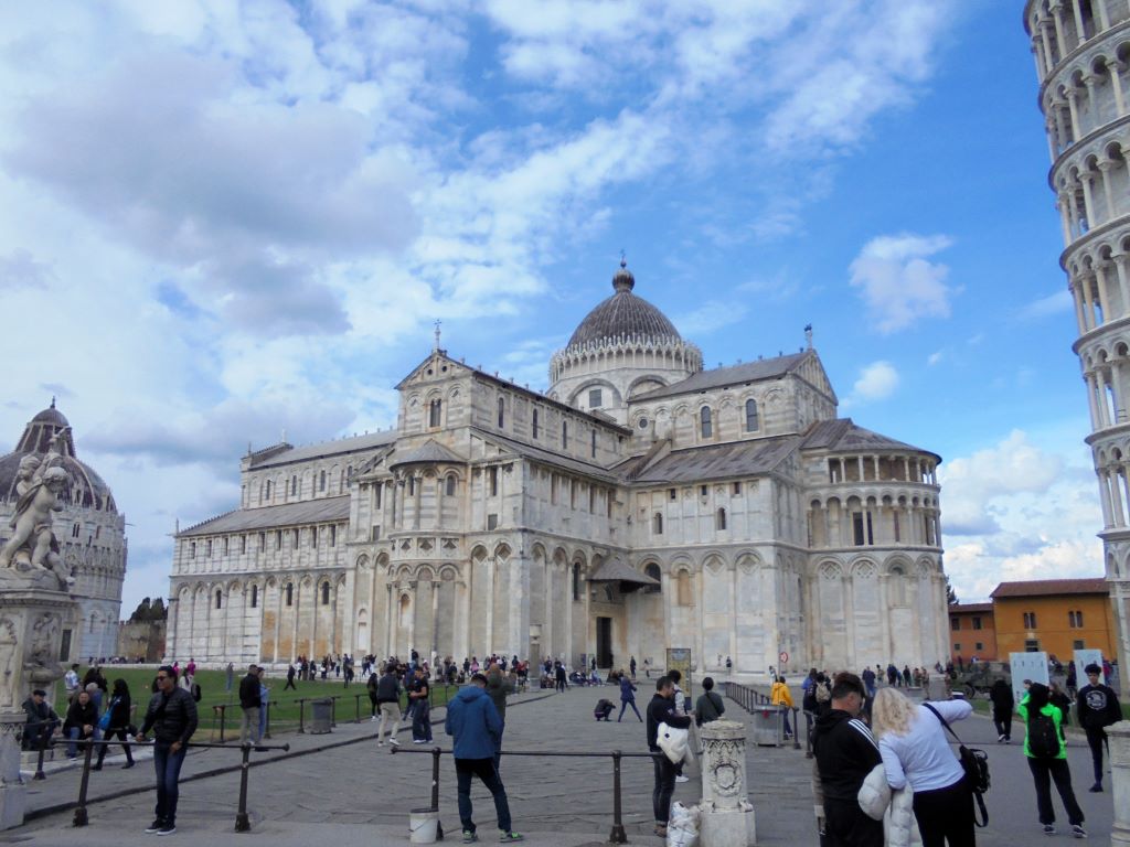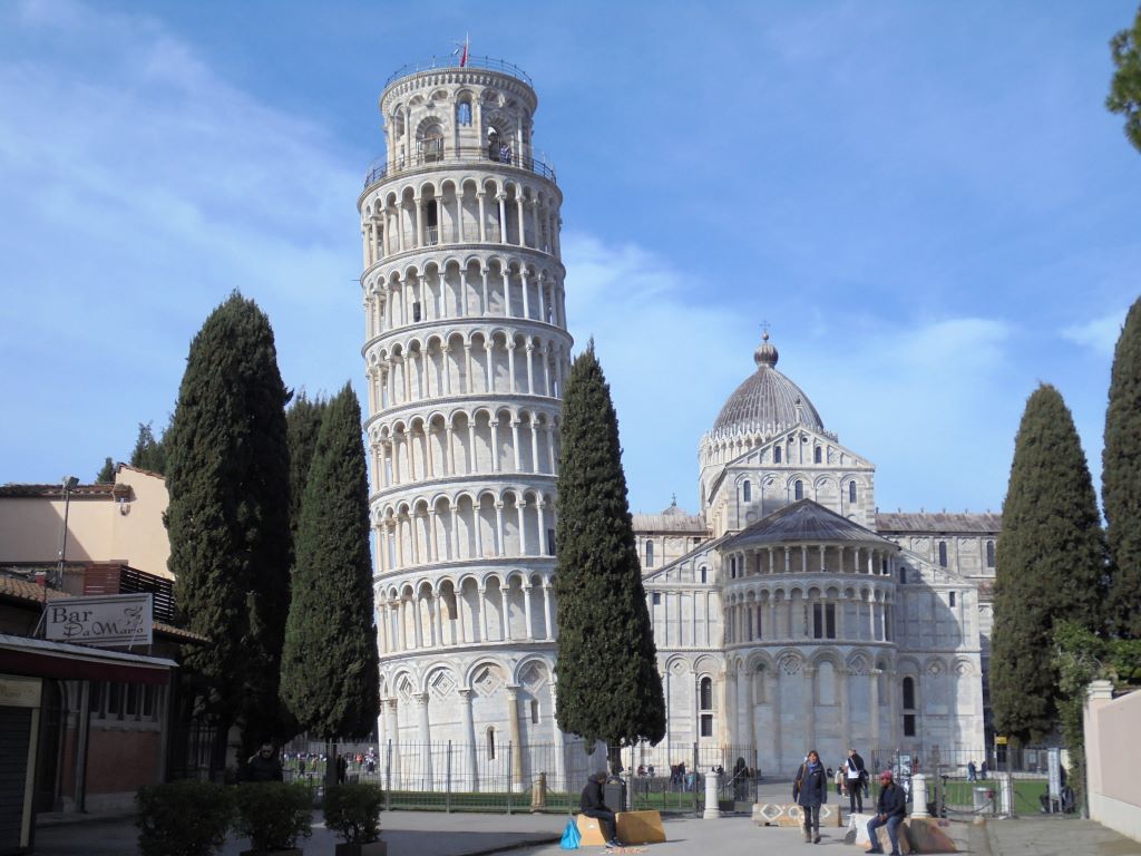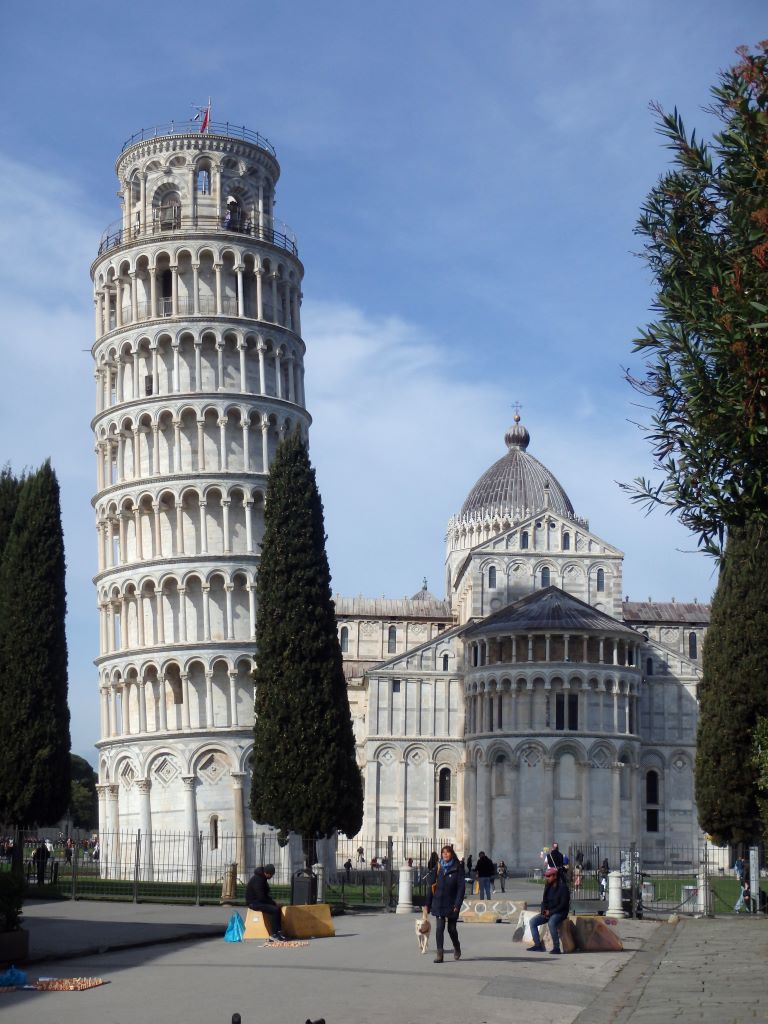 Comment passer à côté de Pise sans s’arrêter voir sa tour penchée ? Nous voilà partis pour la Piazza dei Miracoli. Avant même l’arrivée sur la piazza, le sommet de la tour attire l’œil. Elle est vraiment très penchée !!! Depuis 1178, les architectes ont essayé de redresser cette tour dont la construction a commencé en 1173. En 2024, malgré des gaines en béton armé sous le socle et des tonnes de plomb pour rééquilibrer la tour, rien n’y a fait. Va t-elle tomber ? L’avenir le dira … En attendant, c’est un bel ouvrage. Nous n’avons pas grimpé les 293 marches pour le sommet. Nos genoux n’auraient pas suivi 🙂