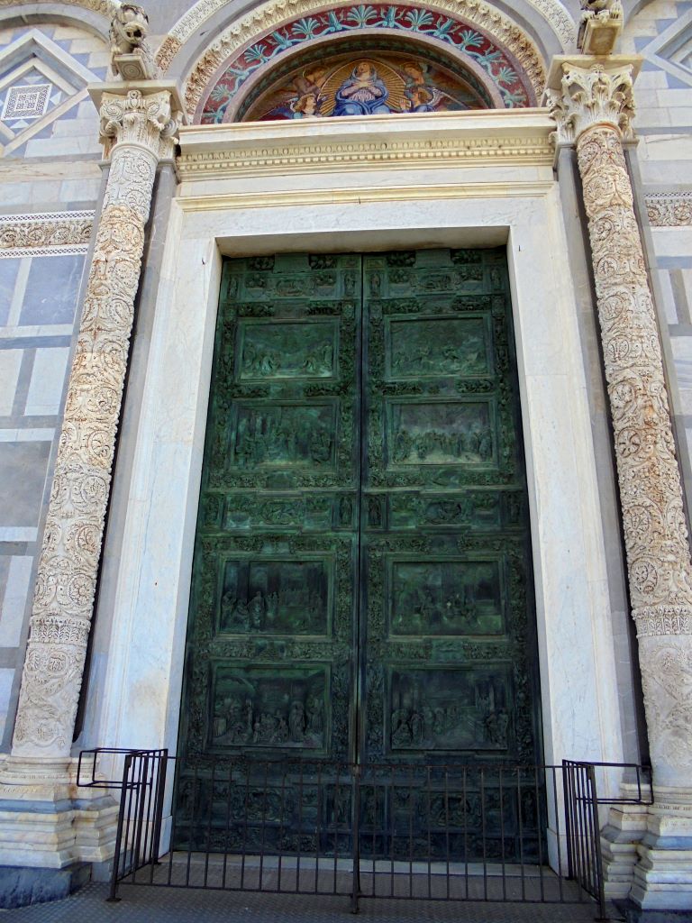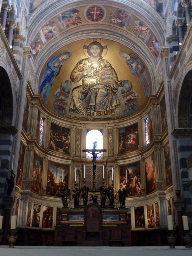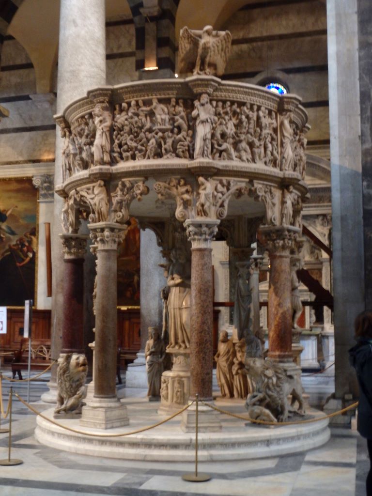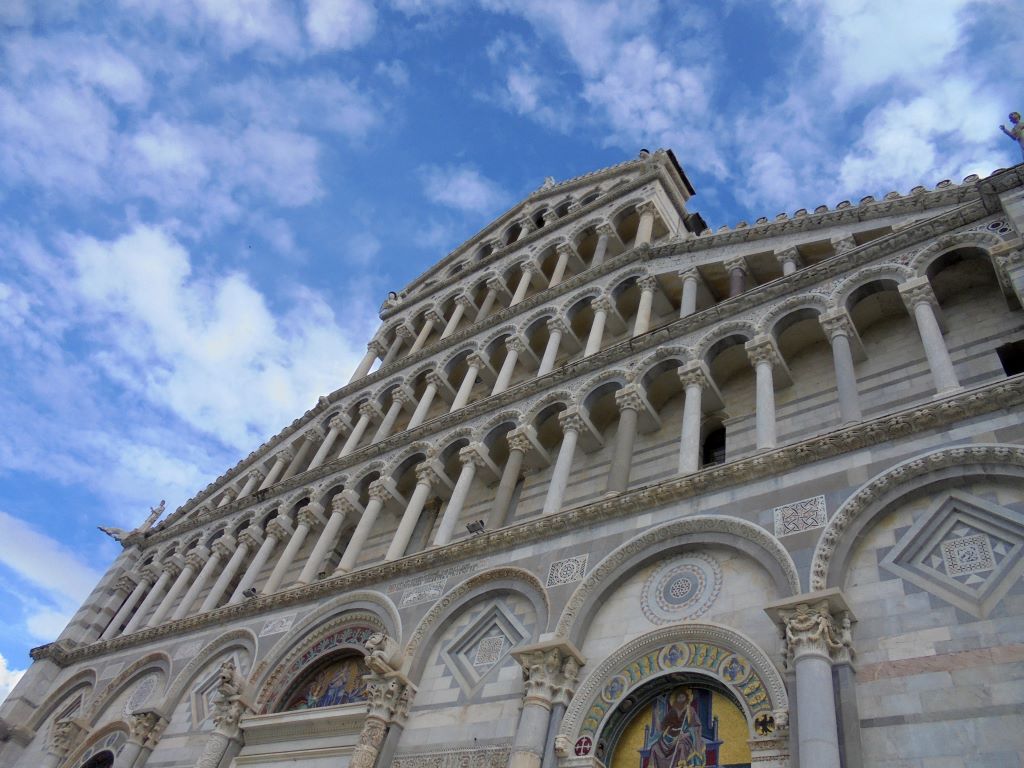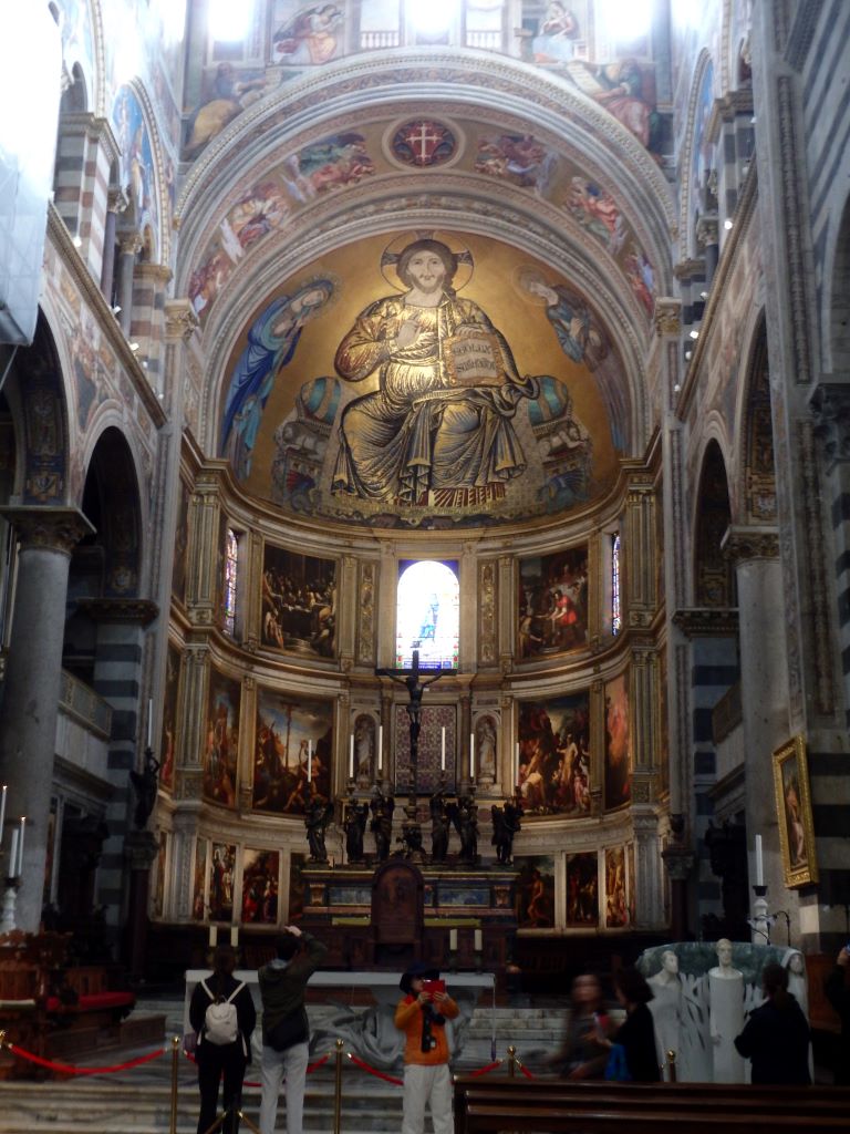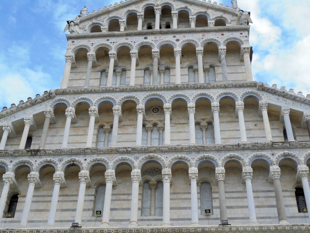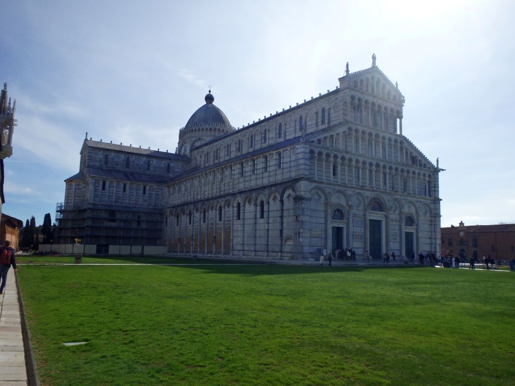 Comment passer à côté de Pise sans s’arrêter voir sa tour penchée ? Nous voilà partis pour la Piazza dei Miracoli. Avant même l’arrivée sur la piazza, le sommet de la tour attire l’œil. Elle est vraiment très penchée !!! Depuis 1178, les architectes ont essayé de redresser cette tour dont la construction a commencé en 1173. En 2024, malgré des gaines en béton armé sous le socle et des tonnes de plomb pour rééquilibrer la tour, rien n’y a fait. Va t-elle tomber ? L’avenir le dira … En attendant, c’est un bel ouvrage. Nous n’avons pas grimpé les 293 marches pour le sommet. Nos genoux n’auraient pas suivi 🙂