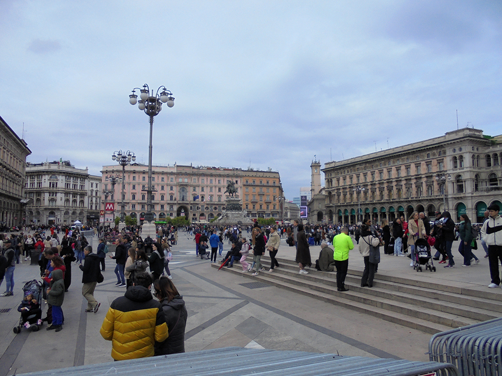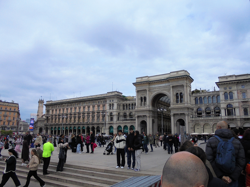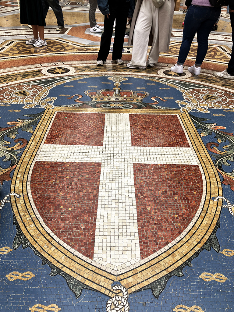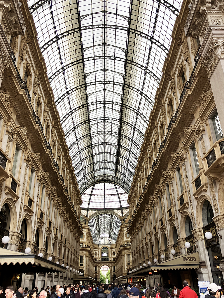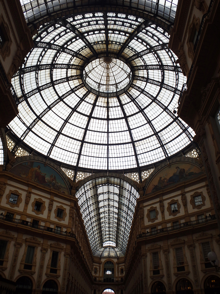 Le duomo est situé sur une grande place pleine de pigeons. Ceux de la place St Marc ??? Une belle statue équestre trône au milieu et la galerie Victor-Emmanuel II vous invite à vous promener sous son plafond de verre. Cela fait penser au Grand palais de Paris . C’est très beau, le sol est en mosaïque. Dior, Prada, Gucci, Chanel, Vuitton et bien d’autres ont installé leurs vitrines dans la galerie. Autant vous dire que le shopping n’est pas pour nous dans ce coin 😉