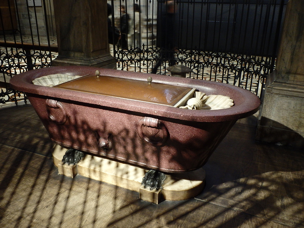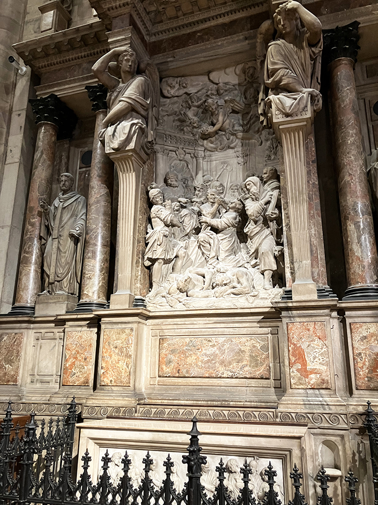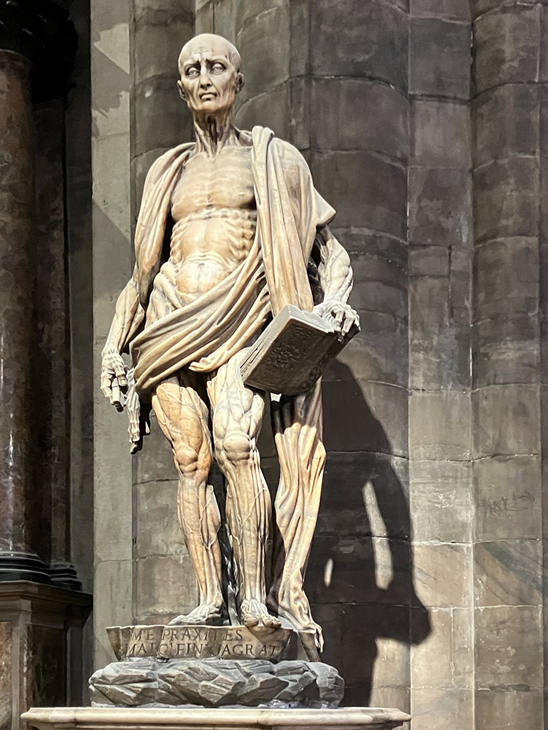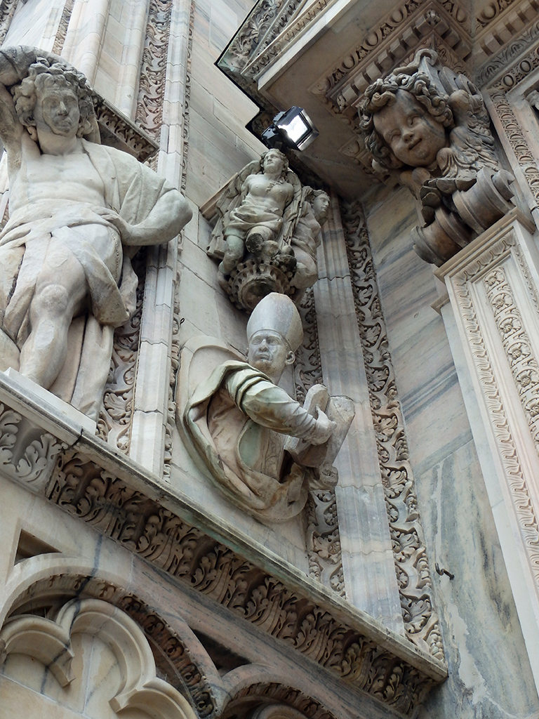 Ci-dessus, le reliquaire d’un évêque béatifié, la statue de St Barthélemy, martyr écorché, le reliquaire contenant les restes de St Charles et le baptistère de la basilique Santa Tecla du 4ème siècle. Le duomo a été construit à l’emplacement de l’ancienne basilique.