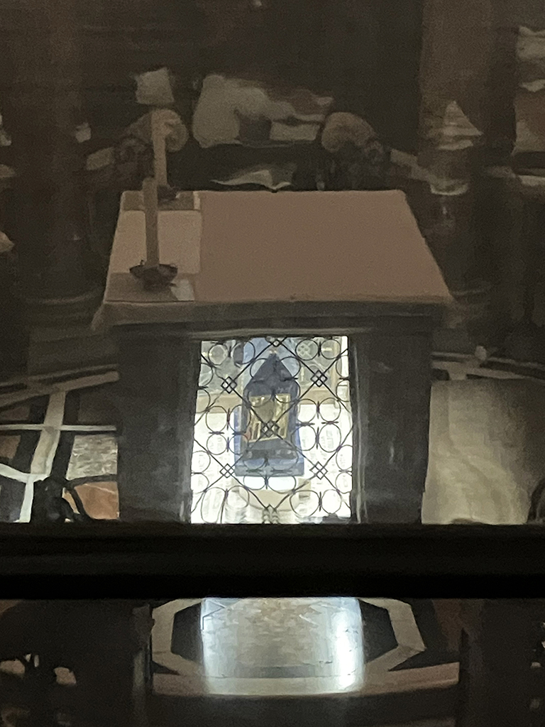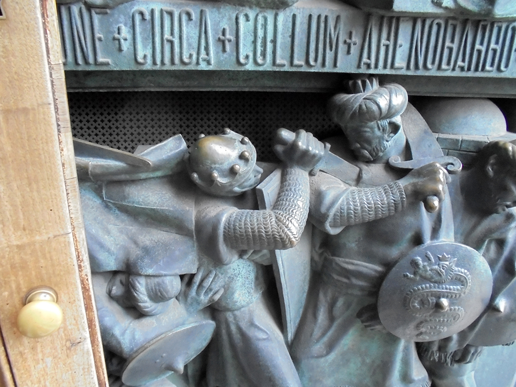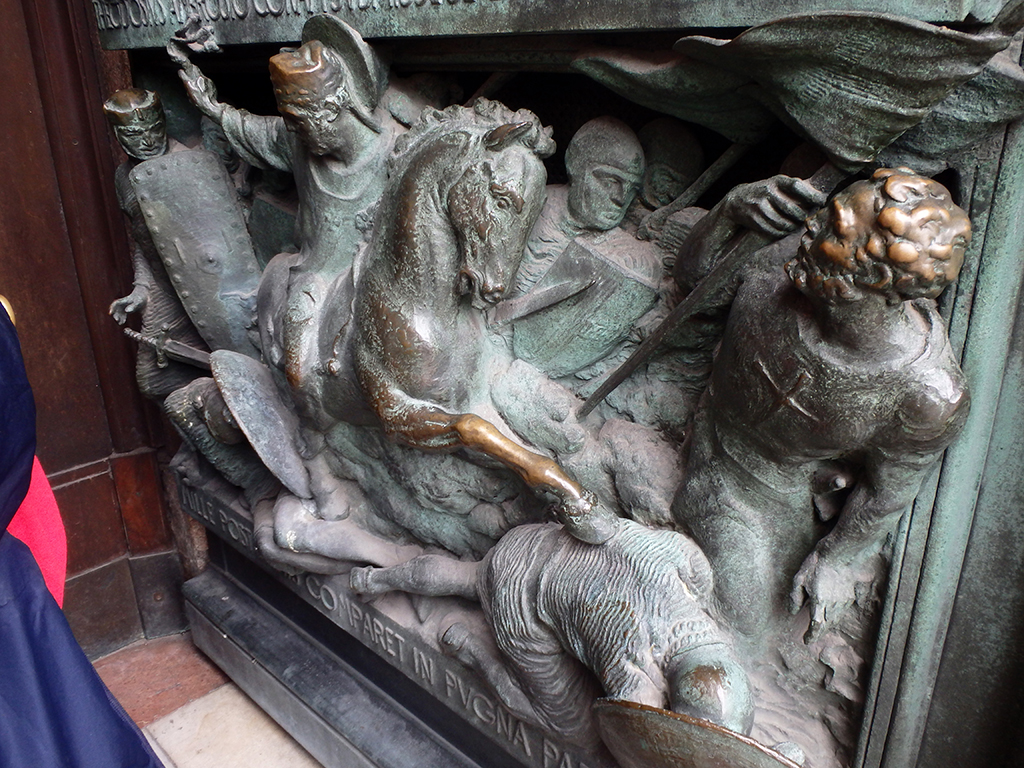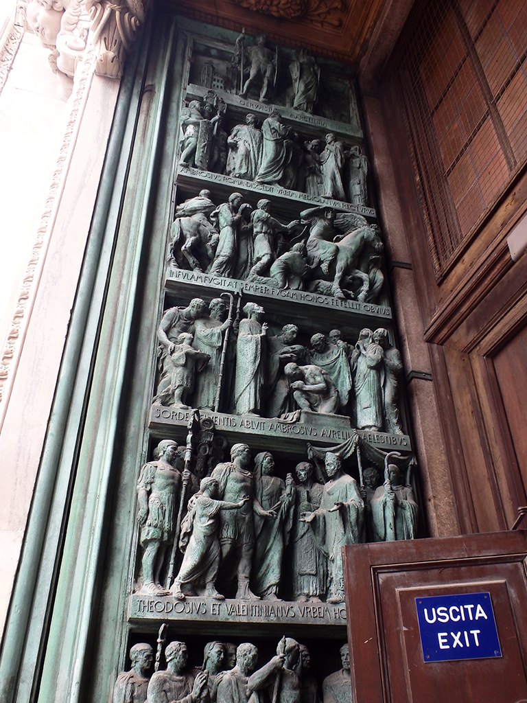 Ci-dessus, le reliquaire d’un évêque béatifié, la statue de St Barthélemy, martyr écorché, le reliquaire contenant les restes de St Charles et le baptistère de la basilique Santa Tecla du 4ème siècle. Le duomo a été construit à l’emplacement de l’ancienne basilique.