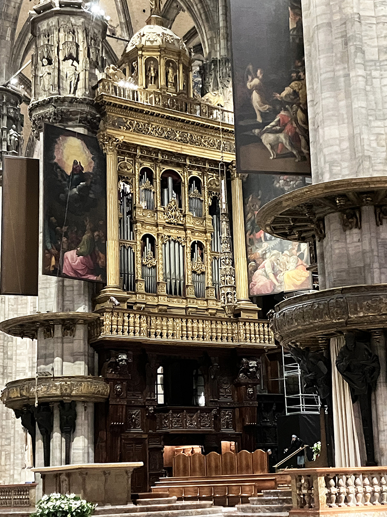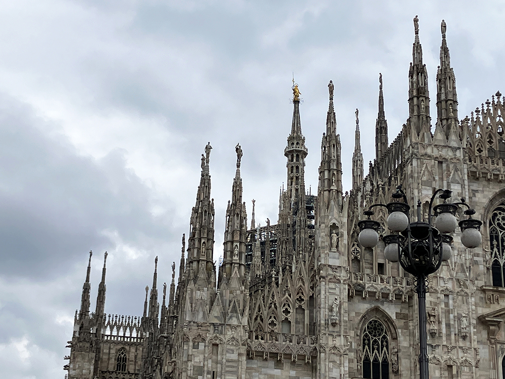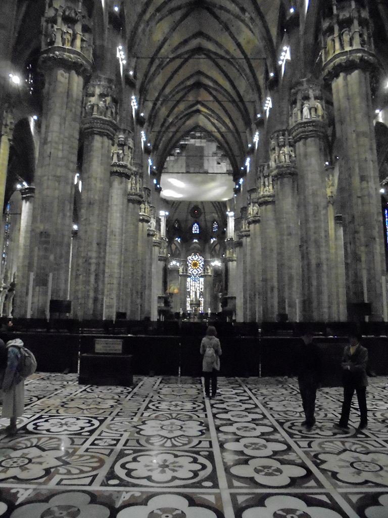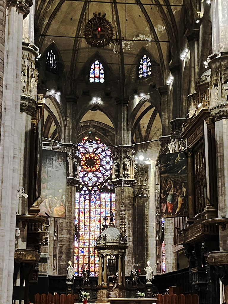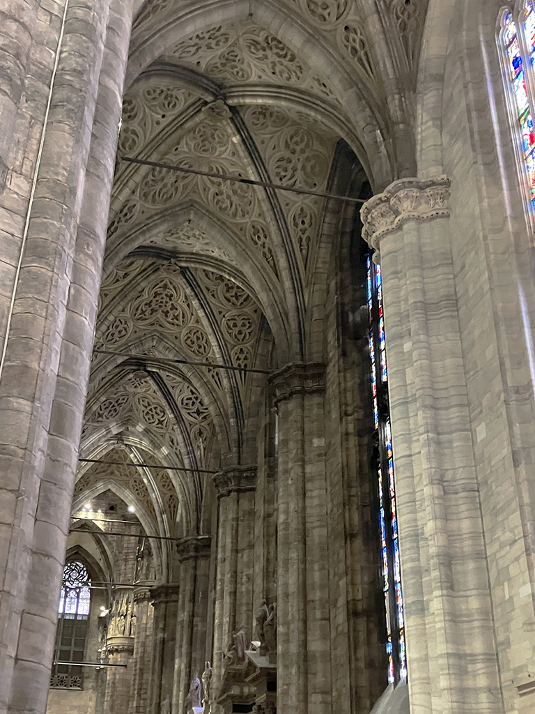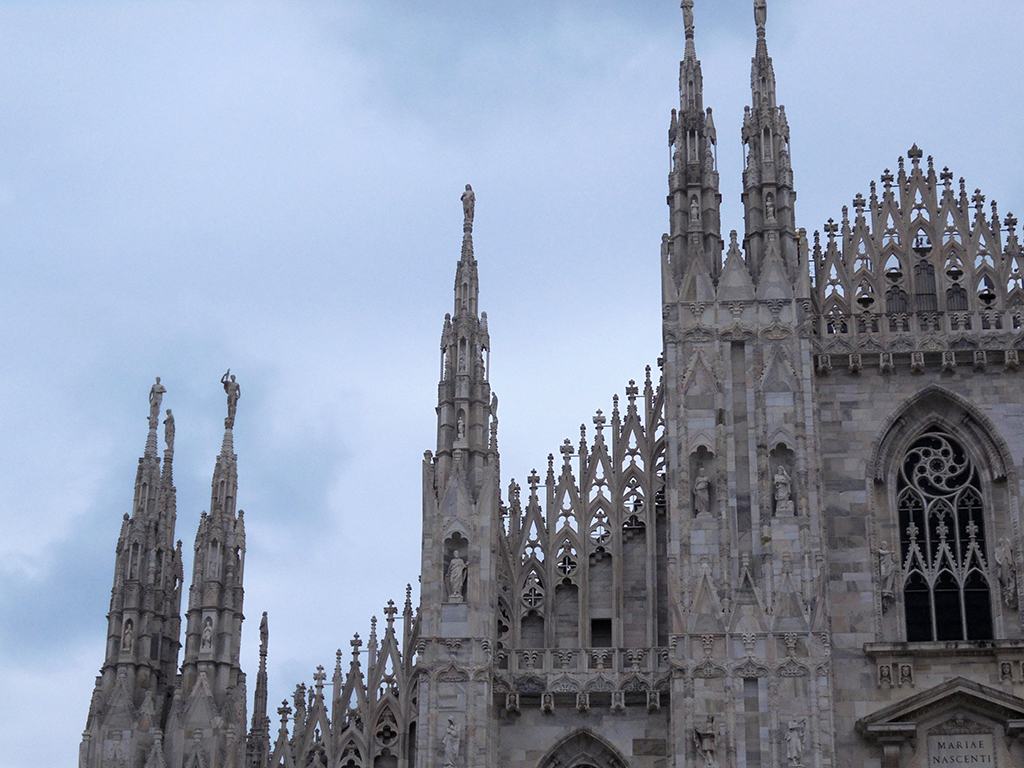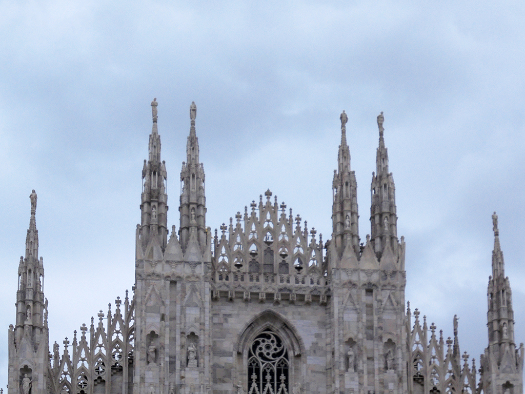 L’extérieur est incroyable. Commencée en 1386, elle fut achevée en 1809 sur ordre de Napoléon. Son style gothique flamboyant porte bien son nom. Surmontée de clochetons, de statues, de pinacles, on ne sait où donner de la tête. Le guide annonce plusieurs milliers de statues. C’est si riche en ornements que s’en est presque écrasant. Je pense qu’il faut vivre à Milan et tous les jours passer devant pour un jour pouvoir tout appréhender. Des échafaudages sur le tour du duomo nous ont empêchés d’admirer les côtés.