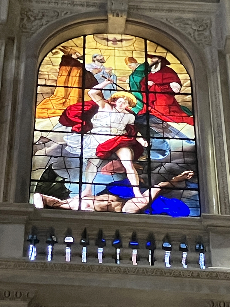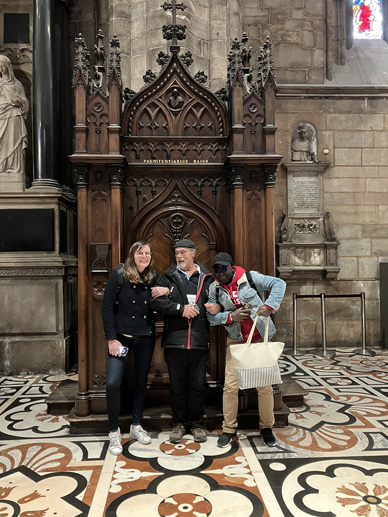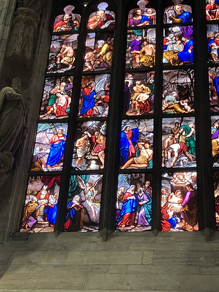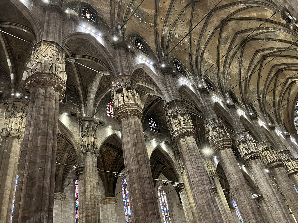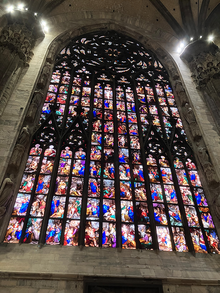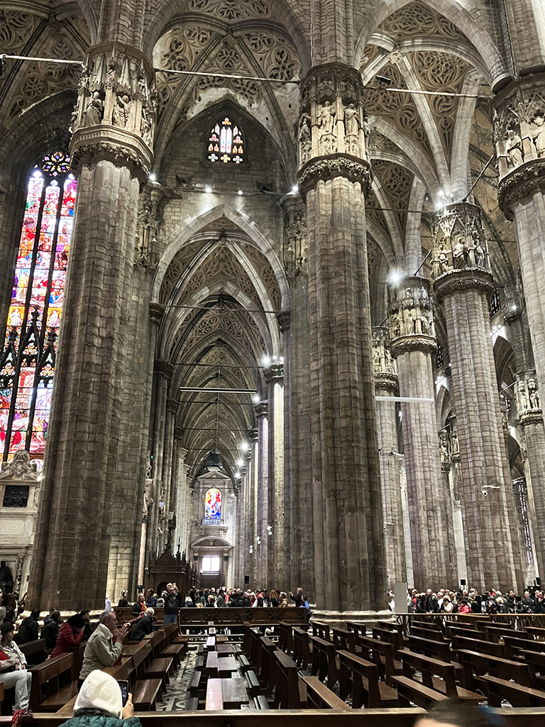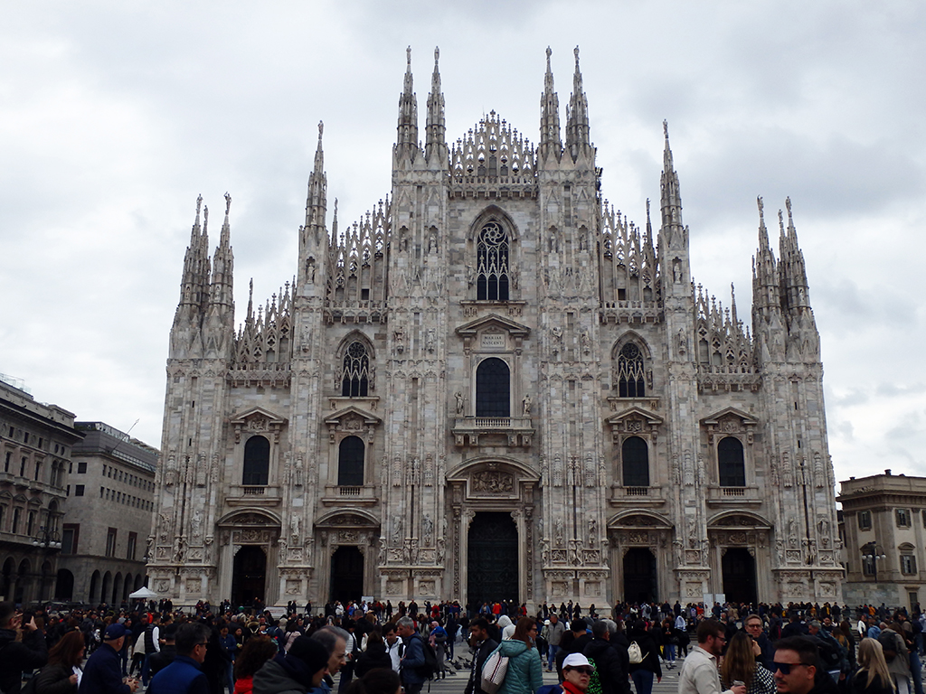 Aire de camping-car, tramway, métro, nous voilà arrivés mais sans billet. On s’installe dans la queue d’une vingtaine de mètres et on patiente. Un agent du tourisme vient à notre rencontre et nous indique un autre guichet. Soit, on part et là chance, juste une dizaine de personnes devant nous. Armés des billets, nous repartons attendre dans une autre queue pour entrer dans le duomo. Second coup de chance, ils ouvrent la deuxième porte juste devant nous ! En un rien de temps, nous voilà à l’intérieur.