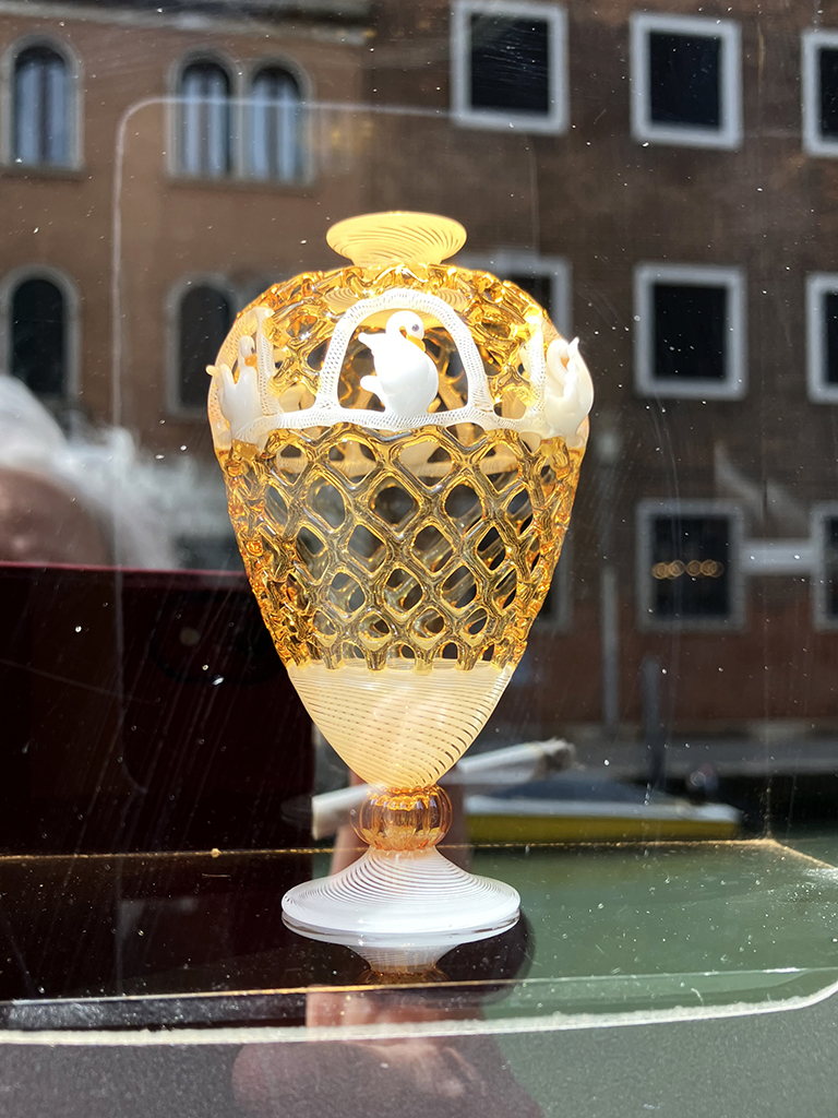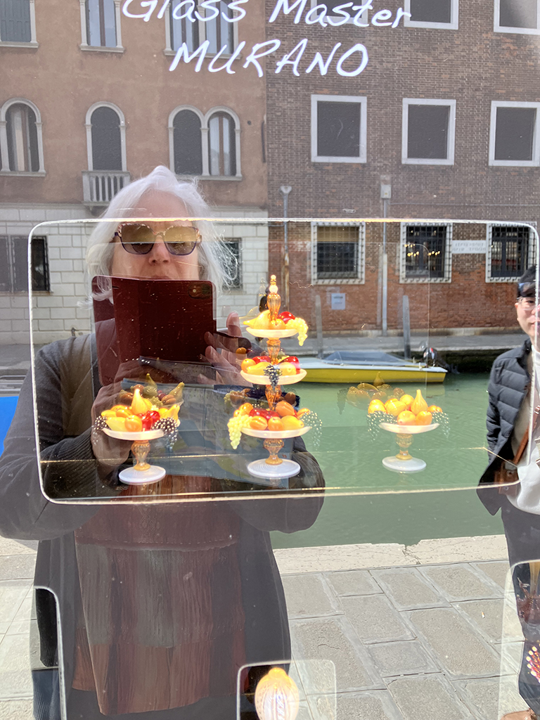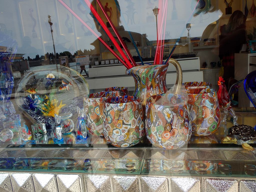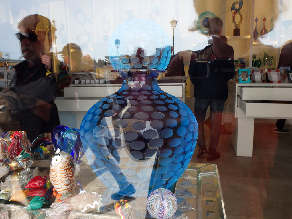 Je dois avouer que le style « Murano » en matière de verrerie ne me plait pas plus que cela. Je reconnais l’immense savoir-faire mais peu d’éléments ont soulevé mon admiration. Evidemment, nous ne sommes pas entrés dans les galeries. La plupart étaient étroites, avec des marches intérieures et circuler avec un fauteuil au milieu de pièces à plusieurs milliers d’euros, ça craint. Nous nous sommes contentés de lécher les vitrines. Certaines de maîtres verriers étaient magnifiques, des réalisations tout en finesse. Prendre des photos était compliqué au travers des vitrine. Alors, vous ne verrez pas grand chose. Venez vous faire une idée vous même.