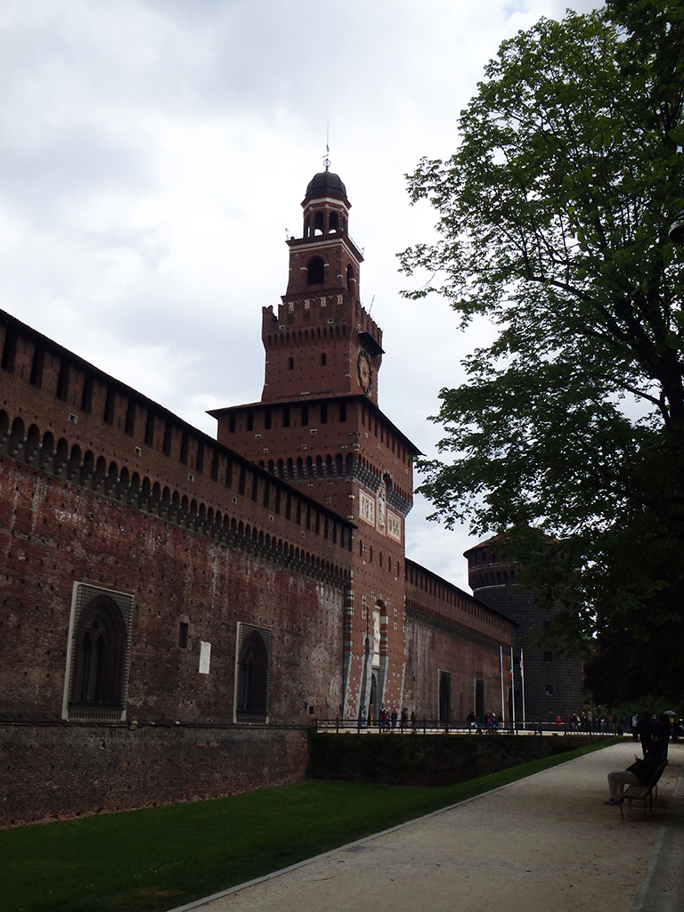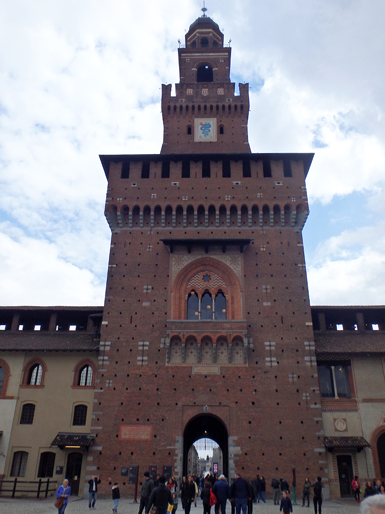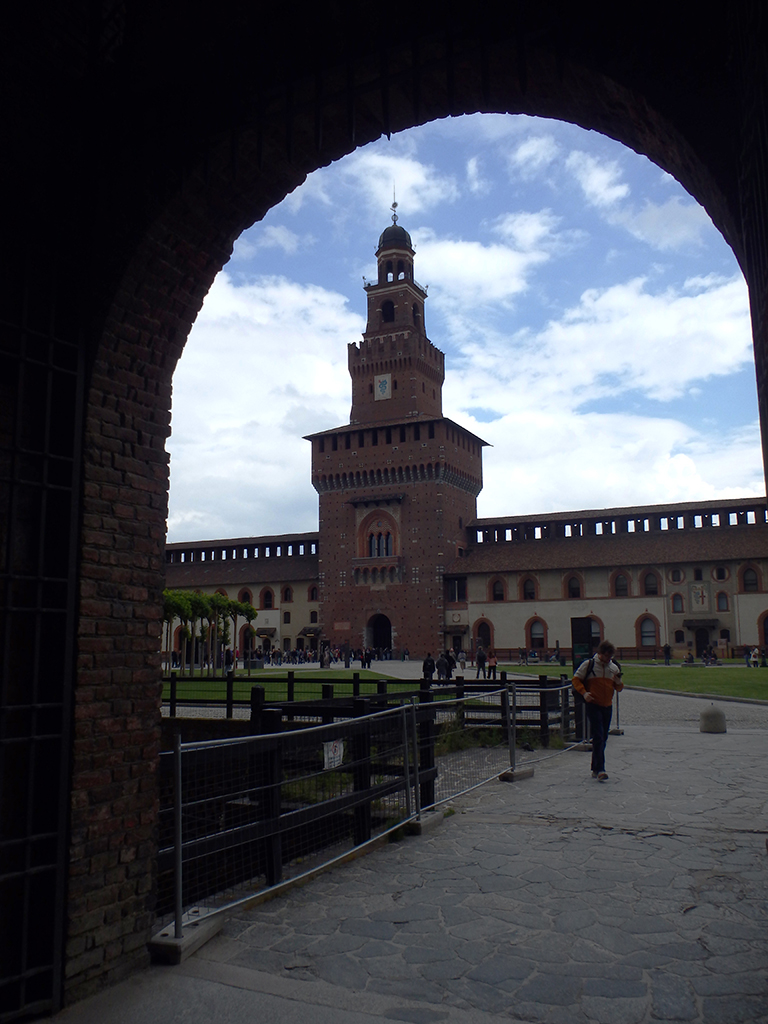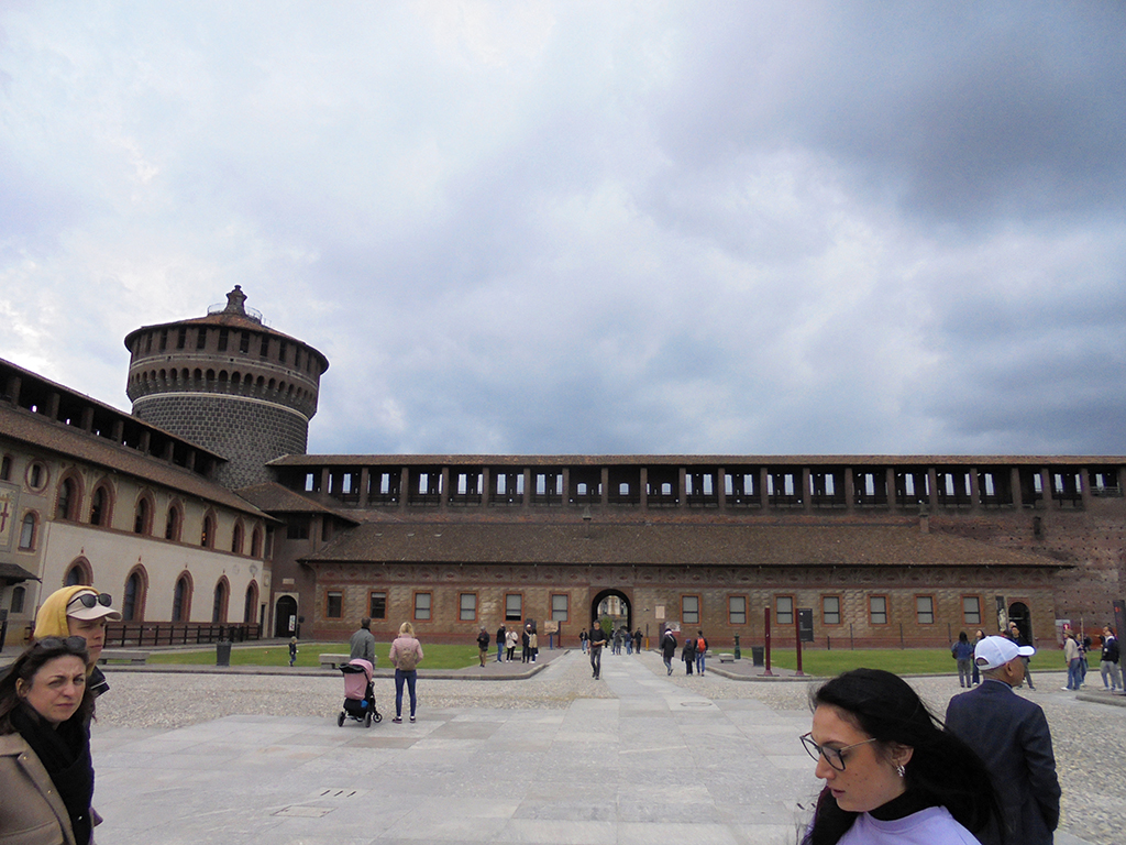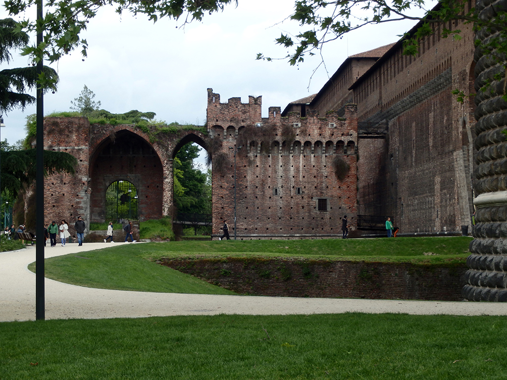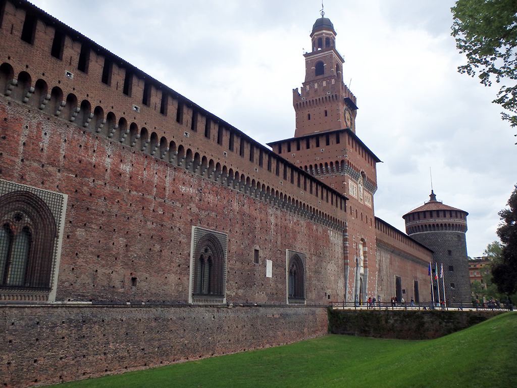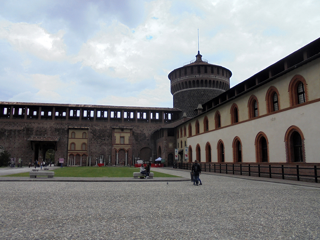 Ce château est impressionnant ! D’abord, il est très bien conservé. Ensuite, il est entouré d’un espace vert sur trois côtés et d’un joli parc sur le quatrième. Nulle construction accolée pour atténuer l’effet d’immensité de ce castello. Quadrilatère de 200m de côté, en briques sur fondations de pierres, construit à partir de 1450 pour les Visconti, deviendra résidence des ducs de Milan ,les Sforza.