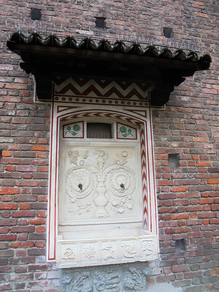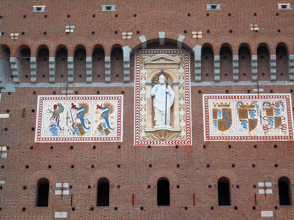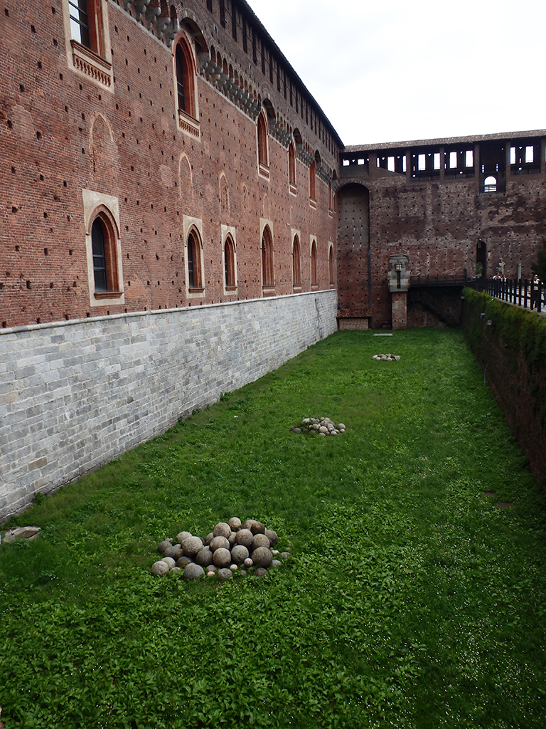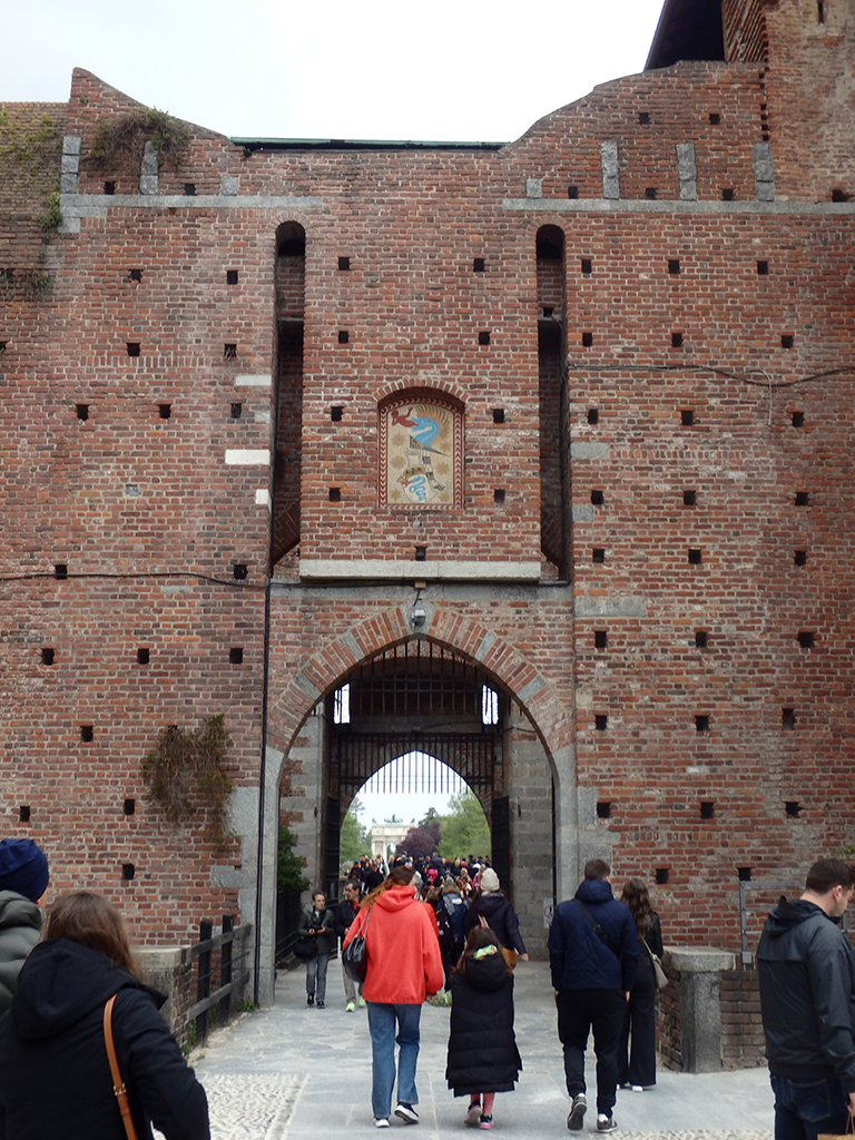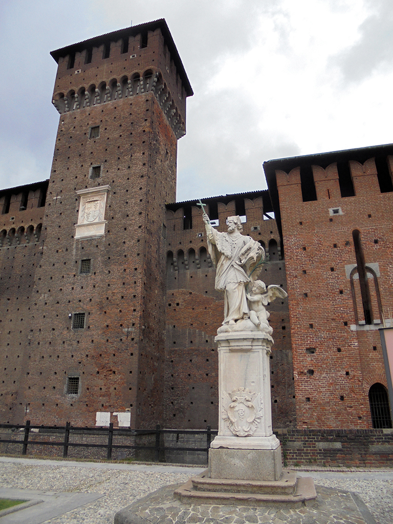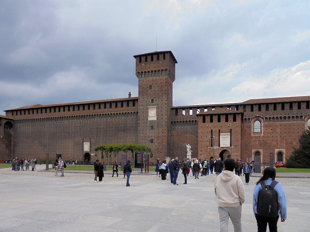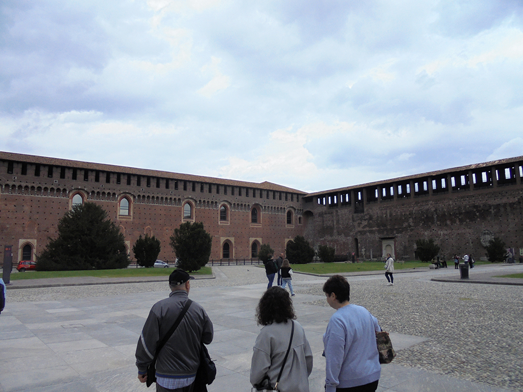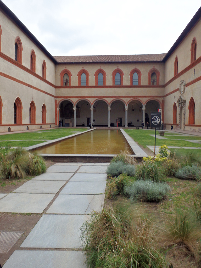 Ce château est impressionnant ! D’abord, il est très bien conservé. Ensuite, il est entouré d’un espace vert sur trois côtés et d’un joli parc sur le quatrième. Nulle construction accolée pour atténuer l’effet d’immensité de ce castello. Quadrilatère de 200m de côté, en briques sur fondations de pierres, construit à partir de 1450 pour les Visconti, deviendra résidence des ducs de Milan ,les Sforza.