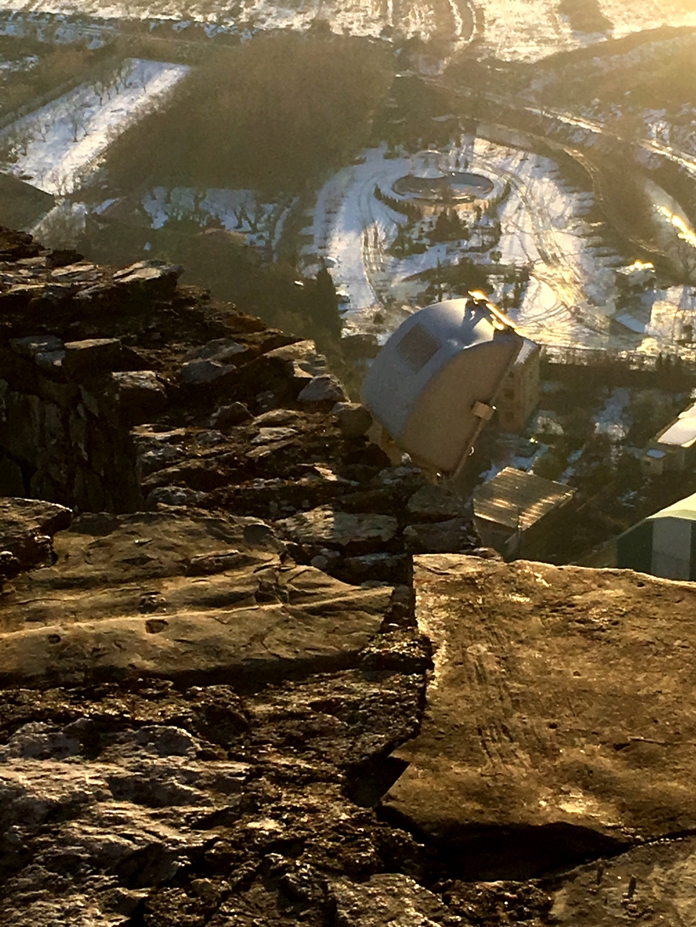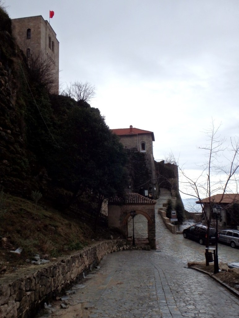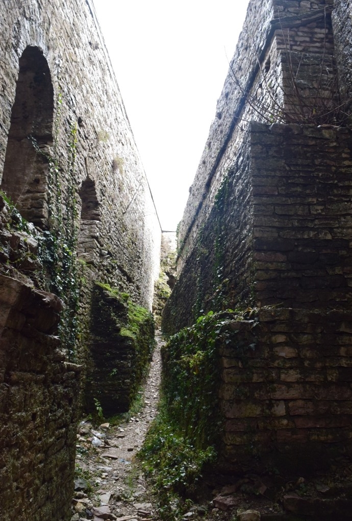Nous avons la mauvaise surprise de voir que Bidouille n’a pas le droit de monter au château. Qu’importe, on le laisse au bord de la rivière et armé de notre tablette avec l’application Pocket Earth (merci Franck !) nous partons à l’assaut du château. Le chemin d’accès ressemble plus à une grande rigole pour évacuer les eaux de pluie qu’à un chemin. Pendant un moment, on s’est demandé pourquoi on s’infligeait une telle ascension … Mais un site classé au patrimoine de l’humanité, ça mérite des efforts …. je vous laisse juge.