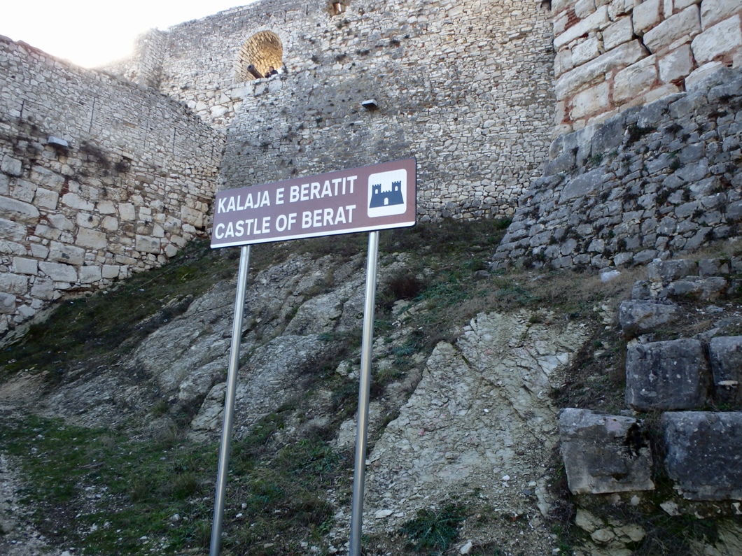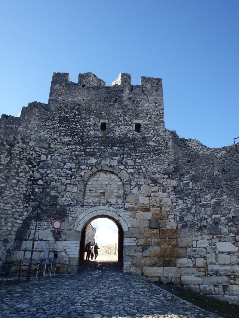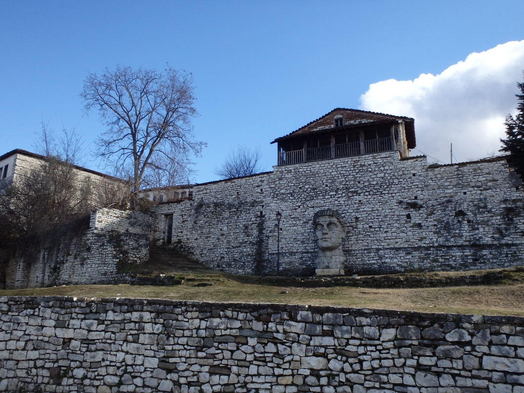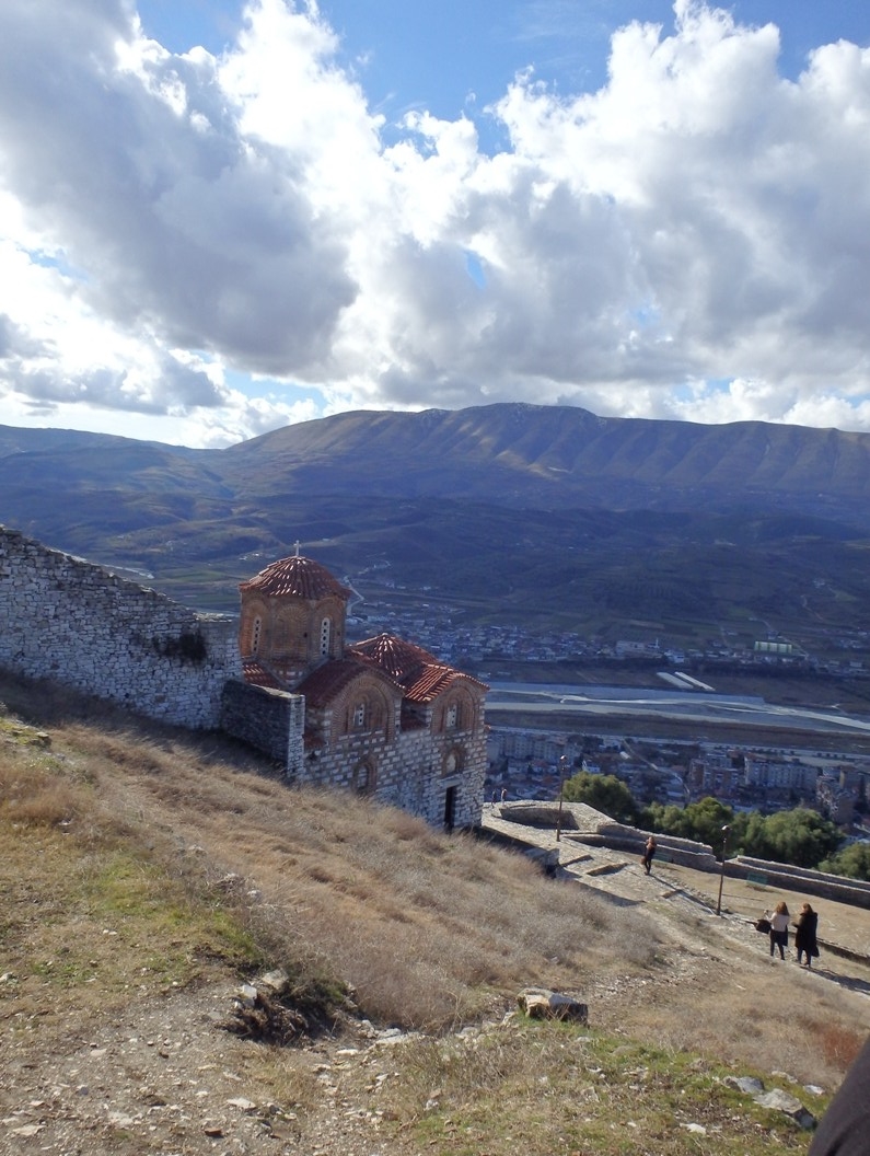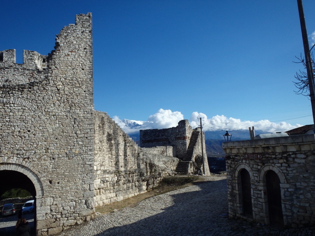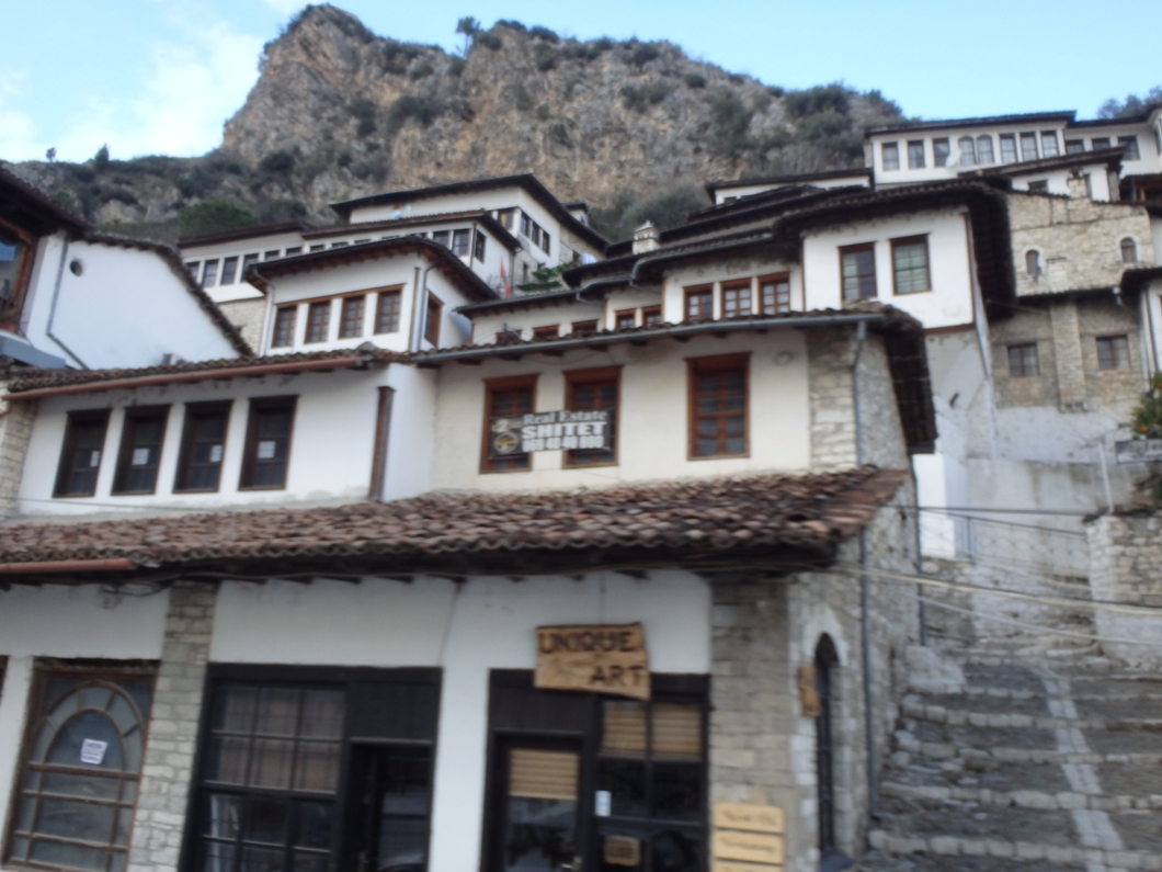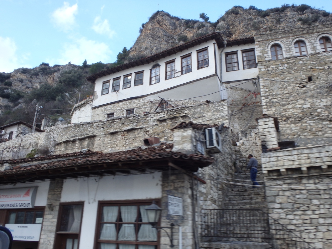 Le soleil est revenu. Nous cheminons tranquille sur des routes toutes nouvelles . La circulation est clairsemée mais nécessite une attention de tout instant. Chaque véhicule est un taxi potentiel qui s’arrête pour déposer ses passagers, n’importe où …. Mais Jeff, comme à son habitude s’en sort très bien. Nous arrivons à Bérat. La ville aux 1000 ou 10000 fenêtres je ne sais plus. C’est joli, la rivière, plutôt marron, traverse la ville.