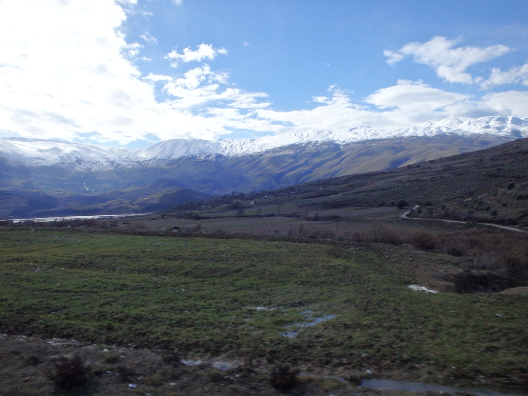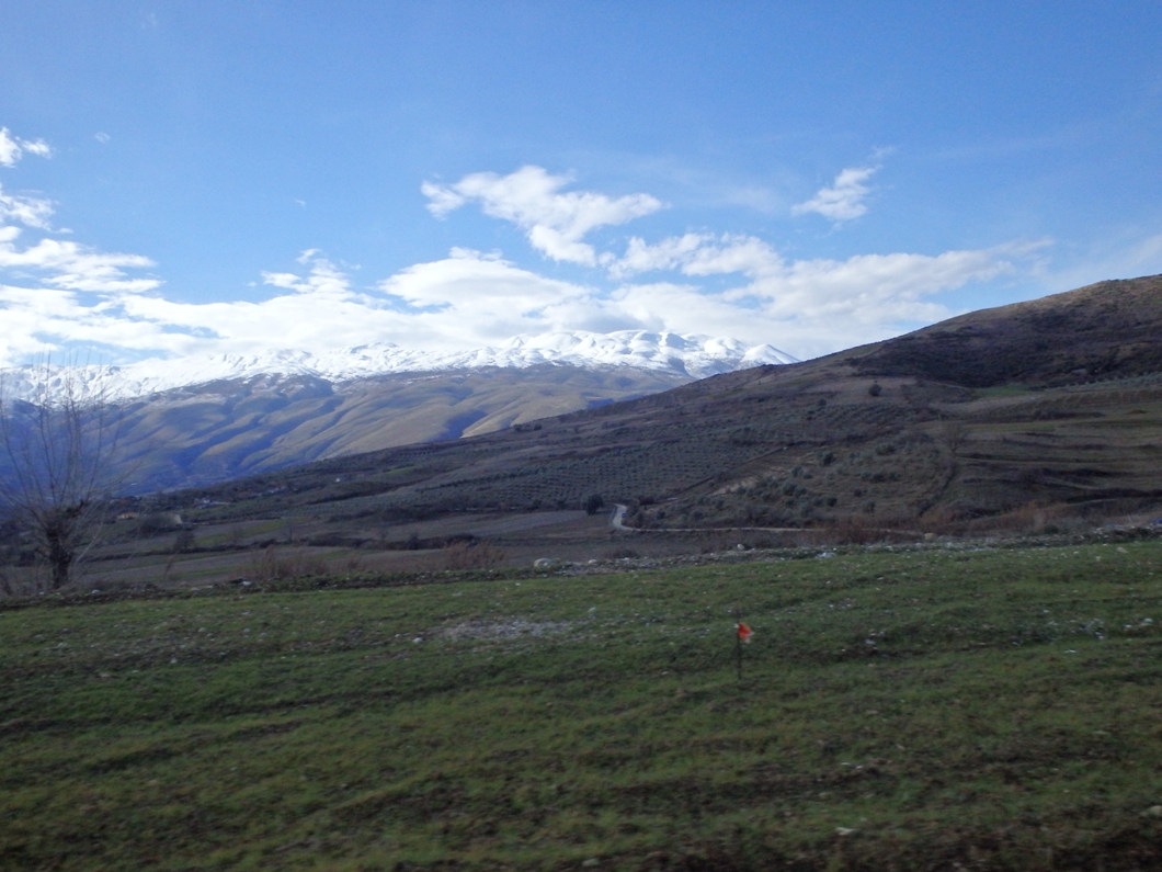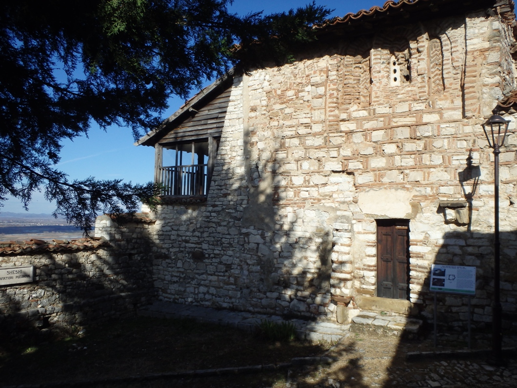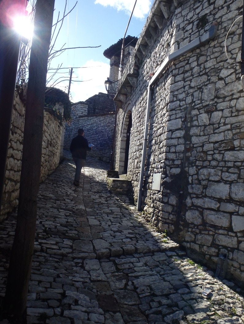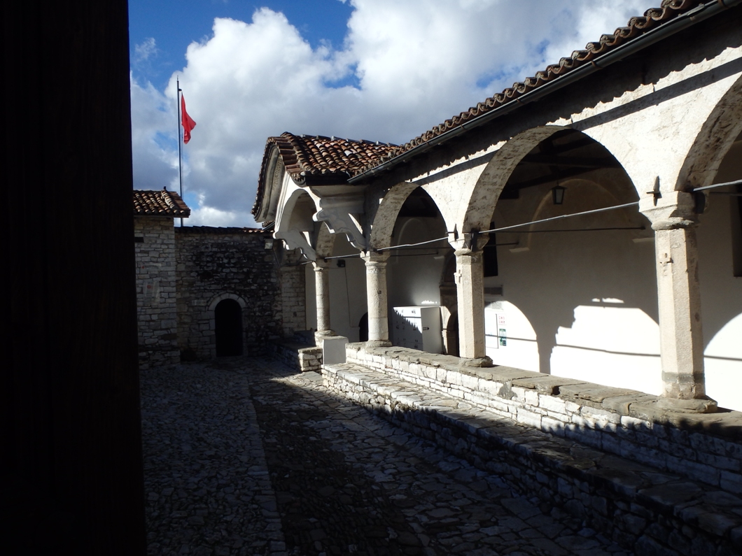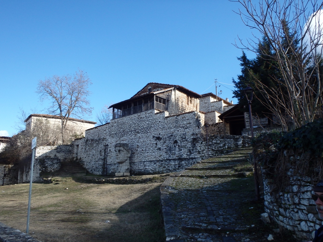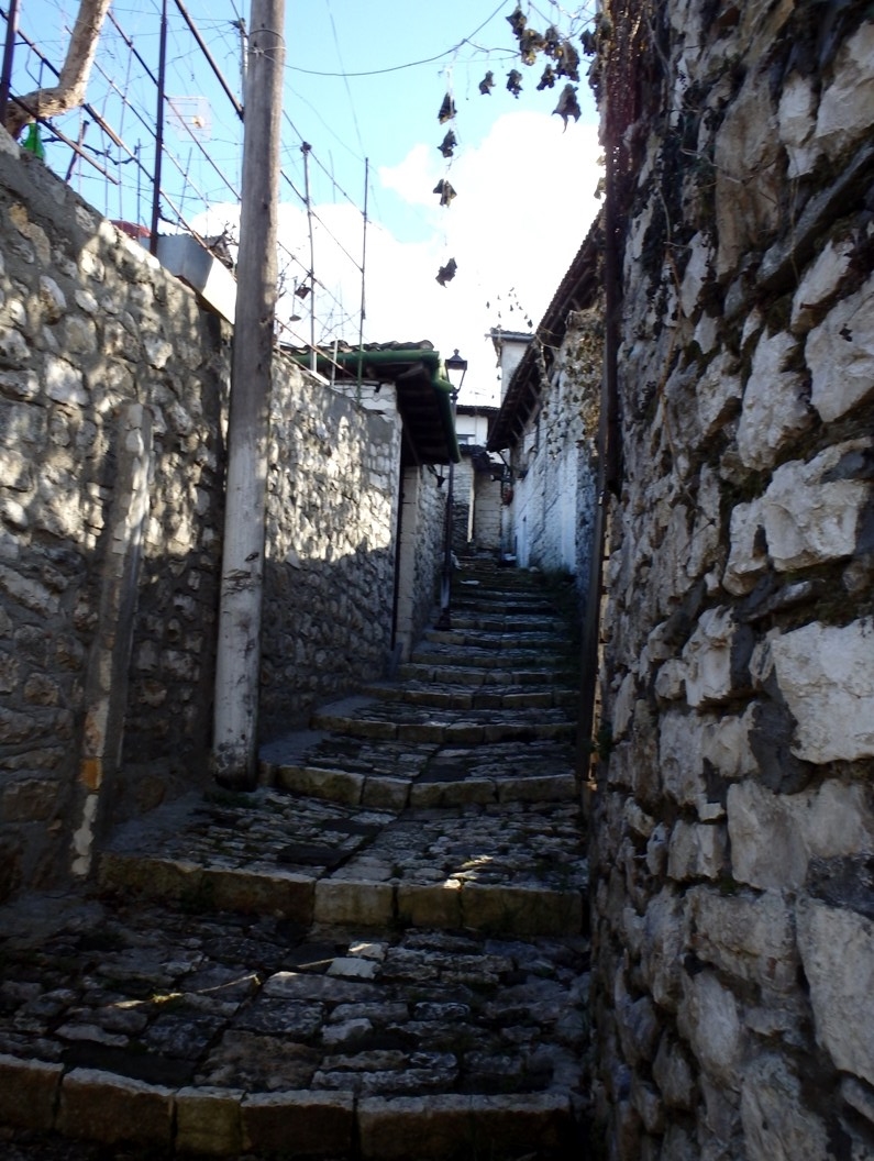 Le soleil est revenu. Nous cheminons tranquille sur des routes toutes nouvelles . La circulation est clairsemée mais nécessite une attention de tout instant. Chaque véhicule est un taxi potentiel qui s’arrête pour déposer ses passagers, n’importe où …. Mais Jeff, comme à son habitude s’en sort très bien. Nous arrivons à Bérat. La ville aux 1000 ou 10000 fenêtres je ne sais plus. C’est joli, la rivière, plutôt marron, traverse la ville.