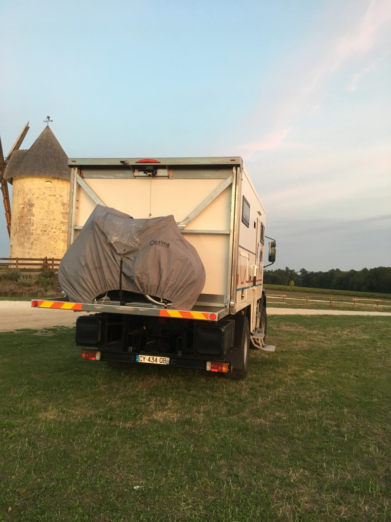 Le positif, nous avons reçu la carte grise de Bidouille et nos permis internationaux. Le porte-vélo est installé sur la plate-forme arrière du camion. J’ai eu un beau vélo à assistance électrique pour mon anniversaire. Le moteur pour installer l’assistance électrique sur le vélo de Jeff est également arrivé.
