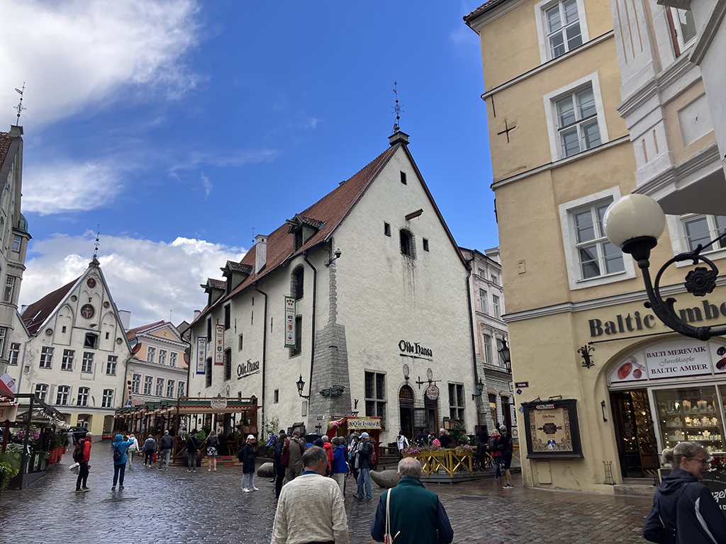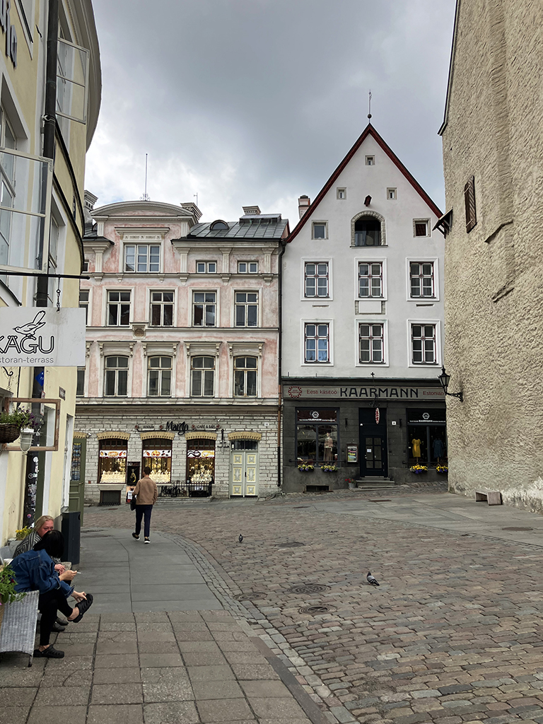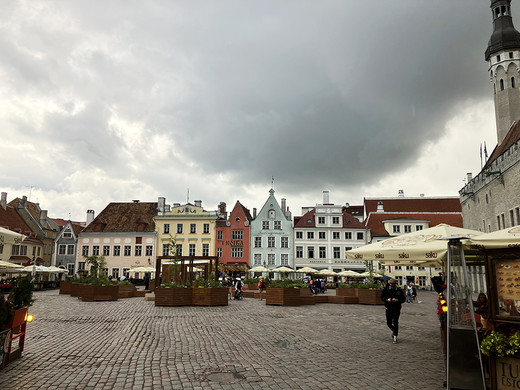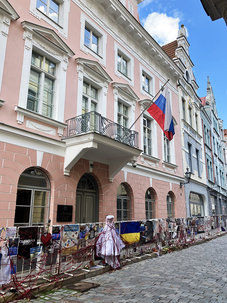 La grande place avec le bâtiment de la Grande Guilde. Là aussi, on se contentera de l’extérieur. La place est très agréable. On y trouve des banquettes en bois pour se prélasser. Là, une belle averse nous a surpris alors nous n’avons pas testé. J’ai acheté dans un magasin d’accessoires de pêche, des ponchos très fins en plastique transparent. Pas sexy pour un sou mais aujourd’hui, nous les avons inaugurés 🙂 Nous avons vu un restaurant qui proposait de la cuisine médiévale dans un décor approprié. Il y avait de la viande d’ours à la carte. Les tarifs n’avaient rien de médiévaux eux. Malgré ma passion pour cette période d’histoire, nous avons continué notre chemin pour nous arrêter dans un restaurant russe. Ici, toutes les cartes, pancartes et inscriptions officielles sont en russe en dessous de l’estonien. C’est dire l’importance de la communauté russe . Celle-ci, à son corps défendant, sert d’excuse à Poutine pour lorgner sur l’Estonie. Le personnel du restaurant russe arborait un ruban aux couleurs de l’Ukraine. Devant l’ambassade de Russie, des barrières servent de support aux photos des opposants politiques assassinés, avec des slogans anti-guerre.