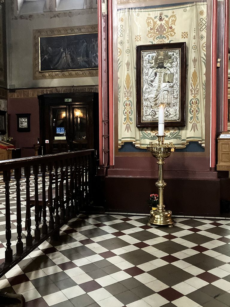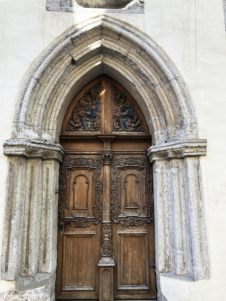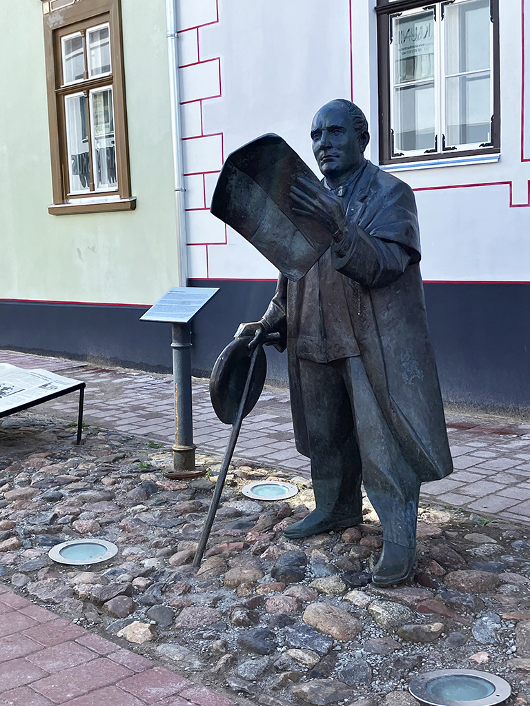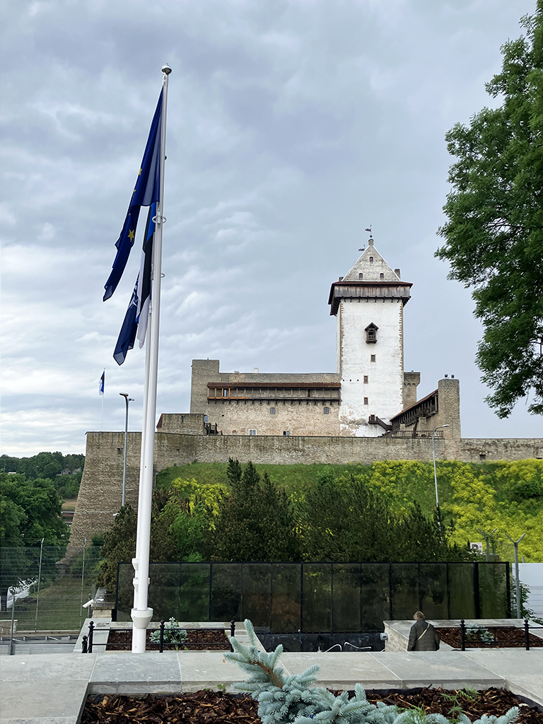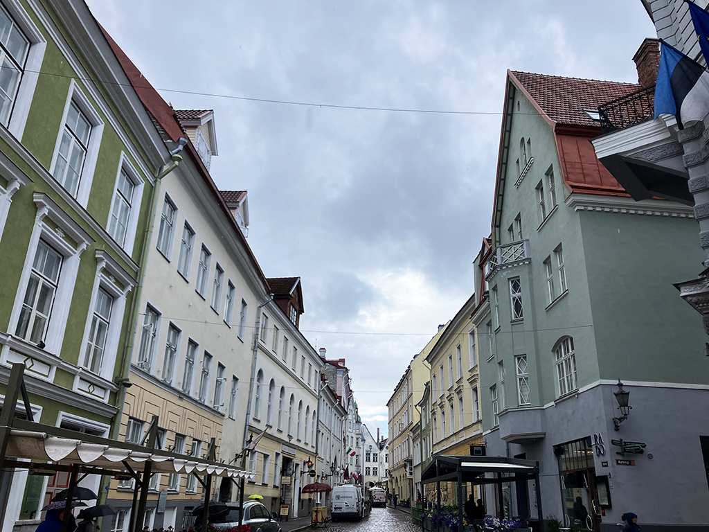 La grande place avec le bâtiment de la Grande Guilde. Là aussi, on se contentera de l’extérieur. La place est très agréable. On y trouve des banquettes en bois pour se prélasser. Là, une belle averse nous a surpris alors nous n’avons pas testé. J’ai acheté dans un magasin d’accessoires de pêche, des ponchos très fins en plastique transparent. Pas sexy pour un sou mais aujourd’hui, nous les avons inaugurés 🙂 Nous avons vu un restaurant qui proposait de la cuisine médiévale dans un décor approprié. Il y avait de la viande d’ours à la carte. Les tarifs n’avaient rien de médiévaux eux. Malgré ma passion pour cette période d’histoire, nous avons continué notre chemin pour nous arrêter dans un restaurant russe. Ici, toutes les cartes, pancartes et inscriptions officielles sont en russe en dessous de l’estonien. C’est dire l’importance de la communauté russe . Celle-ci, à son corps défendant, sert d’excuse à Poutine pour lorgner sur l’Estonie. Le personnel du restaurant russe arborait un ruban aux couleurs de l’Ukraine. Devant l’ambassade de Russie, des barrières servent de support aux photos des opposants politiques assassinés, avec des slogans anti-guerre.