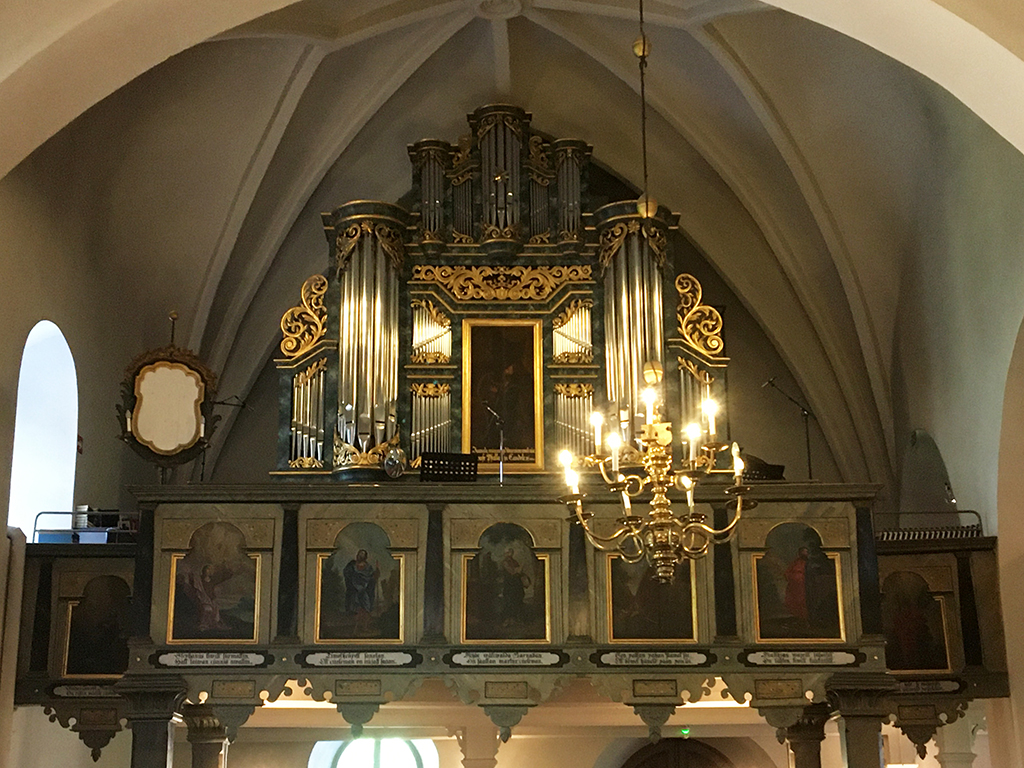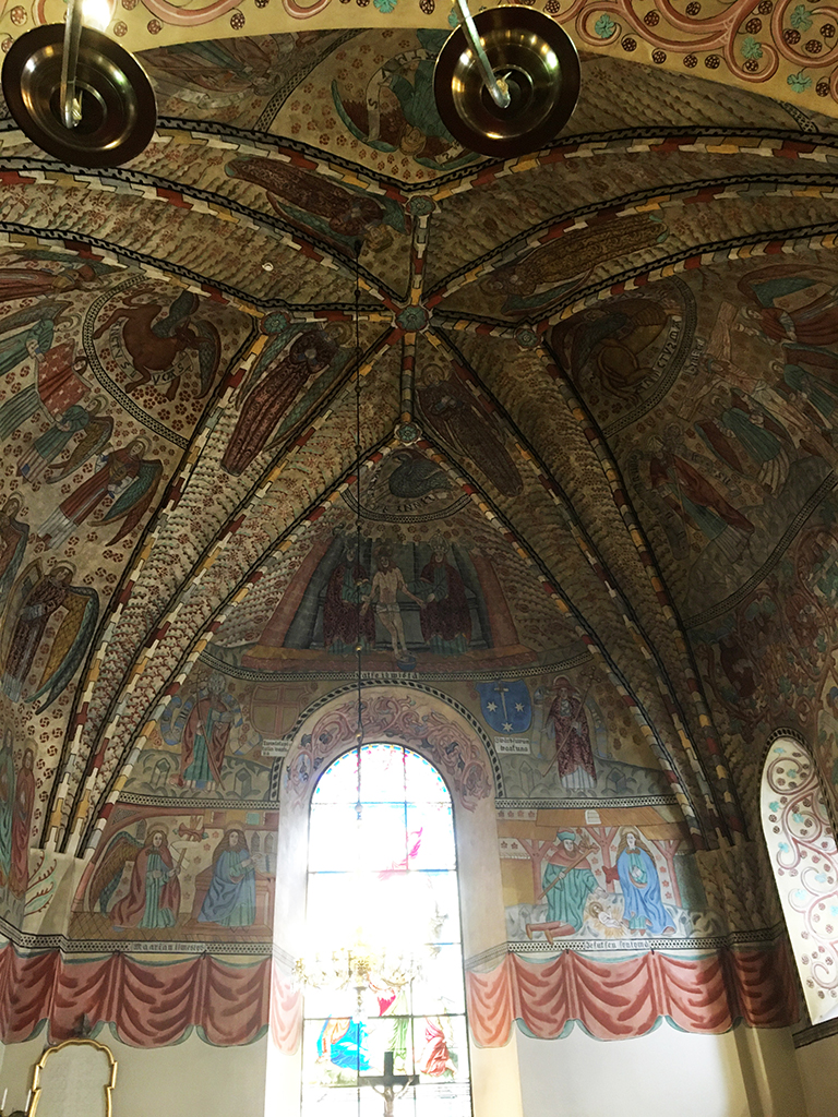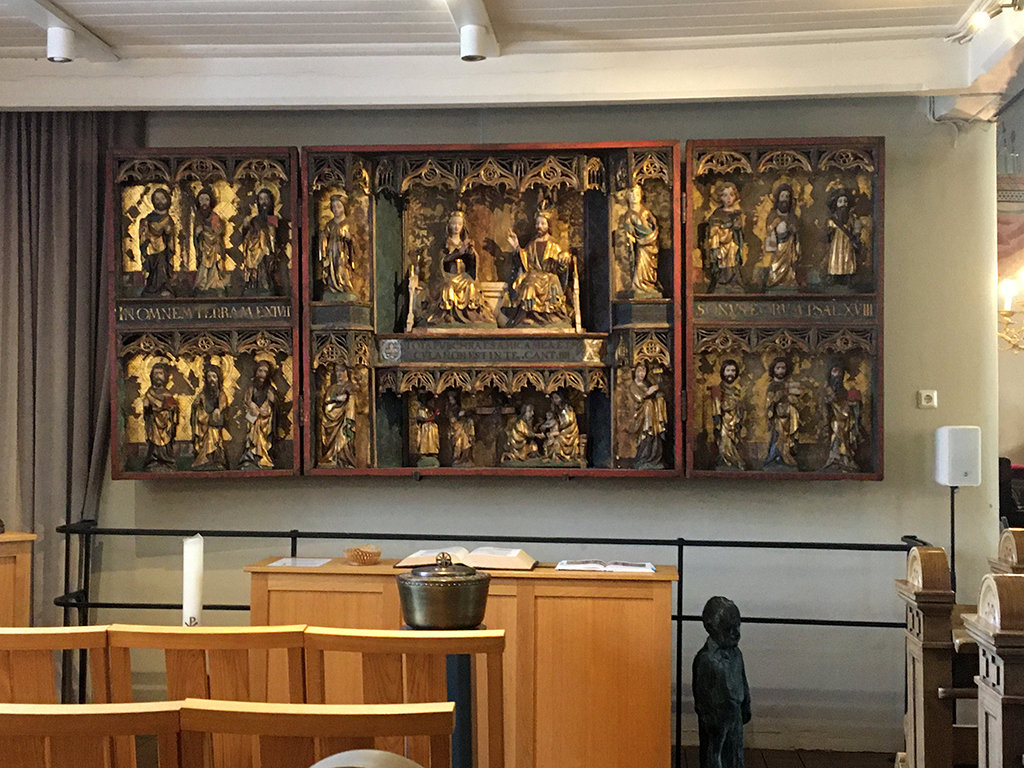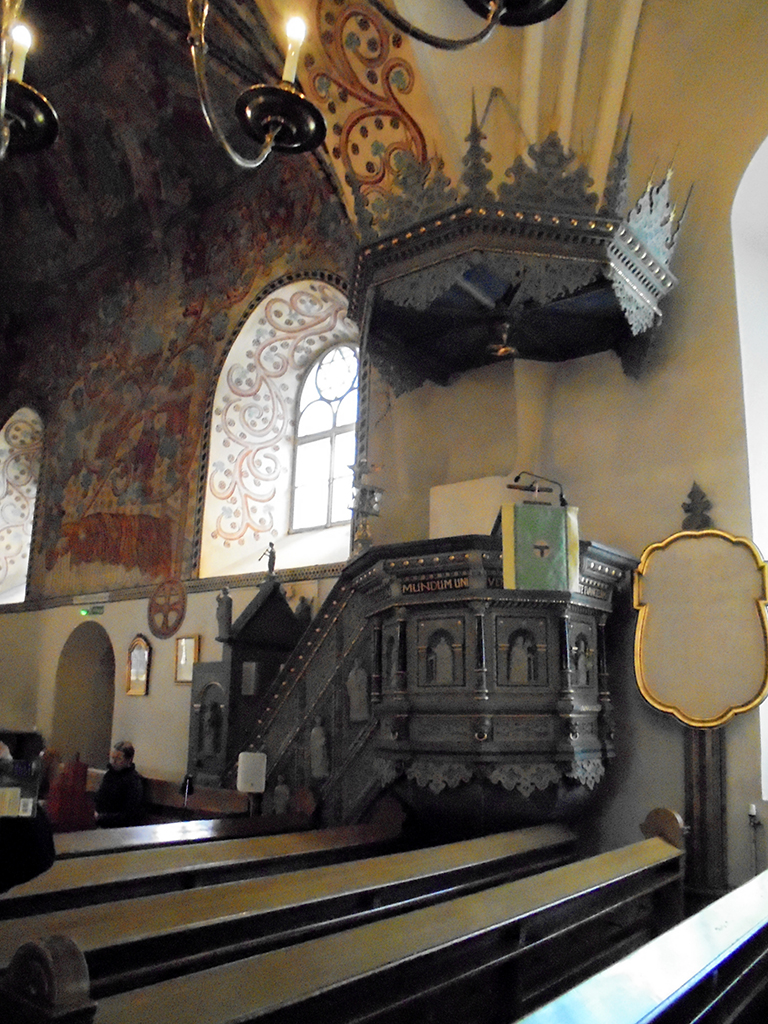 Un autre lieu réputé est l’église de la Sainte Croix. J’ai essayé d’en retracer l’histoire mais les traductions par ordinateurs donnent parfois des textes décalés ou abscons. Plutôt que dire des âneries, je ne dirai rien. L’église actuelle a été consacrée le 14/9/1512, catholique et est devenue luthérienne en 1640. La chaire est un exemple Renaissance de sculpture sur bois . Les peintures autour du chœur sont médiévales. L’orgue date de 1784 et le lustre de 1648. Le triptyque a été fabriqué en Prusse en 1140 environ.