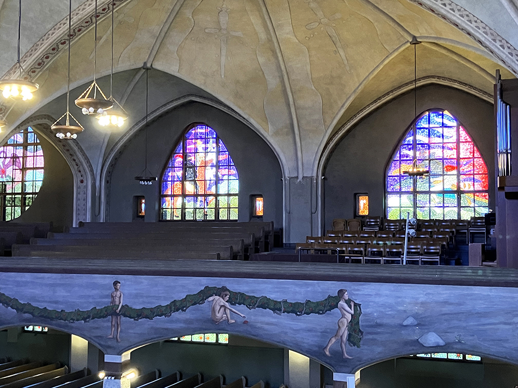 Eglise construite en 1960. Surnommée « le silo », nous avons eu du mal à croire que c’était une église. Mais en regardant bien, tout en haut, il y a un « clocher », à l’intérieur de croix imbriquées. Bon, faut chercher quand même. Nous n’avons pas pu voir l’intérieur.