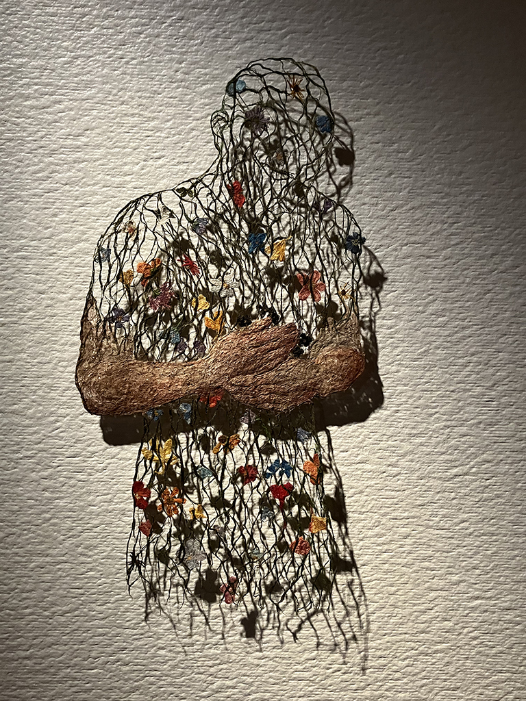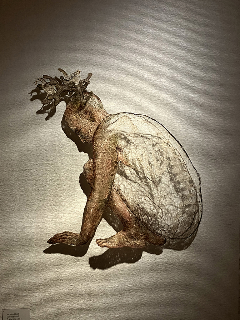 Le travail de cette artiste nous a beaucoup plu. Son médium, c’est la laine, le lin etc… Elle ne peint pas par dessus, elle mélange les fibres pour arriver à la couleur requise et coud pour que les fibres ne bougent plus. Son nom : Raija Jokisen. Si elle expose en France, allez-y ! Le département du Finistère a réalisé un film chez cette artiste, il est diffusé dans le château. Ils sont partout ces bretons !!!