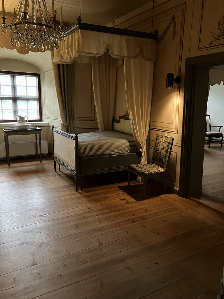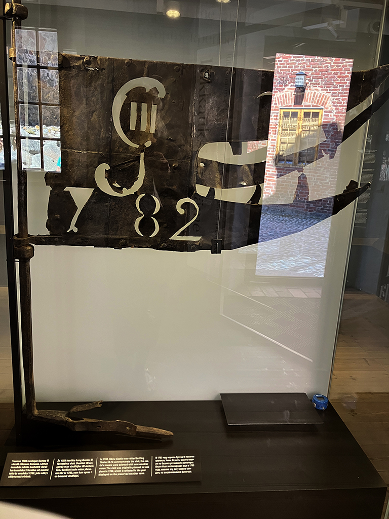 Cet oriflamme a une histoire cocasse. En 1782, le roi Gustav III de Suède doit visiter Häme. Le gouverneur fait fabriquer des oriflammes pour pavoiser le château. La lettre G III pour Gustav III et 82 pour l’année. Mais le voyage fut reporté et Gustav ne vint qu’en 83 ! L’histoire ne dit pas ce qu’il advint des oriflammes.