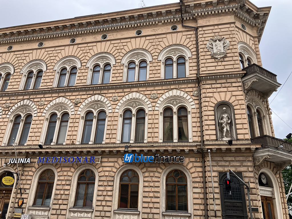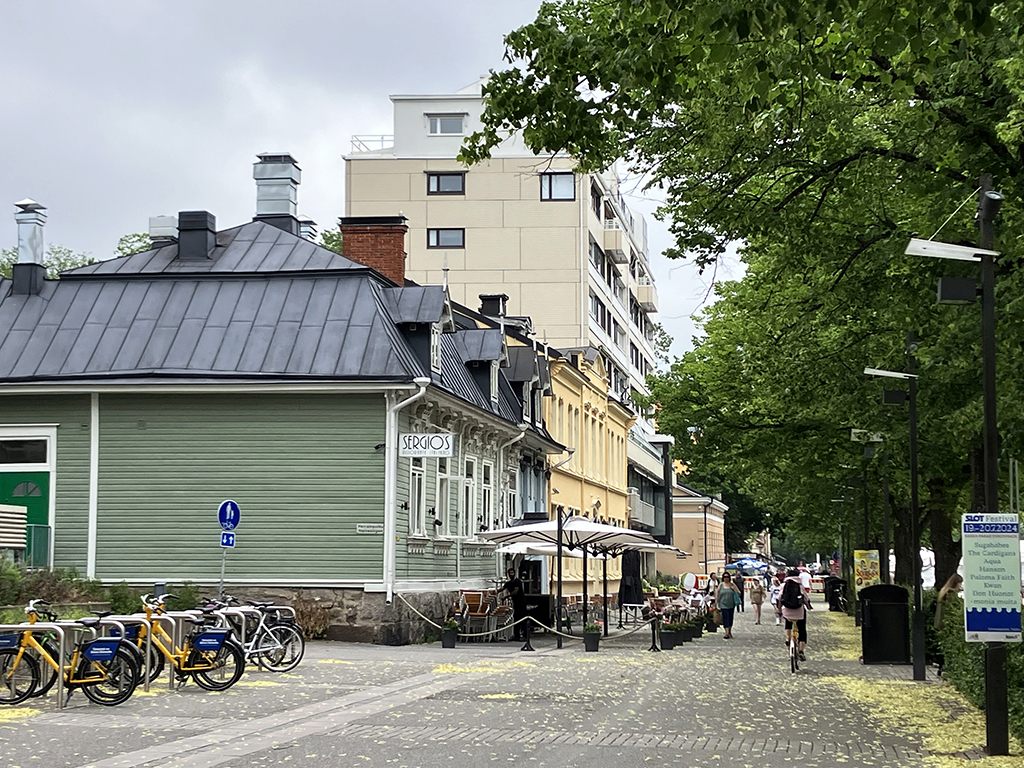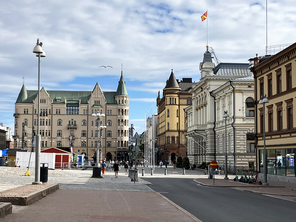 Rue Huvilakatu, réputée pour ses maisons coloréesBibliothèque OodiLa gare centraleVu le drapeau ukrainien ?Pavés + rails de tram, j’ai craintPlace du sénatAprès l’orgue, la fanfare !