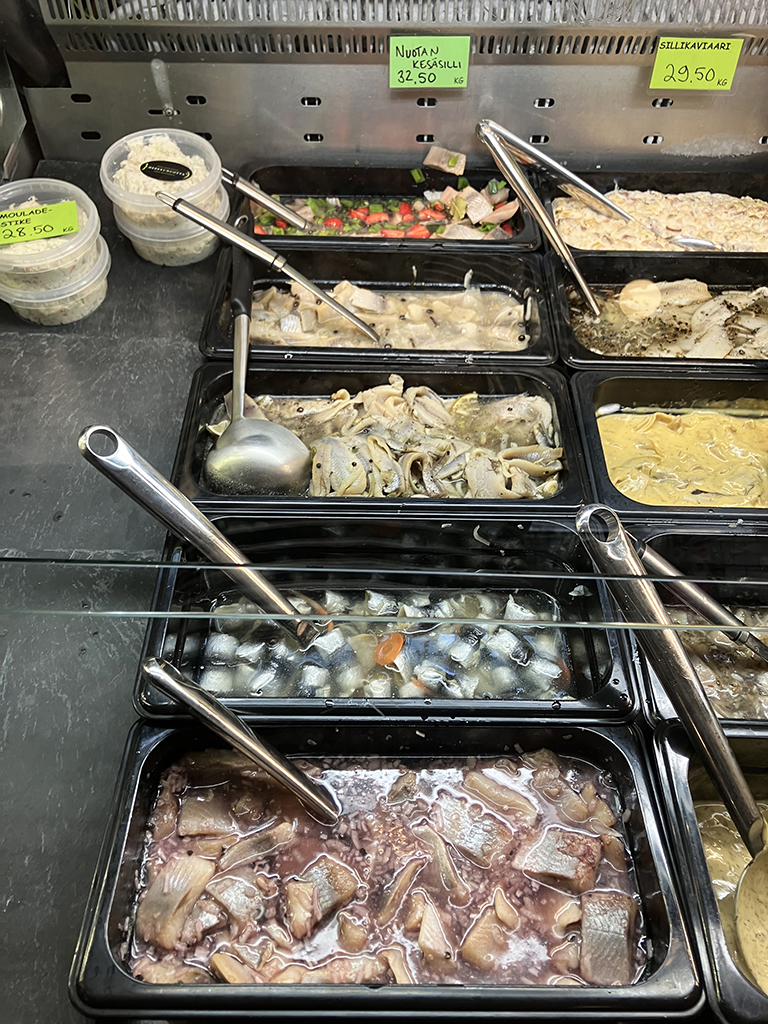 Sur l’étal du poissonnier, plusieurs sortes de harengs en marinade dont une avec des fraises. Bizarre ! Sinon, beaucoup de poissons fumés à des degrés divers.