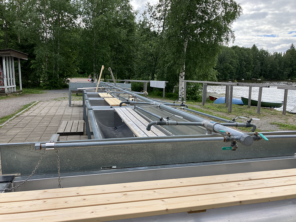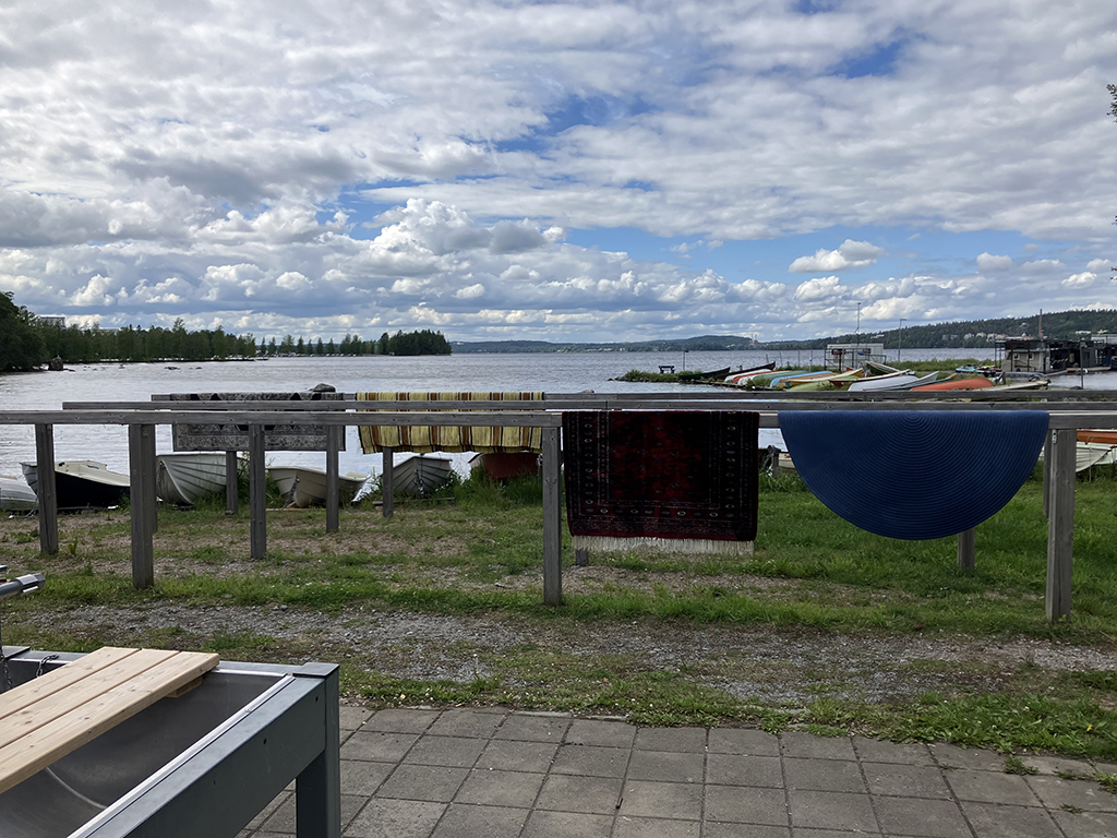 Notre spot : Nous étions au bord du lac. Il y avait une plage mais le vent froid m’a découragée de tester l’eau ! Une installation nous a interpellés : des grands bacs tout en longueur avec planches et robinets. Cela est à la disposition des habitants pour pouvoir nettoyer les tapis, il faut juste utiliser des produits biodégradables. A côté, une machine pour essorer et de robustes supports en bois pour laisser sécher. J’ai trouvé cette installation vraiment pratique et de nombreuses personnes sont venues les utiliser. Il y en a beaucoup en Finlande.