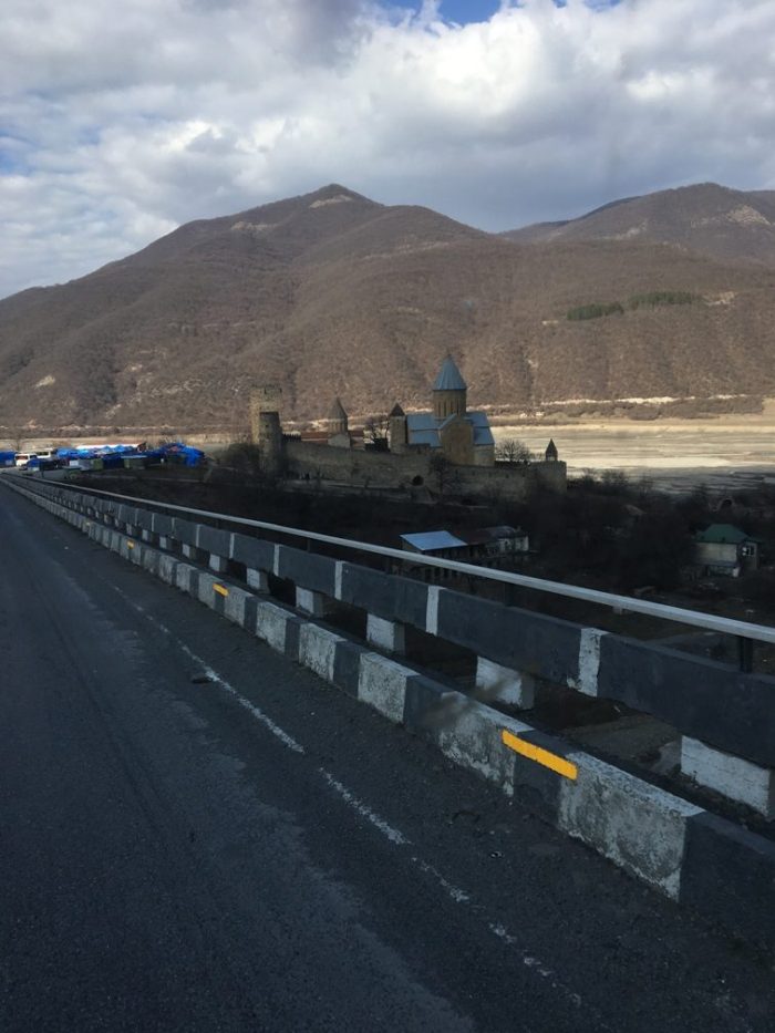 Le lendemain matin, nous attaquons la centaine de kilomètres qui nous séparaient de la frontière. Déjà la veille, nous avions remonté sur des kilomètres une file de camions arrêtés sur le bas côté quand ce n’était pas sur la route. Dans la matinée, cela a recommencé. Nous avons compris pourquoi plus loin quand nous avons attaqué la montée sur le col situé à 2395m. La route étroite, défoncée, entre deux murs de neige de 1.5 m ne permettait que difficilement les croisements de deux camions. La circulation était donc alternée mais sur plusieurs heures. Les paysages étaient sublimes. Le grand Caucase est magnifique mais quel stress à la descente. Il y a plusieurs tunnels en ogive, dont on ignore la longueur, sans lumière, sans aération et où pour le coup le croisement était impossible à cause de la hauteur sur les côtés. Pas de feux de signalisation, donc l’entrée dans le tunnel se faisait après observation de la circulation dans les lacets suivants. Cela tenait de la roulette russe. On a respiré bien fort quand la série de tunnel s’est interrompue.