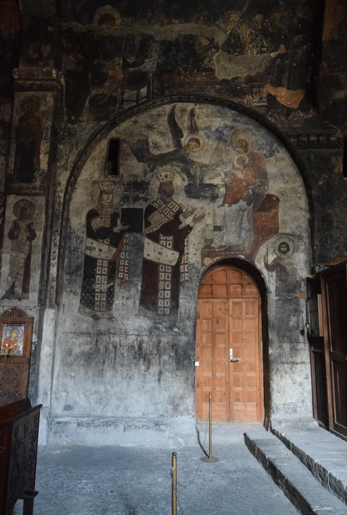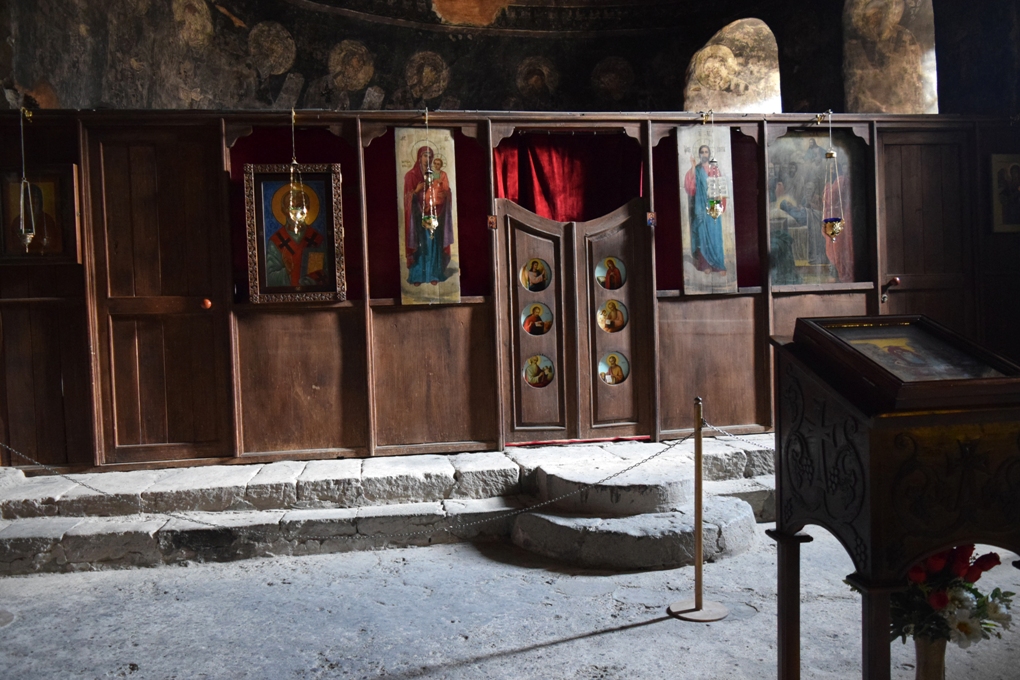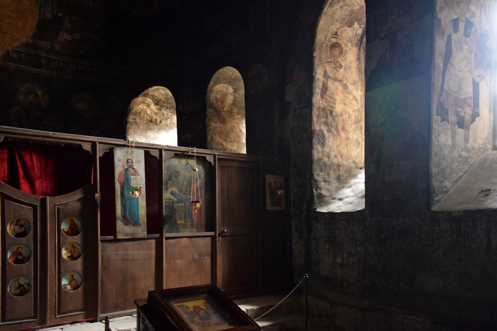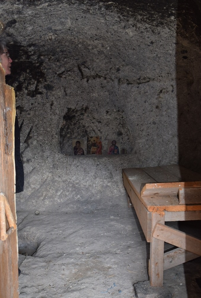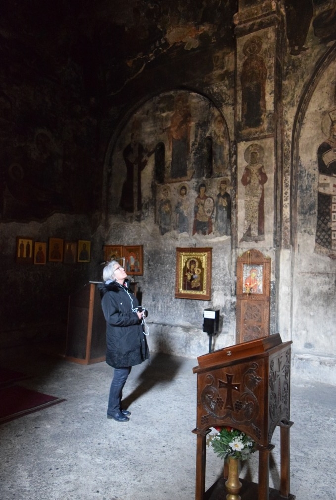 Nous avons été à pied jusqu’au site où vivent encore moines et moniales. Comme il y avait un office, nous avons juste jeté un œil avec beaucoup de discrétion. Ces églises orthodoxes sont toujours sombres à cause de la fumée des cierges allumés en permanence. Pas de bancs, les offices se suivent debout, des icones dorées partout et une odeur d’encens extrêmement présente.