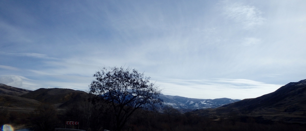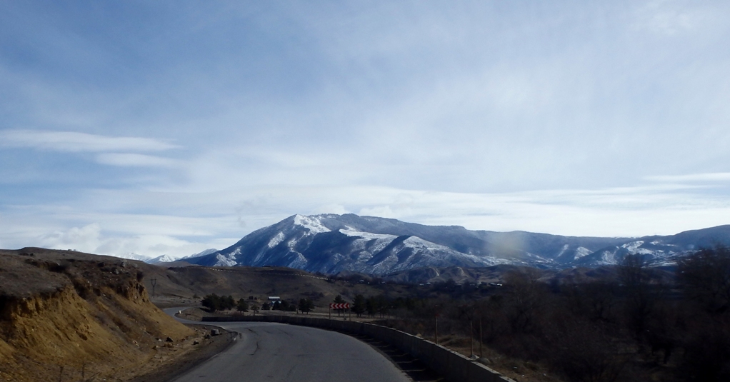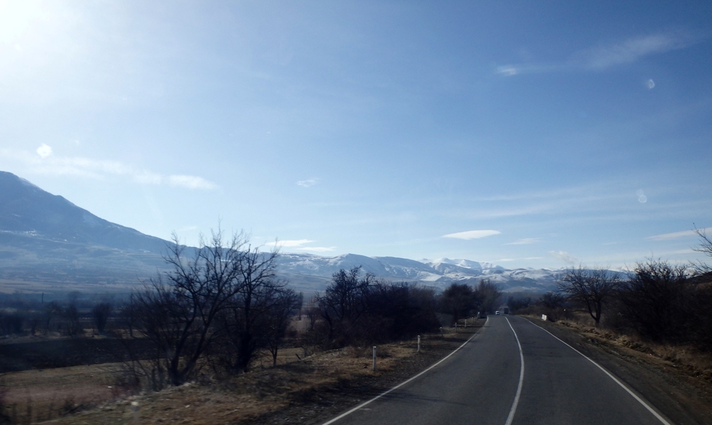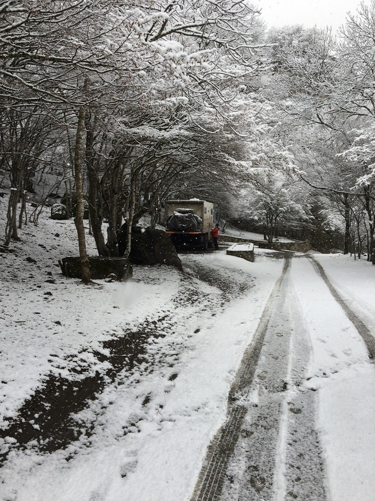 Aujourd’hui, nous avançons en direction de Vardzia. Il neige à 350m d’altitude. Le monastère est à 1300m…. Je ne sais pas si ça va le faire…. On verra demain. En attendant, dur de trouver un endroit pour dormir. Les routes sont déneigées mais pas les parkings. Nous avons fait la circulation pour aider des militaires qui avaient planté leur 4×4 à l’endroit où nous avions projeté de bivouaquer .Ils ont dû se faire tracter par la police. Du coup, on a pas trop envie de s’aventurer dans la poudreuse ! D’où notre perplexité quand à la visite de Vardzia.