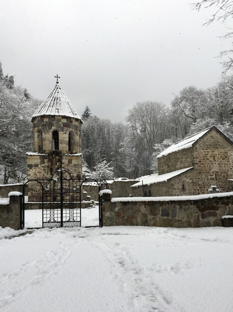 Le lendemain matin, quelques voitures de fidèles montant au monastère sont passées près de nous sans s’arrêter à cause de la neige et de la pente 🙂