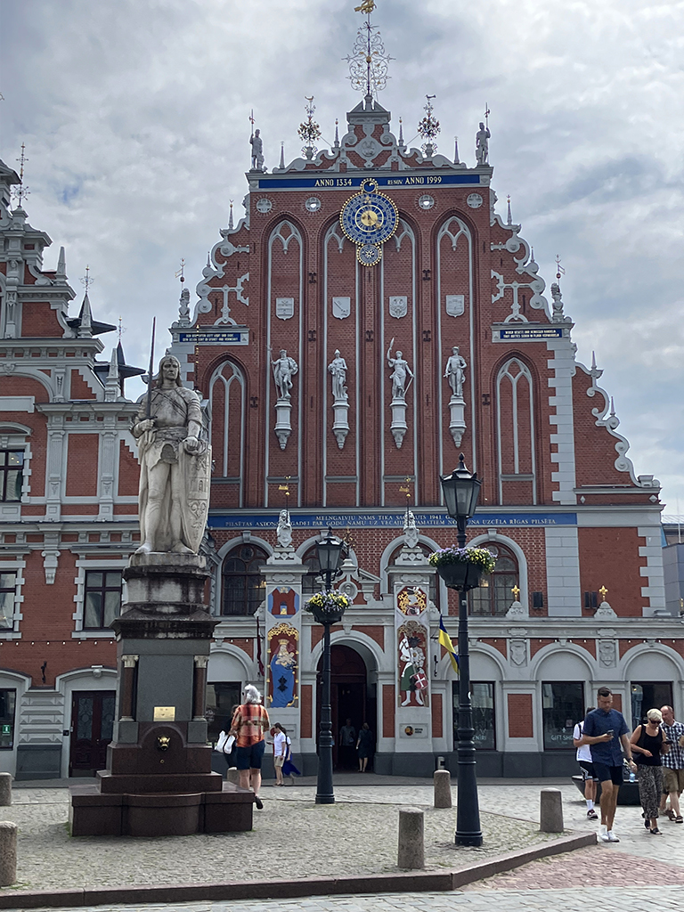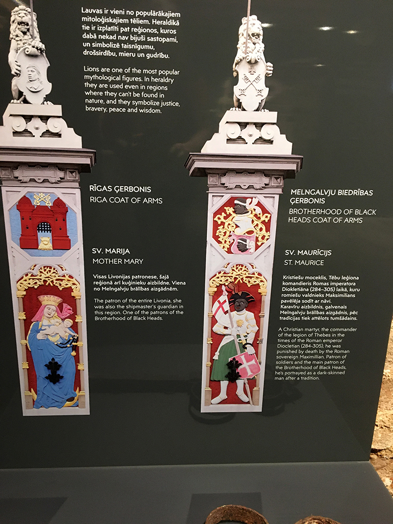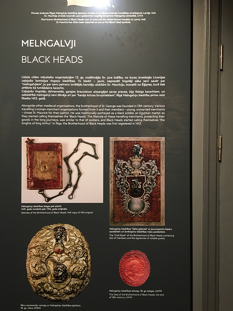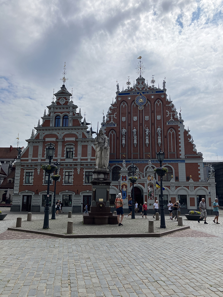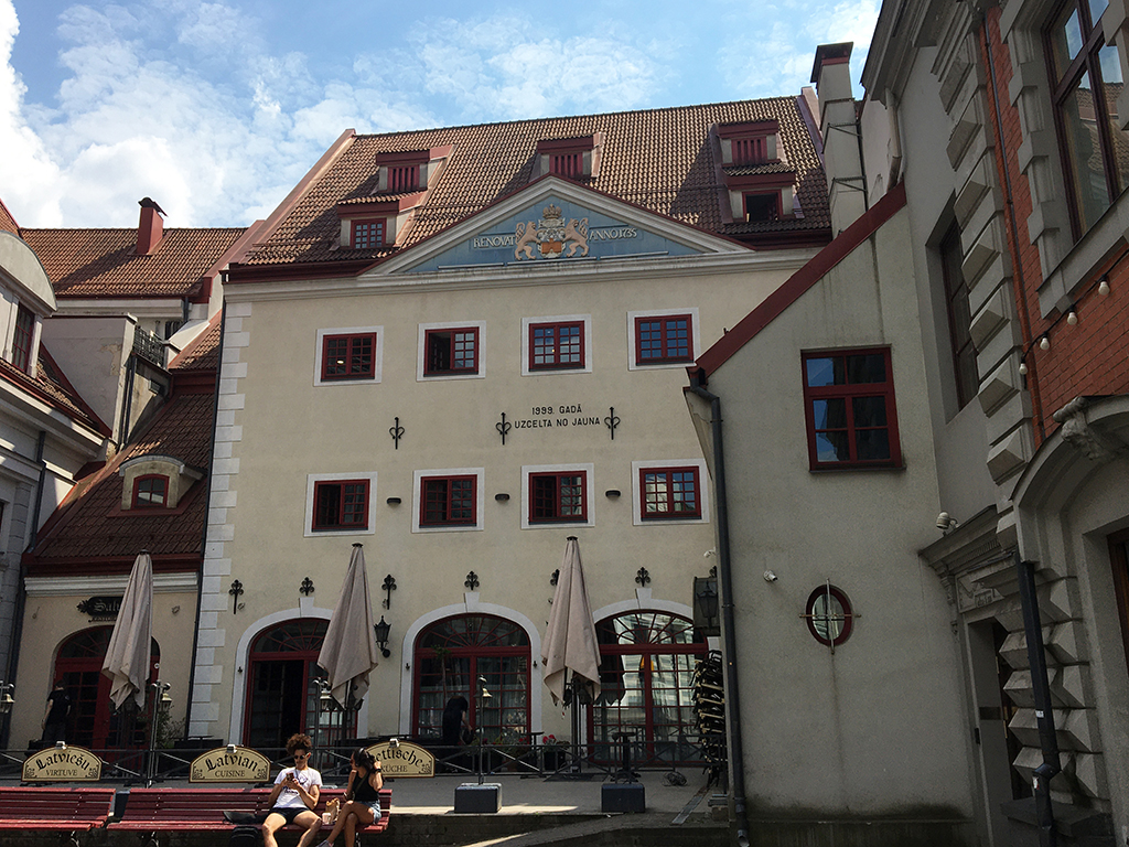 Erigée en 1344, cette maison servait de résidence provisoire aux marchands célibataires de passage, essentiellement allemands. Ils se sont regroupés en puissante confrérie avec pour patron St Maurice, dont les origines nubiennes expliquent la tête noire. Comme les caravansérails sur les routes des épices, ici, il y avait une vaste maison avec caves voutées. Remaniée et soumise aux aléas de l’histoire, elle fut totalement détruite en 1941par les allemands. Ne restait que la façade que les Russes ont dynamitée en 1948 ! Ce n’est qu’en 1995 que la Lettonie décida la reconstruction à l’identique de la maison des têtes noires actuelle.