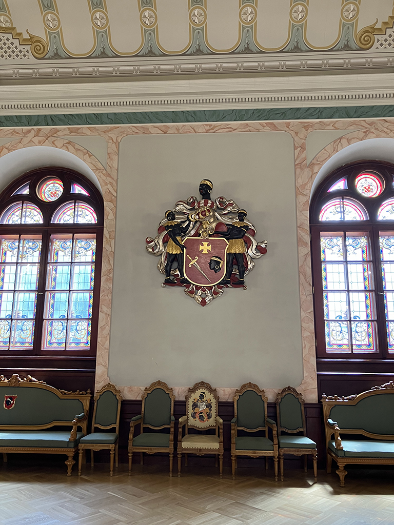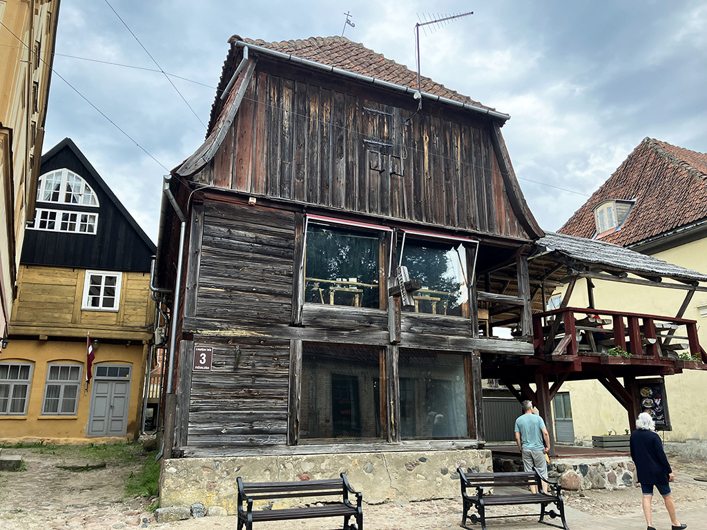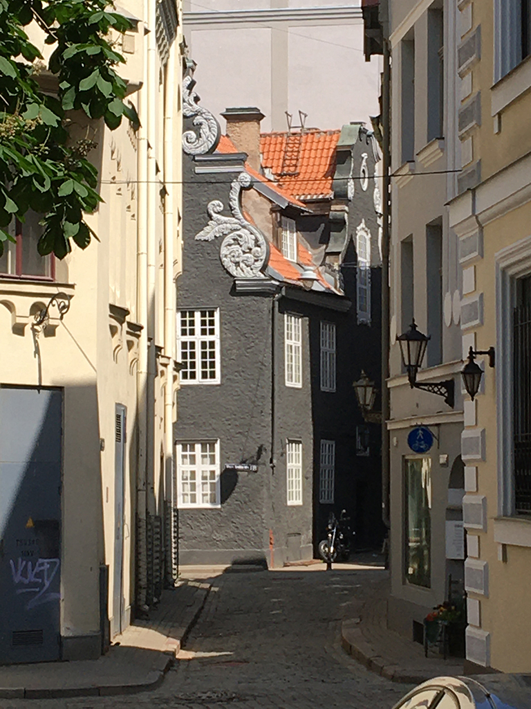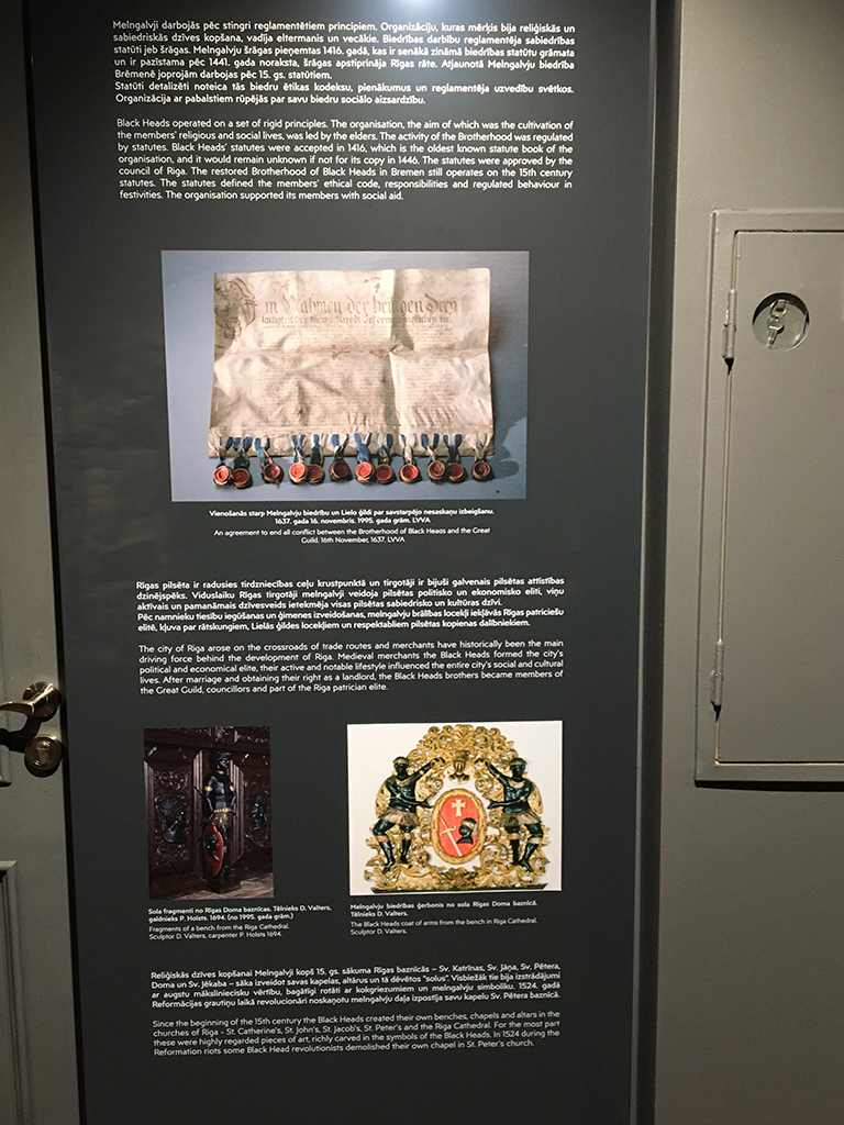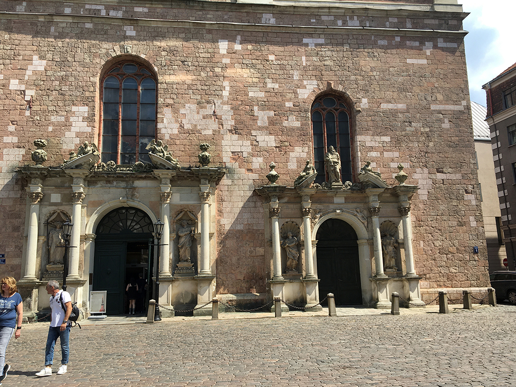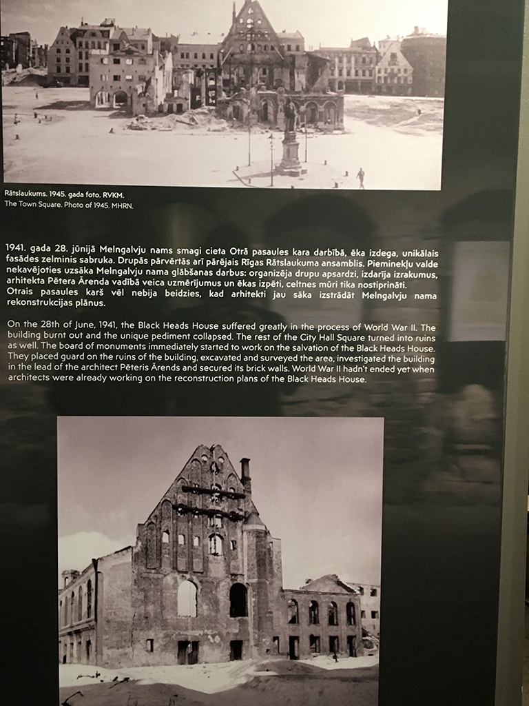 Erigée en 1344, cette maison servait de résidence provisoire aux marchands célibataires de passage, essentiellement allemands. Ils se sont regroupés en puissante confrérie avec pour patron St Maurice, dont les origines nubiennes expliquent la tête noire. Comme les caravansérails sur les routes des épices, ici, il y avait une vaste maison avec caves voutées. Remaniée et soumise aux aléas de l’histoire, elle fut totalement détruite en 1941par les allemands. Ne restait que la façade que les Russes ont dynamitée en 1948 ! Ce n’est qu’en 1995 que la Lettonie décida la reconstruction à l’identique de la maison des têtes noires actuelle.