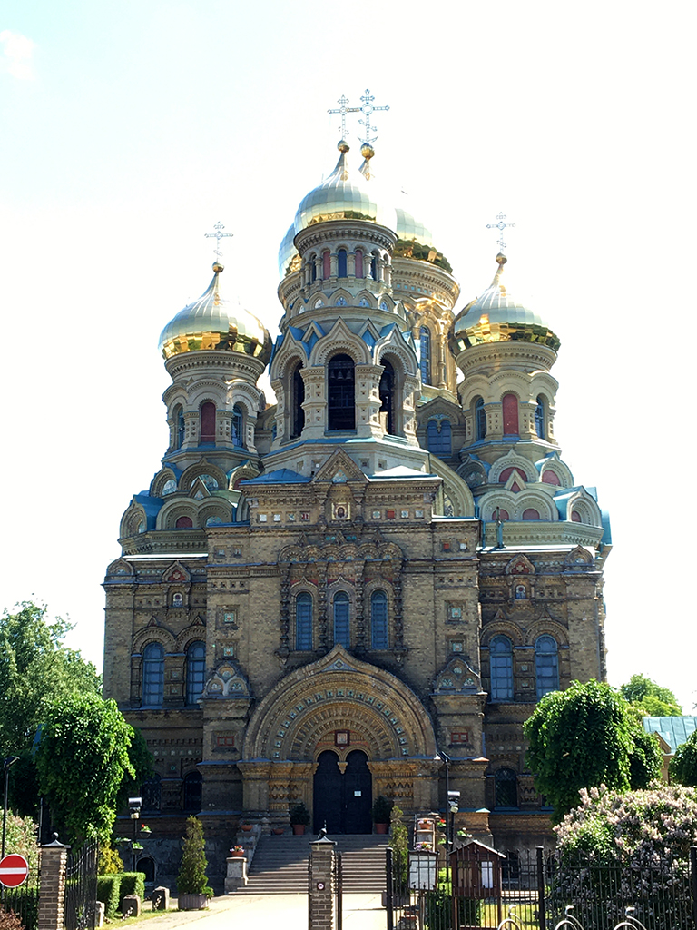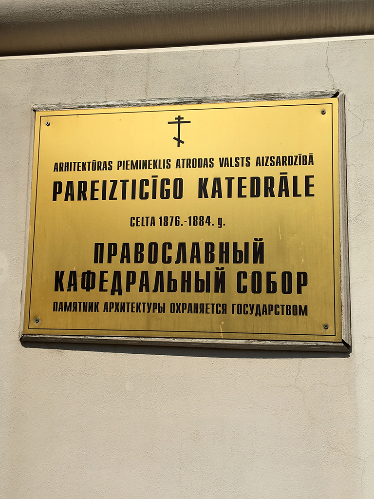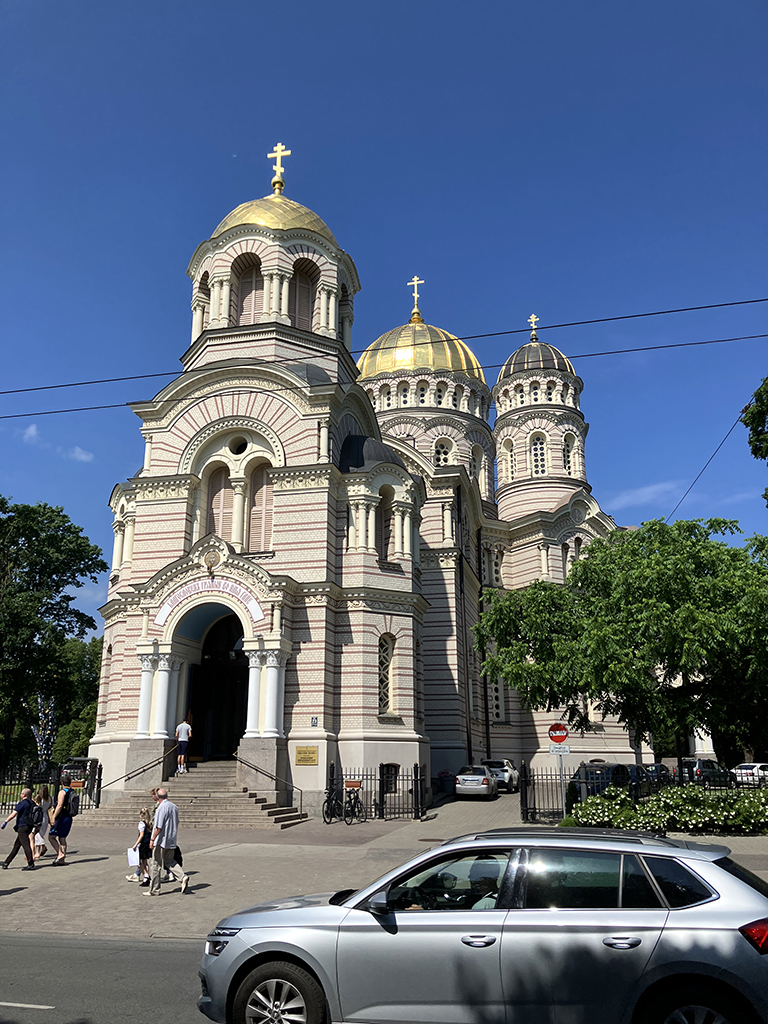 Dans un parc, il y a le théâtre-opéra et plus loin la cathédrale orthodoxe de la Nativité du Christ. J’étais en bermuda jusqu’aux genoux et en T-shirt à manches courtes. Une sœur m’a tendu un tissus et j’ai cru que c’était un foulard pour la tête mais non, c’était une jupe portefeuille :). J’ai eu également le foulard ! Une chose est sûre, l’élégance à la française en a pris un coup ! :-)) Pour une fois qu’un lieu orthodoxe était ouvert, je n’allais pas bouder mon plaisir. L’intérieur était somptueux. Evidemment beaucoup d’or et d’argent sur les icones, beaucoup de cierges. Deux choses ont attiré notre attention, la grande clarté dans la cathédrale, et une grande inscription en leds rouges. Nous sommes désolés, les photos étaient interdites et les sœurs patrouillaient ! Regardez la forme de la croix.