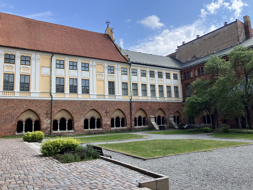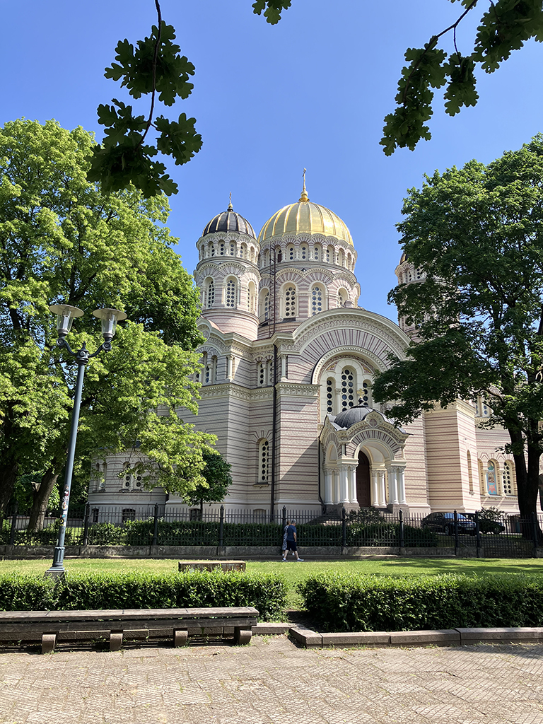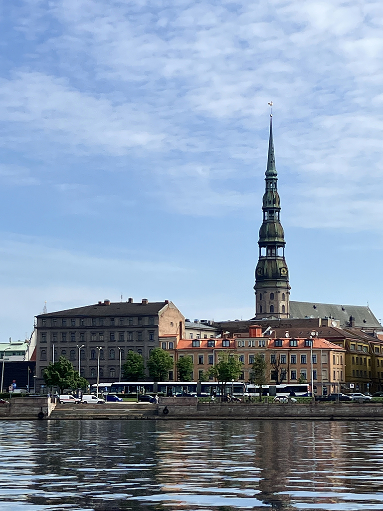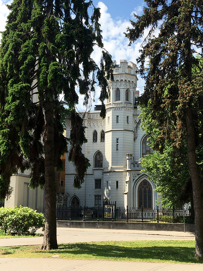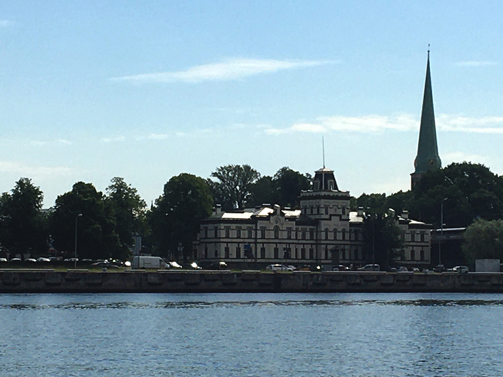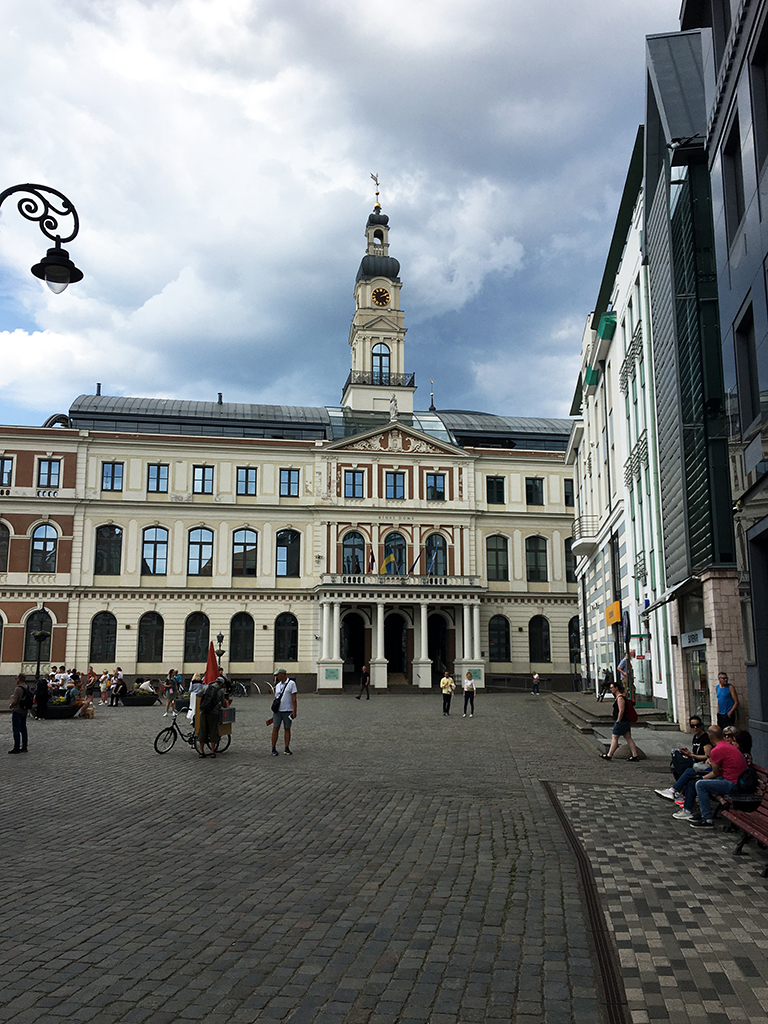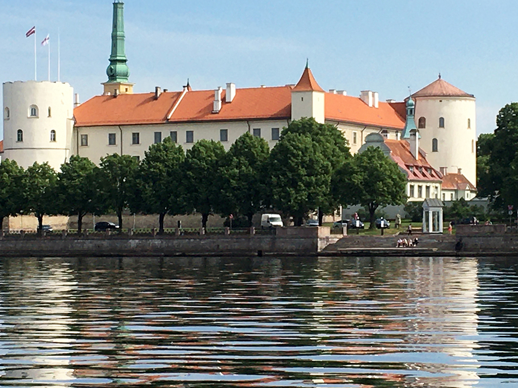 Le bâtiment blanc avec les tours rondes, c’est le château de Riga. Construit au XIIème siècle et réaménagé au XVème, il fut la résidence du Grand maître de l’ordre des Chevaliers de Livonie, ordre militaire chrétien, chargé de propager la parole du Christ auprès des populations locales.