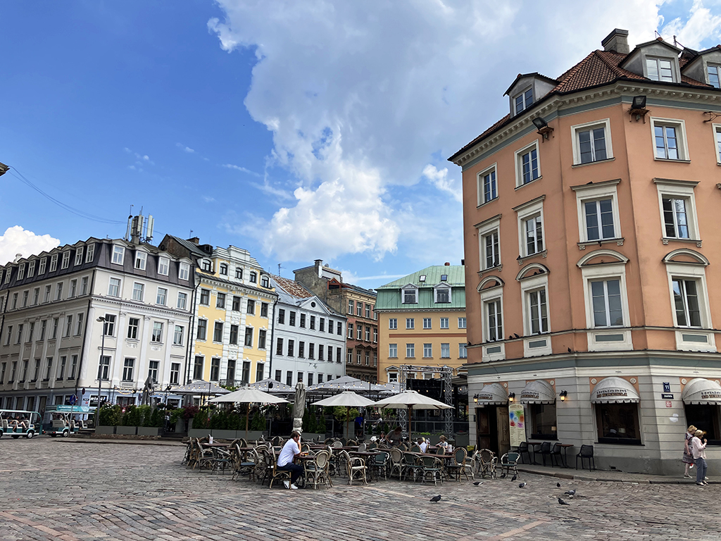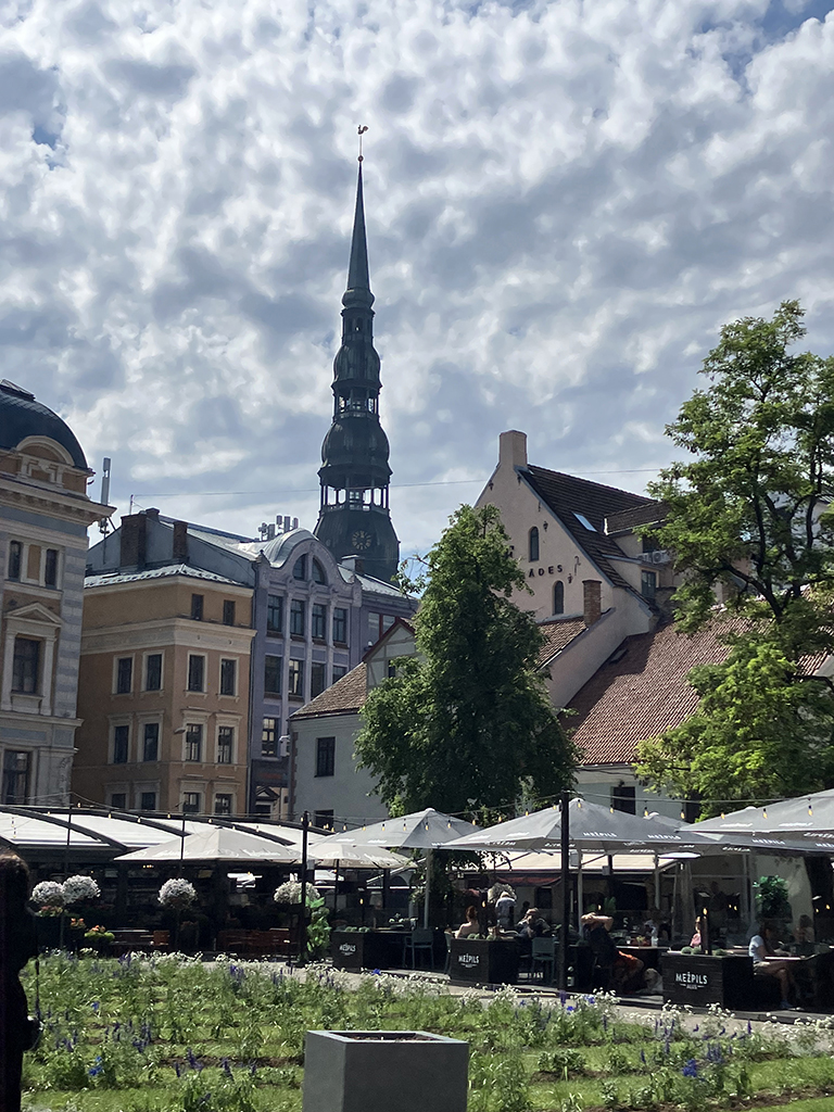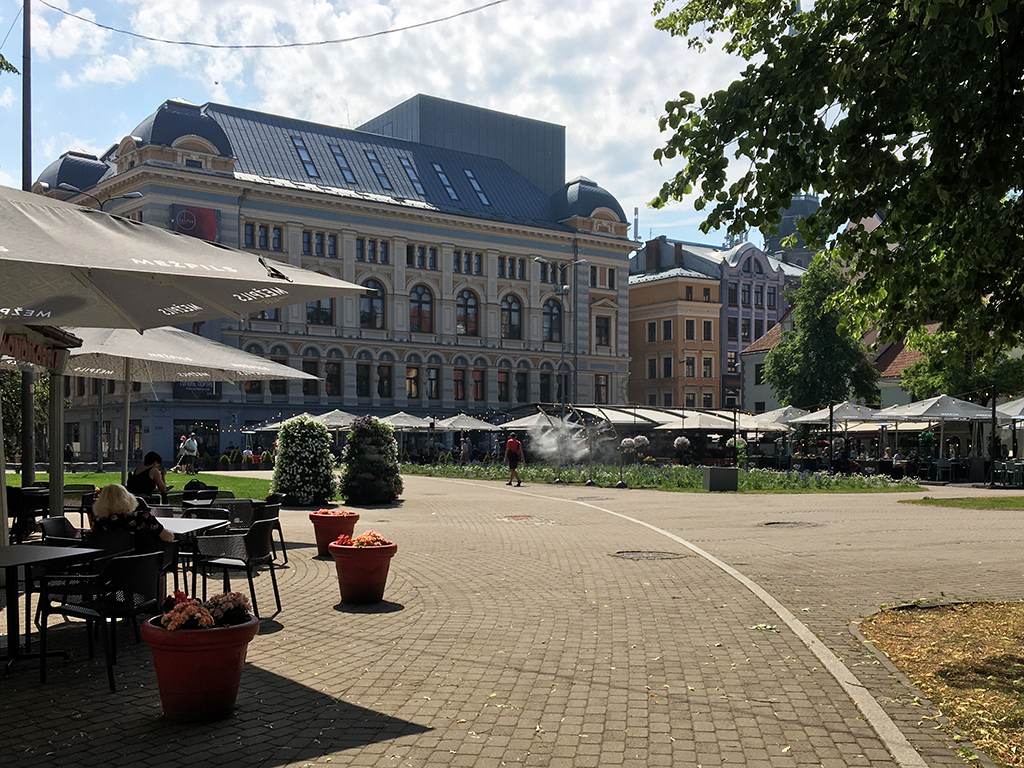 A Riga, il y a pas mal d’espaces verts, de places, d’endroits avec bancs pour s’installer dehors. C’est vraiment agréable. Nous avons choisi la place Llvu pour le déjeuner. Les courses et les restaurants sont toujours un moment de flottement. Peu de personnes parlent anglais, les menus ne sont pas souvent en anglais. Mais pour le moment, nous n’avons jamais regretté nos choix (à part la boisson dégeu à Vilnius !)
