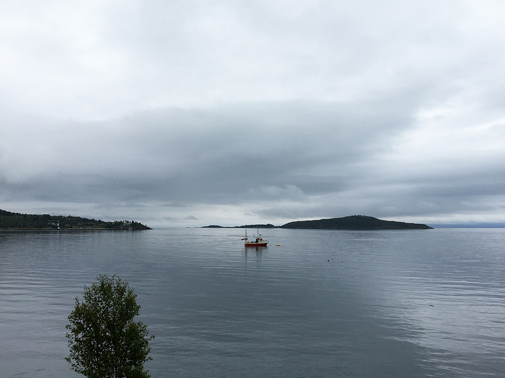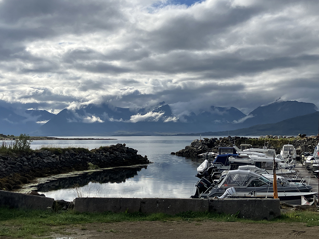 La météo n’est vraiment pas géniale. Le ciel gris, ça peut passer, même si les photos sont à contre-jour. Mais le problème, c’est le plafond nuageux. Il est si bas que nous sommes dans le nuage et là, les paysages… Nous trainaillons en attendant une fenêtre météo pour visiter les Lofoten. Une idée lumineuse nous amène à Sto. C’est la pointe suivante à côté de Nyksund. Nous avons trouvé le dépliant d’une agence qui emmène en mer des touristes pour voir des cétacés et une falaise aux oiseaux avec notamment des macareux. Mouillés pour mouillés, autant aller en mer 🙂 Et bien non ! Le dépliant indiquait qu’ils travaillaient jusqu’au 31/8 mais le 18/8, c’était déjà terminé. La saison a dû être bonne… Nous voilà repartis en direction des Lofoten par l’île d’Hadseloya, où nous prendrons un ferry.