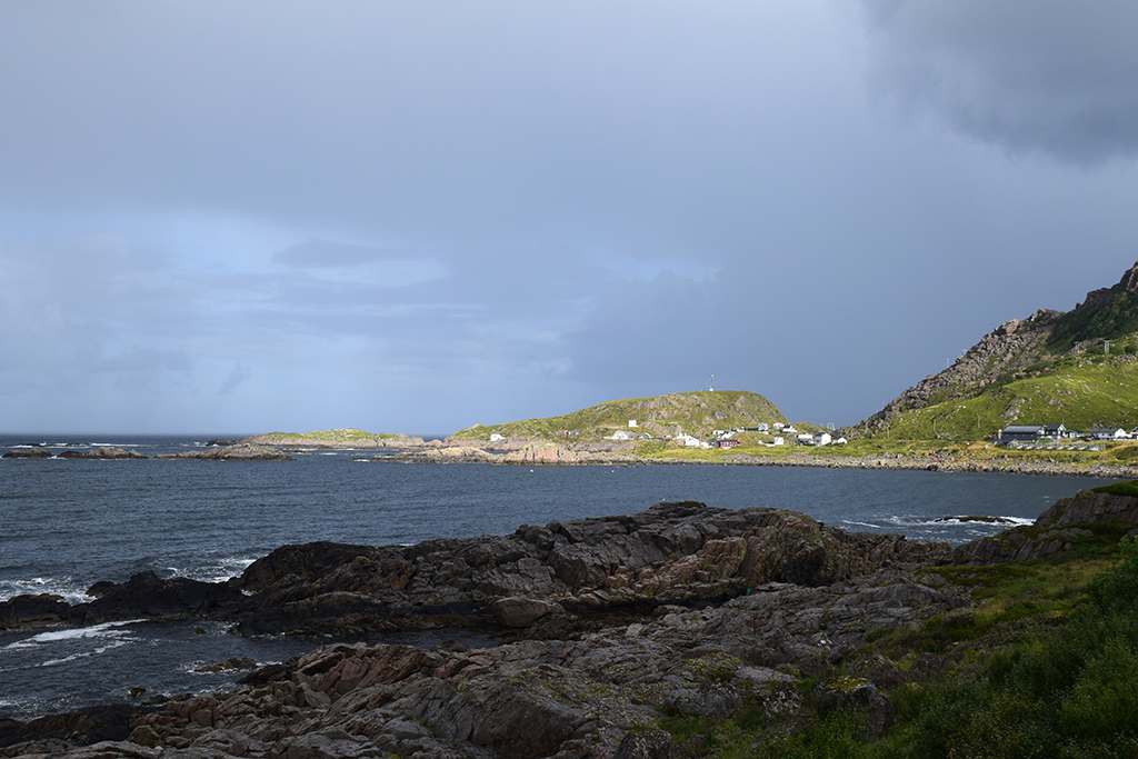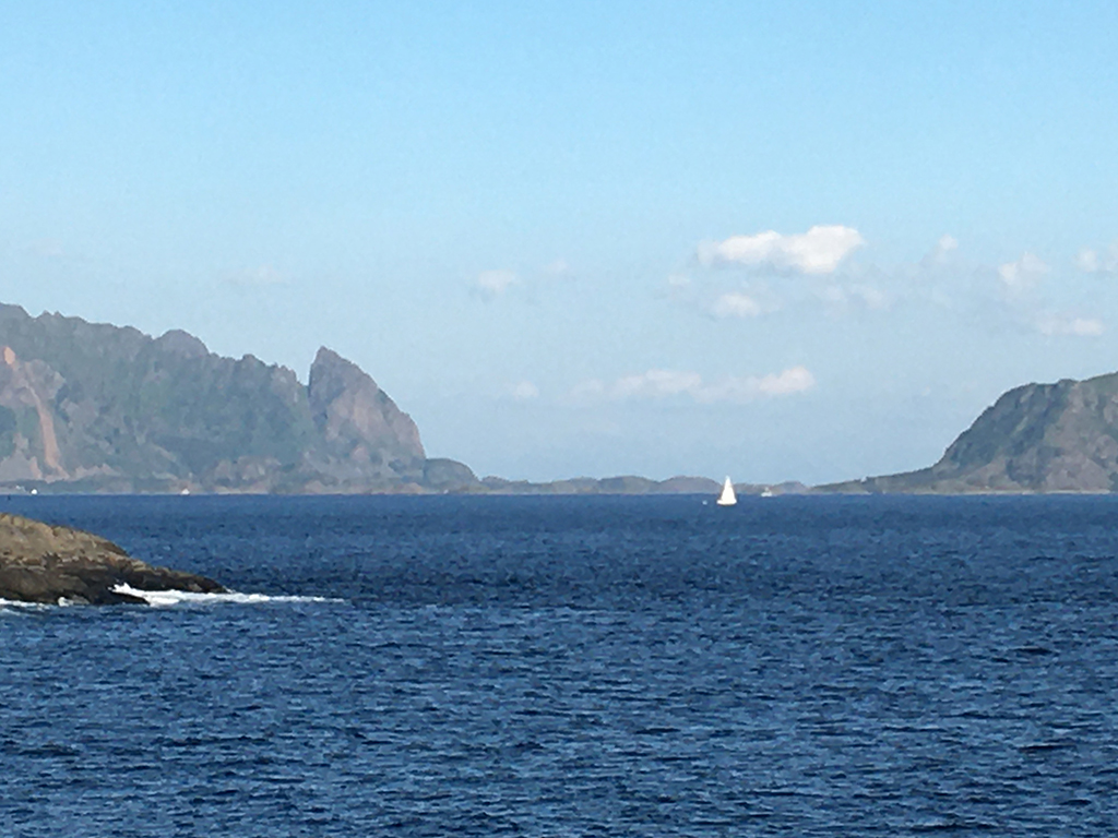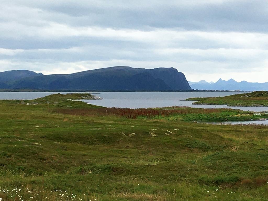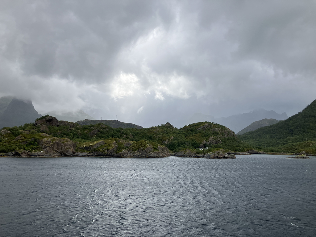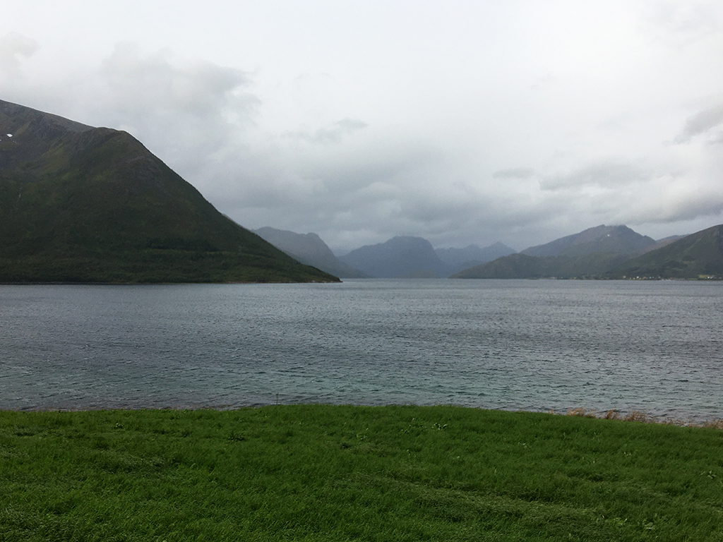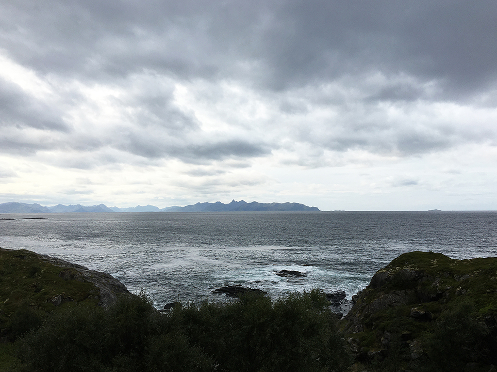 La météo n’est vraiment pas géniale. Le ciel gris, ça peut passer, même si les photos sont à contre-jour. Mais le problème, c’est le plafond nuageux. Il est si bas que nous sommes dans le nuage et là, les paysages… Nous trainaillons en attendant une fenêtre météo pour visiter les Lofoten. Une idée lumineuse nous amène à Sto. C’est la pointe suivante à côté de Nyksund. Nous avons trouvé le dépliant d’une agence qui emmène en mer des touristes pour voir des cétacés et une falaise aux oiseaux avec notamment des macareux. Mouillés pour mouillés, autant aller en mer 🙂 Et bien non ! Le dépliant indiquait qu’ils travaillaient jusqu’au 31/8 mais le 18/8, c’était déjà terminé. La saison a dû être bonne… Nous voilà repartis en direction des Lofoten par l’île d’Hadseloya, où nous prendrons un ferry.