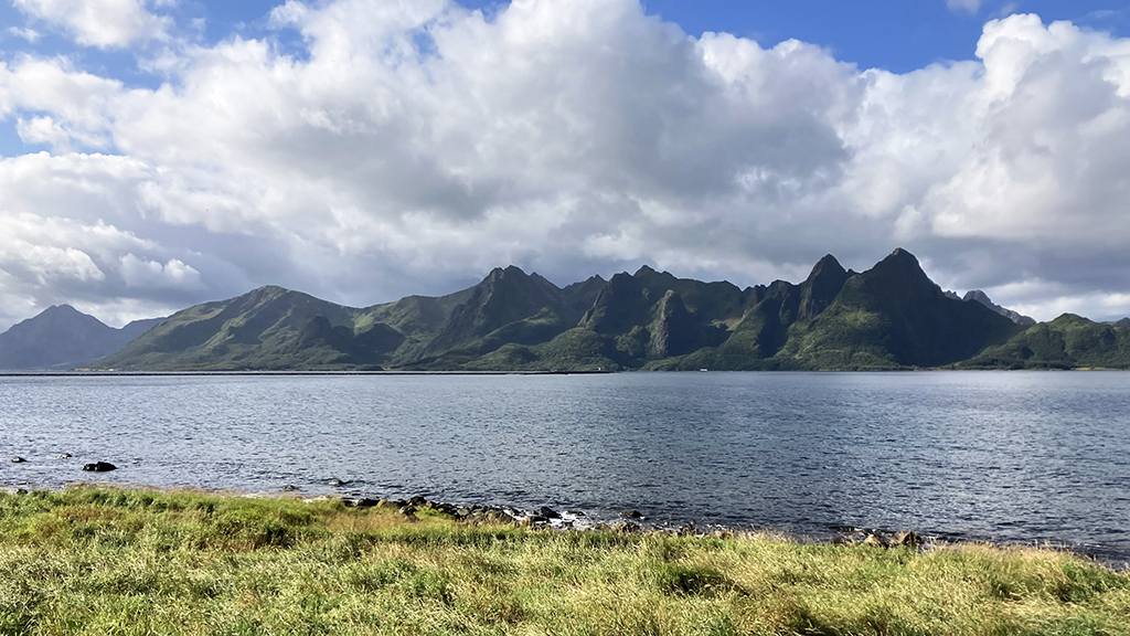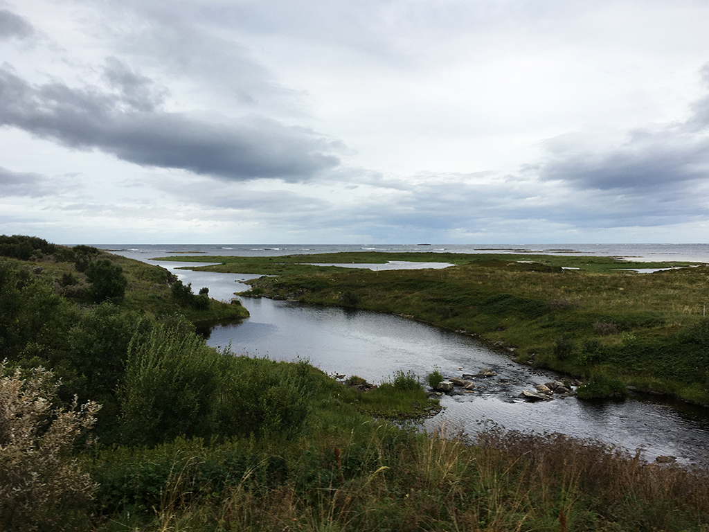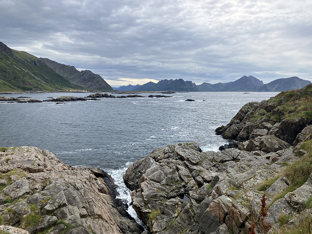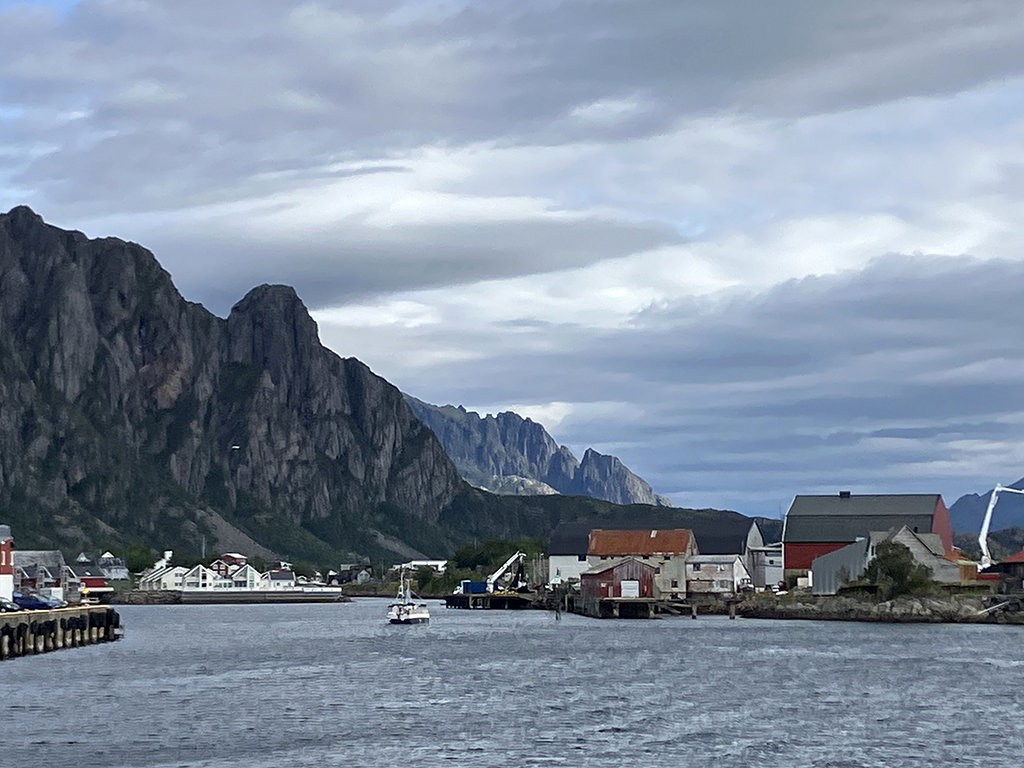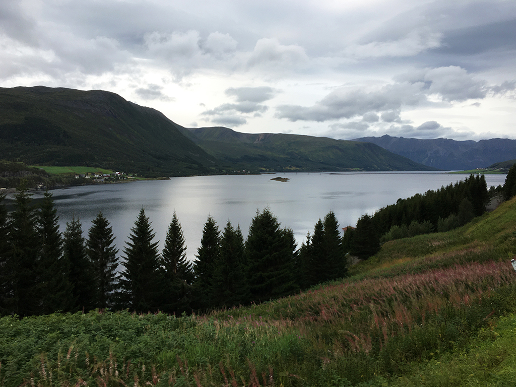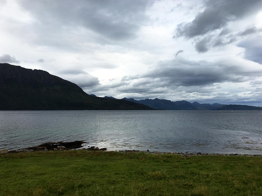 La météo n’est vraiment pas géniale. Le ciel gris, ça peut passer, même si les photos sont à contre-jour. Mais le problème, c’est le plafond nuageux. Il est si bas que nous sommes dans le nuage et là, les paysages… Nous trainaillons en attendant une fenêtre météo pour visiter les Lofoten. Une idée lumineuse nous amène à Sto. C’est la pointe suivante à côté de Nyksund. Nous avons trouvé le dépliant d’une agence qui emmène en mer des touristes pour voir des cétacés et une falaise aux oiseaux avec notamment des macareux. Mouillés pour mouillés, autant aller en mer 🙂 Et bien non ! Le dépliant indiquait qu’ils travaillaient jusqu’au 31/8 mais le 18/8, c’était déjà terminé. La saison a dû être bonne… Nous voilà repartis en direction des Lofoten par l’île d’Hadseloya, où nous prendrons un ferry.