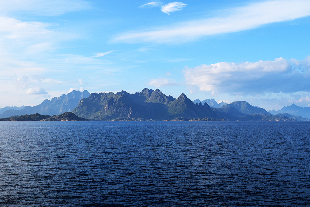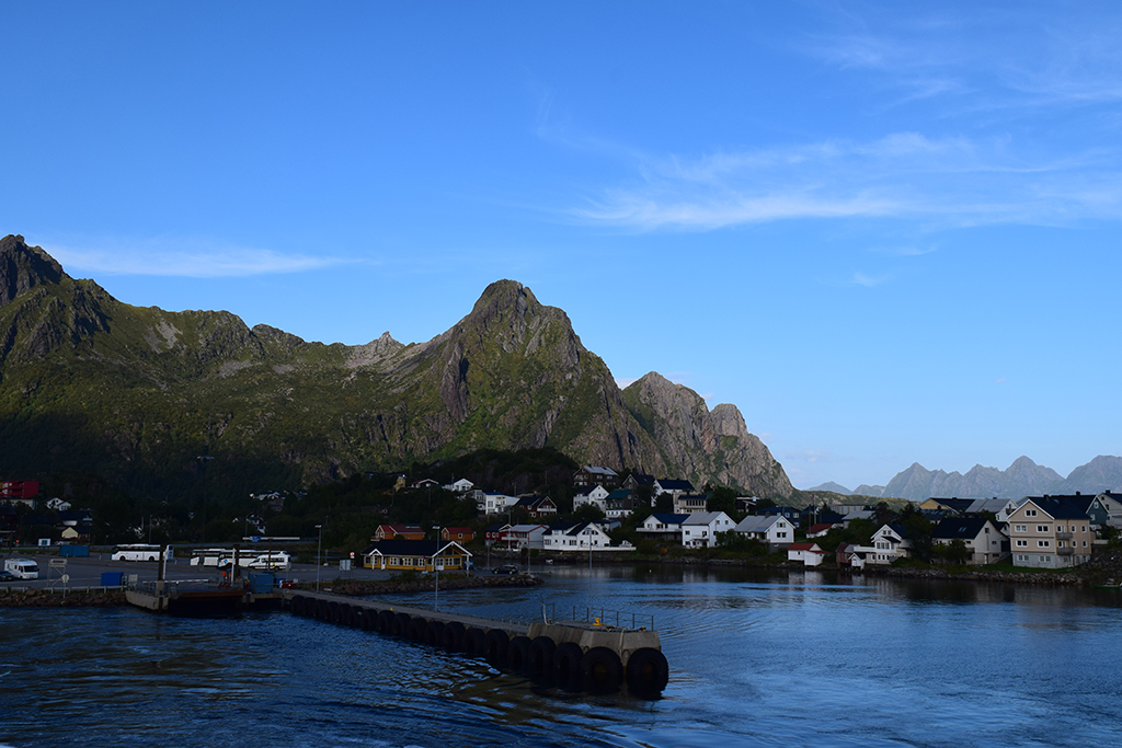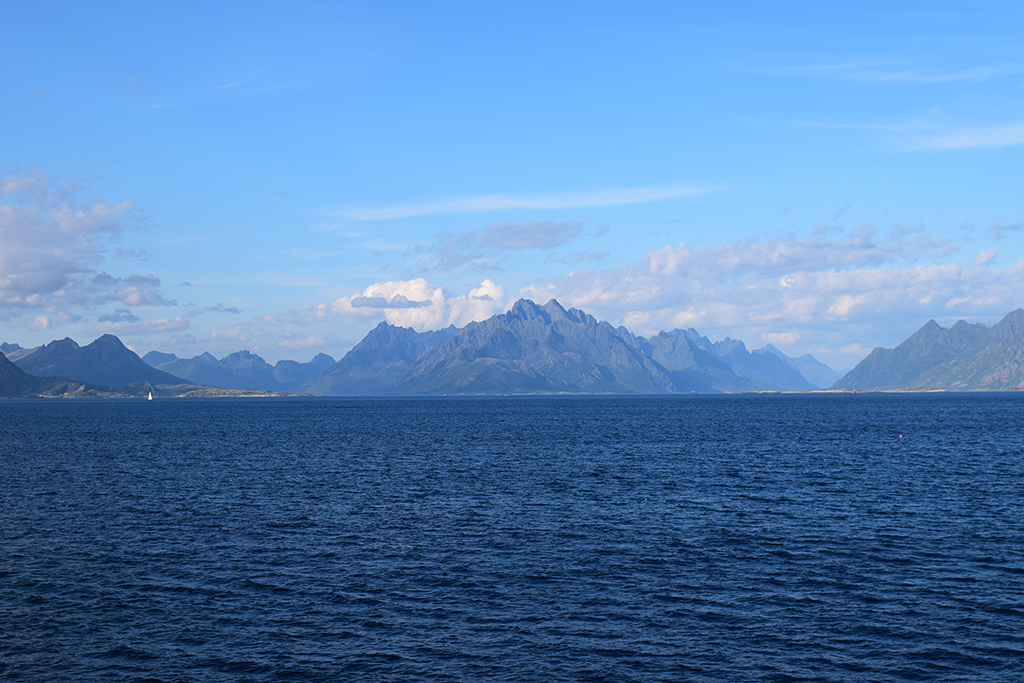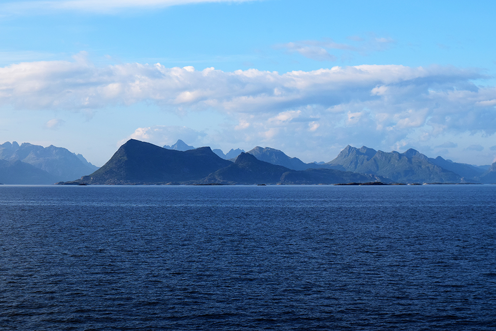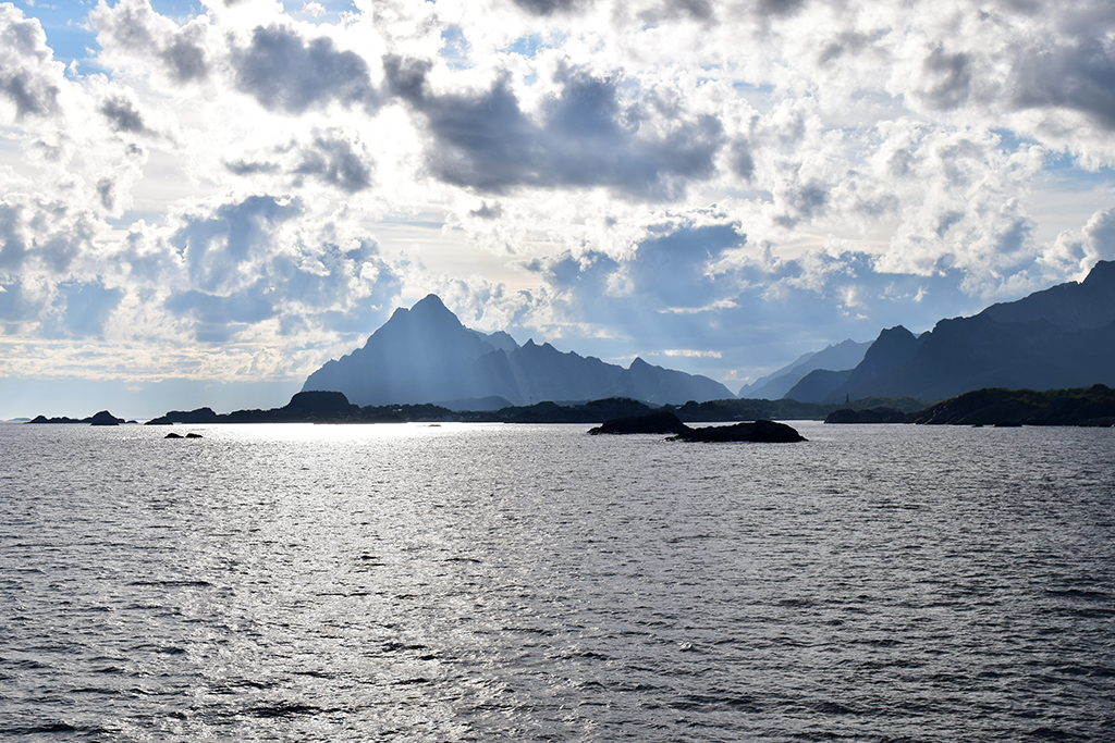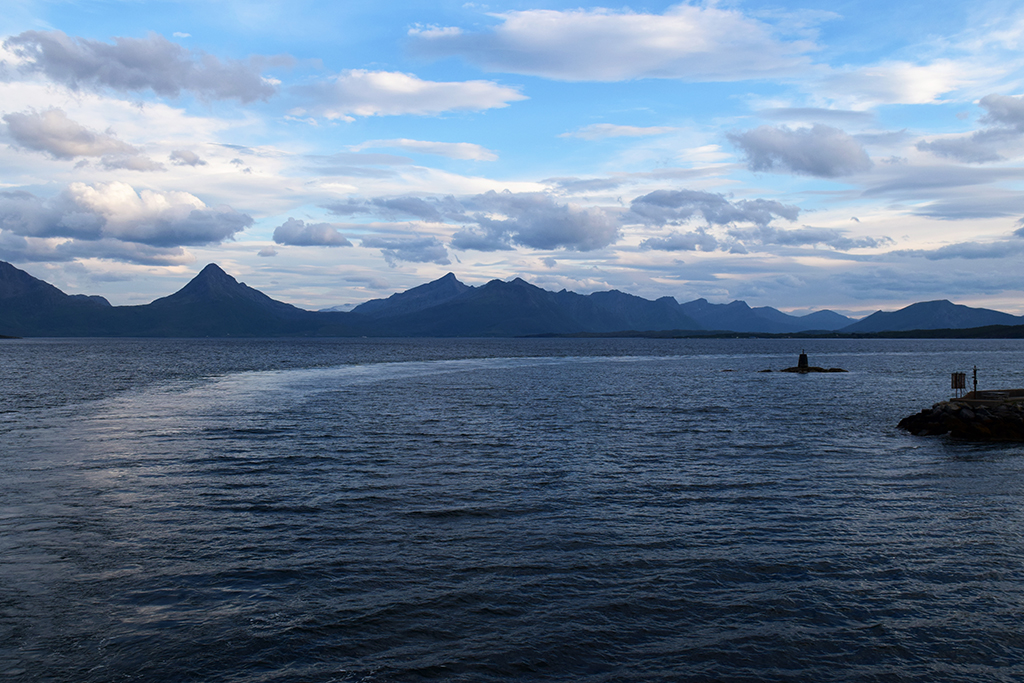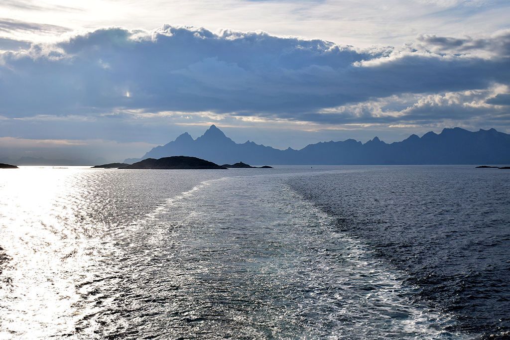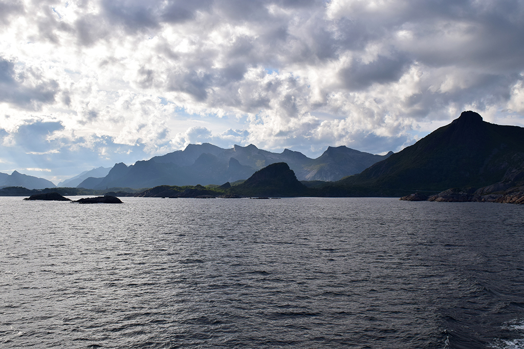 Le démarreur arrivera demain, vendredi. Cet après-midi, le ciel s’est découvert, nous décidons de profiter de l’éclaircie pour faire un aller-retour en ferry. C’est, d’après le guide, la plus belle traversée au monde. En plus, c’est gratuit ! L’itinéraire passe entre différentes iles, s’arrête à Skrova, sur demande, et offre des paysages splendides. L’heure un peu tardive et le ciel couvert ne nous ont pas permis de faire d’excellentes photos. Il manque de la profondeur de champ pour voir toutes les chaînes montagneuses qui se succèdent.