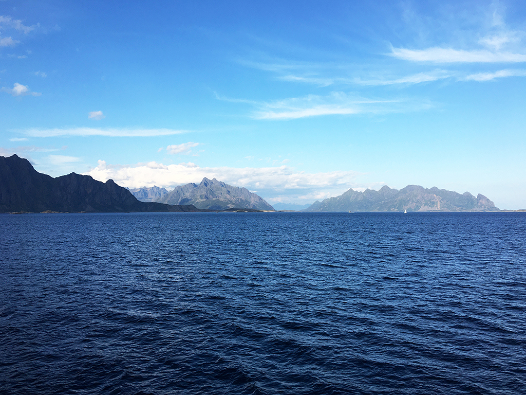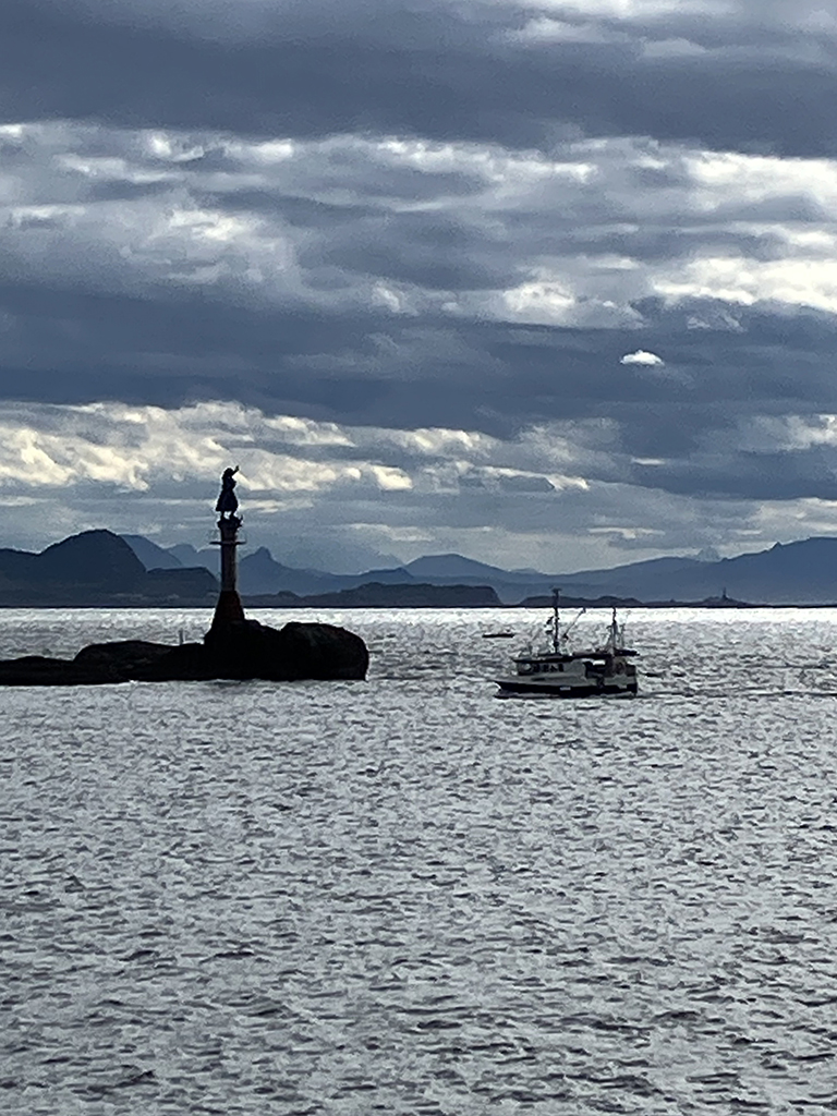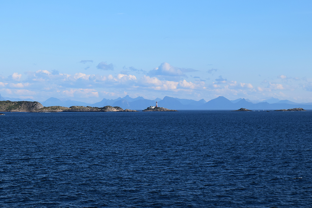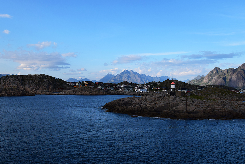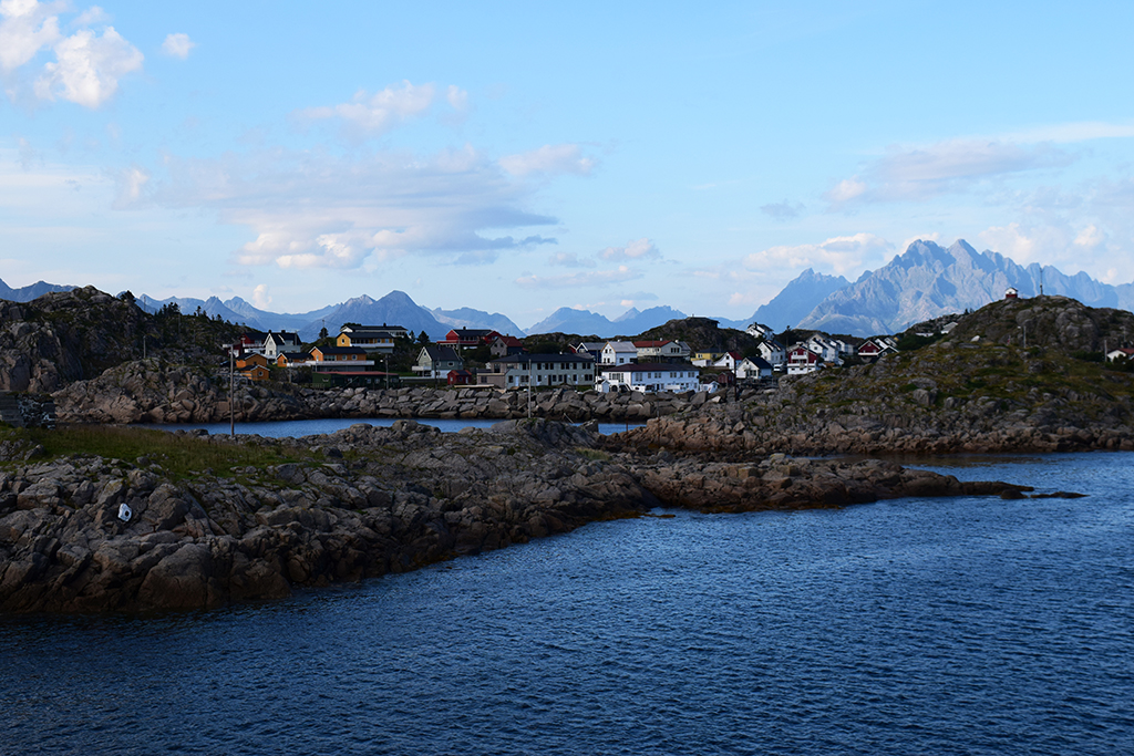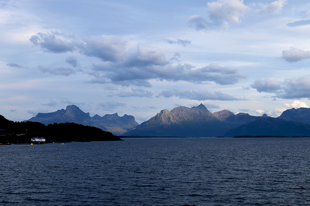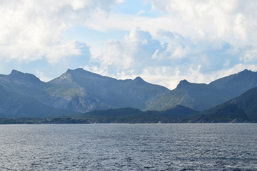 Le démarreur arrivera demain, vendredi. Cet après-midi, le ciel s’est découvert, nous décidons de profiter de l’éclaircie pour faire un aller-retour en ferry. C’est, d’après le guide, la plus belle traversée au monde. En plus, c’est gratuit ! L’itinéraire passe entre différentes iles, s’arrête à Skrova, sur demande, et offre des paysages splendides. L’heure un peu tardive et le ciel couvert ne nous ont pas permis de faire d’excellentes photos. Il manque de la profondeur de champ pour voir toutes les chaînes montagneuses qui se succèdent.