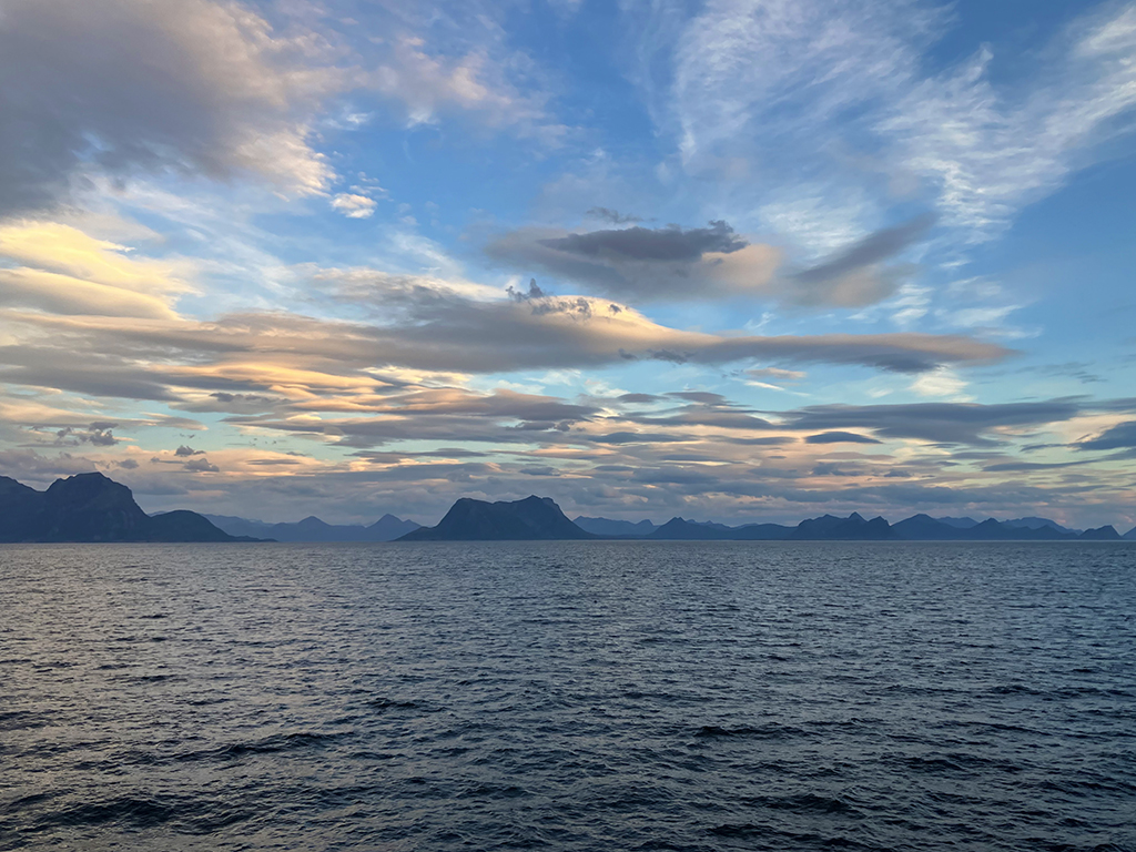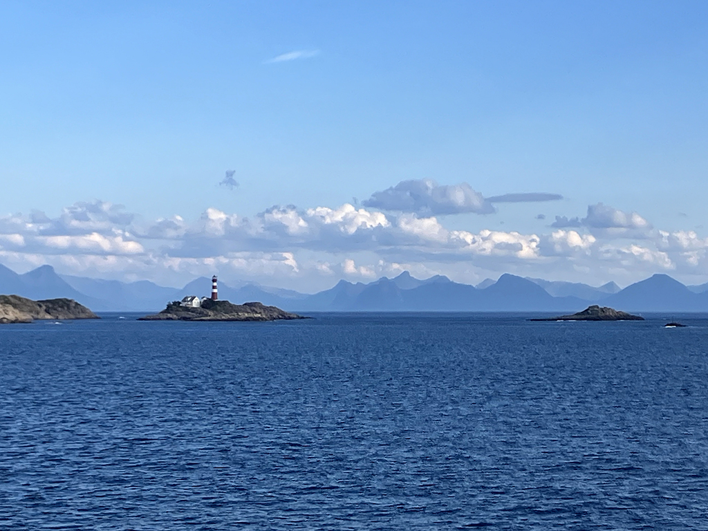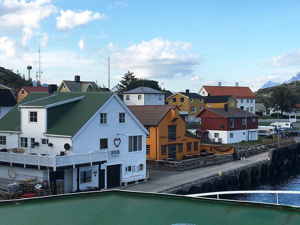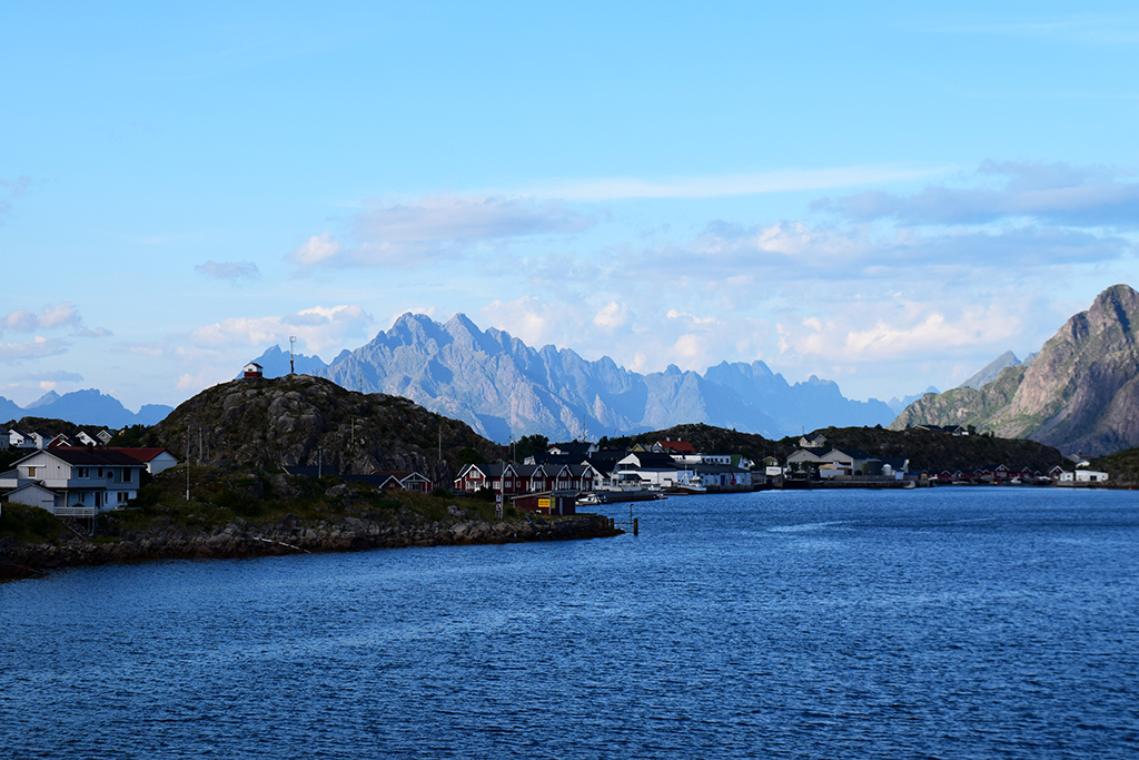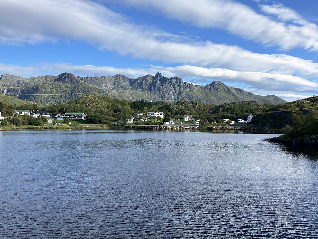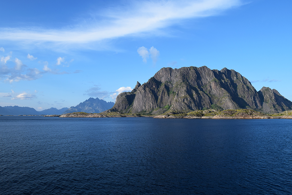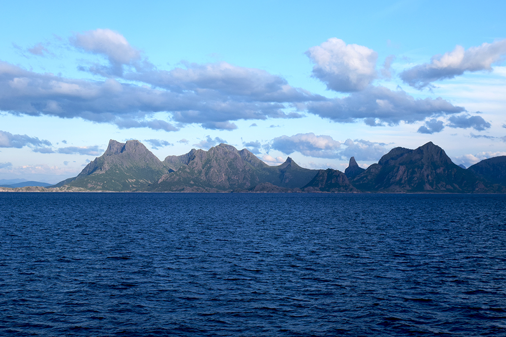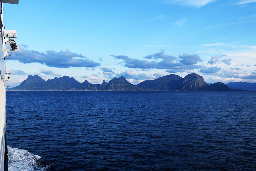 Le démarreur arrivera demain, vendredi. Cet après-midi, le ciel s’est découvert, nous décidons de profiter de l’éclaircie pour faire un aller-retour en ferry. C’est, d’après le guide, la plus belle traversée au monde. En plus, c’est gratuit ! L’itinéraire passe entre différentes iles, s’arrête à Skrova, sur demande, et offre des paysages splendides. L’heure un peu tardive et le ciel couvert ne nous ont pas permis de faire d’excellentes photos. Il manque de la profondeur de champ pour voir toutes les chaînes montagneuses qui se succèdent.