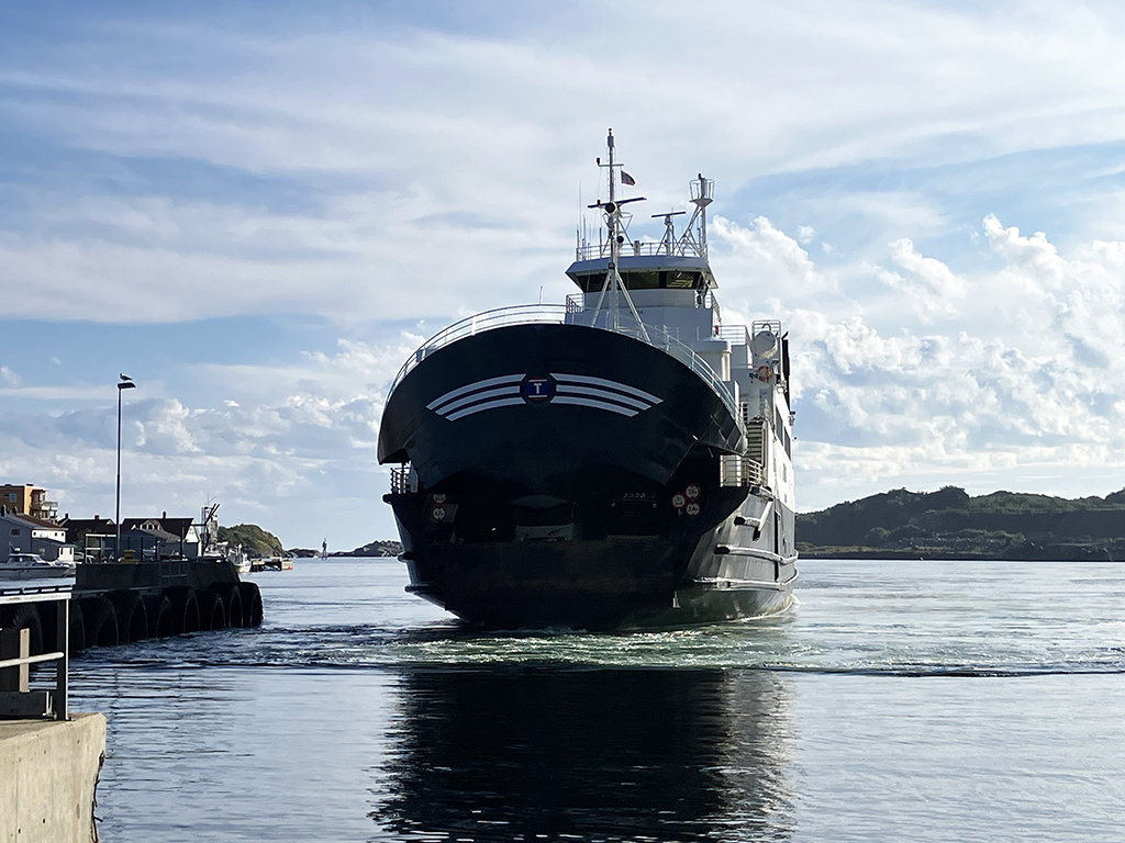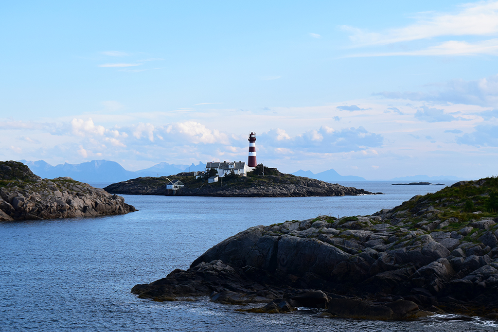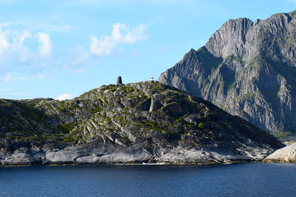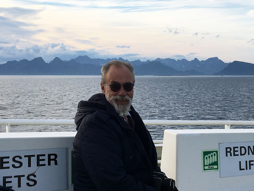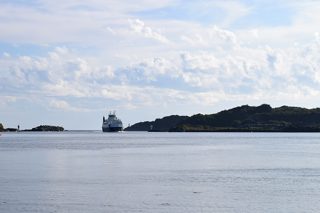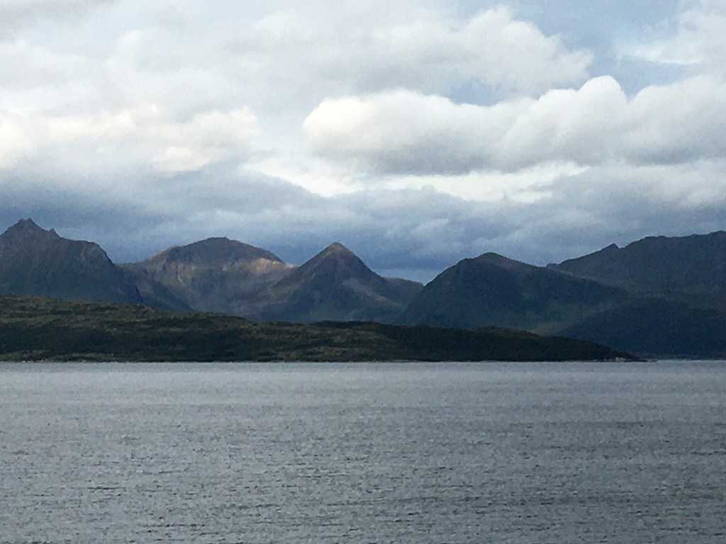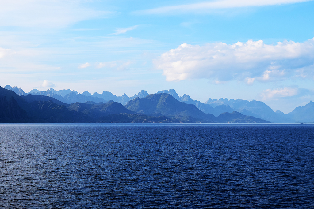 Le démarreur arrivera demain, vendredi. Cet après-midi, le ciel s’est découvert, nous décidons de profiter de l’éclaircie pour faire un aller-retour en ferry. C’est, d’après le guide, la plus belle traversée au monde. En plus, c’est gratuit ! L’itinéraire passe entre différentes iles, s’arrête à Skrova, sur demande, et offre des paysages splendides. L’heure un peu tardive et le ciel couvert ne nous ont pas permis de faire d’excellentes photos. Il manque de la profondeur de champ pour voir toutes les chaînes montagneuses qui se succèdent.