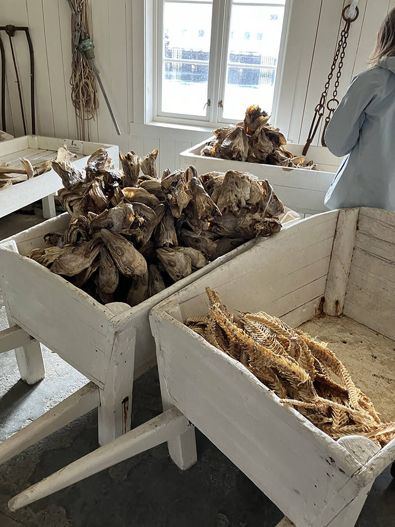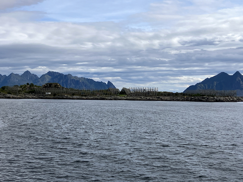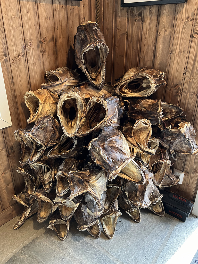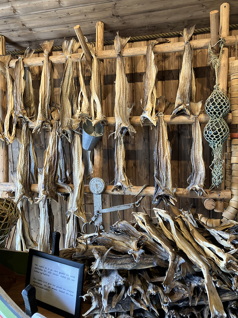 Nous avons visité le musée de la pêche à Å. La porte était ouverte mais la pancarte « closed » était posée sur une table. Nous avons parcouru seuls les deux salles avec un papier d’explications en français. Merci ! Partout au bord de la mer, il y a des séchoirs à poissons. Etonnés de n’y voir aucune bestiole, nous avons eu la réponse. Ce n’est pas comme le linge, le poisson ne sèche pas au soleil et à la chaleur. Le saison du cabillaud commence en novembre. Enfin, l’année dernière, cela a été en décembre. Il faut que les températures dans les eaux autour de la calotte glacière descendent bien pour que les cabillauds migrent vers les eaux norvégiennes. Le réchauffement climatique inquiète beaucoup les pêcheurs. Si les cabillauds n’avaient plus besoin de migrer, ce serait une catastrophe pour l’économie du pays.