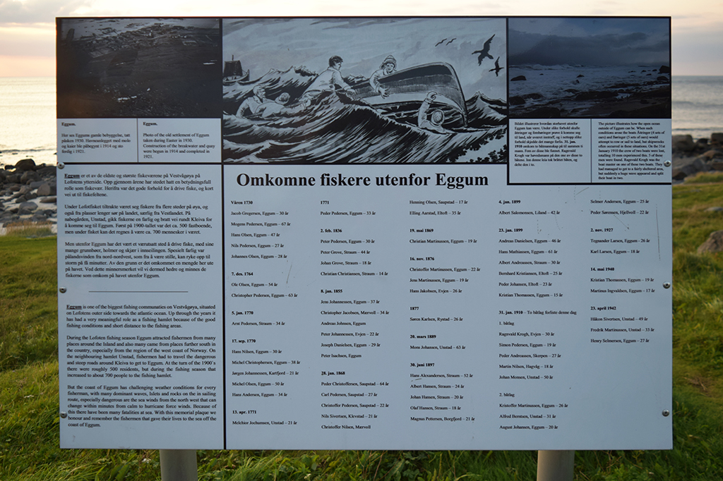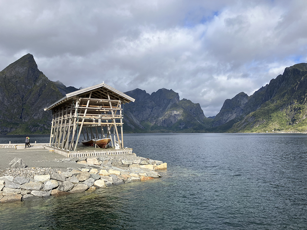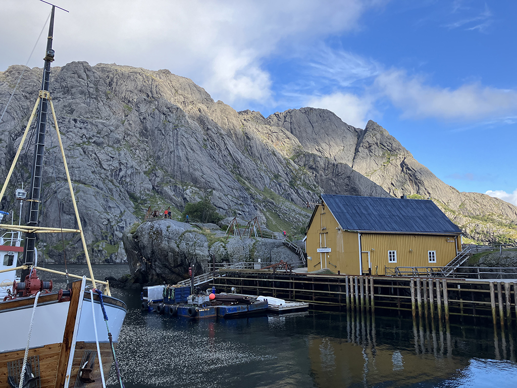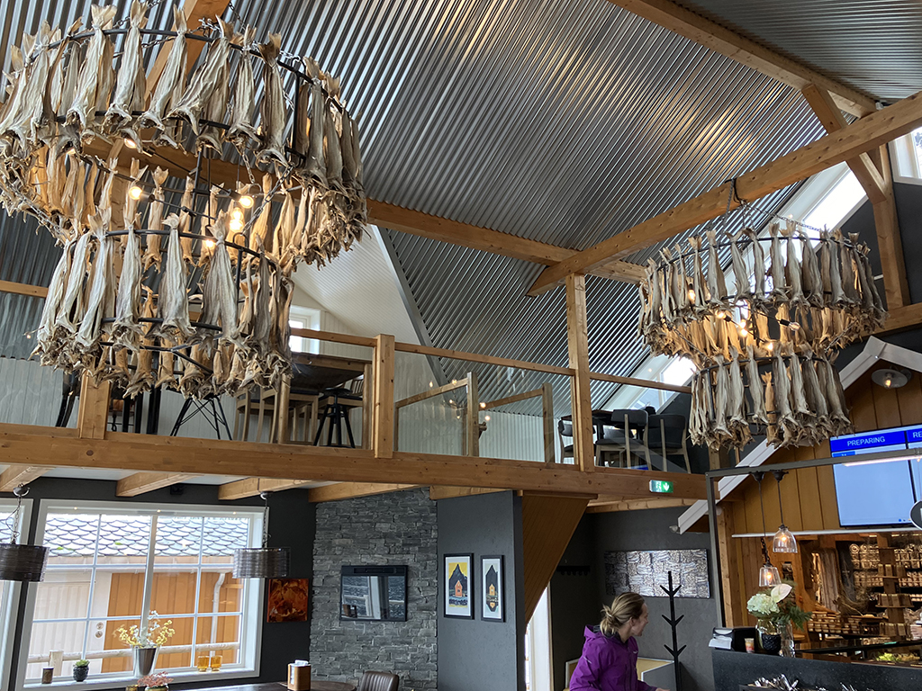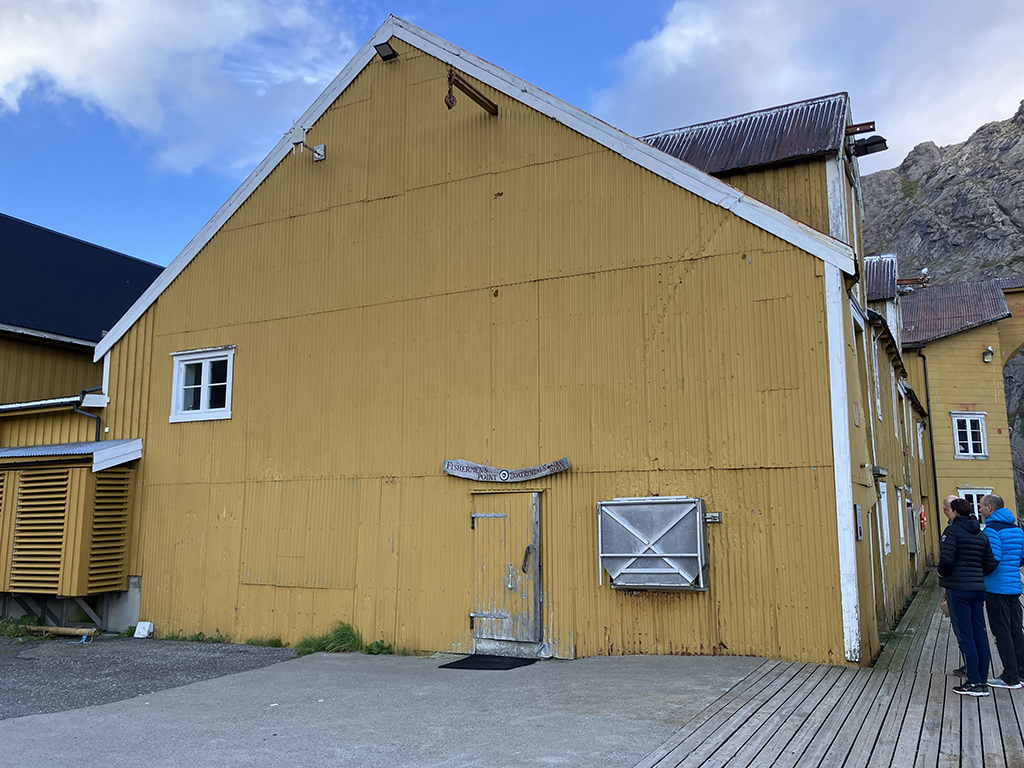 Nous avons visité le musée de la pêche à Å. La porte était ouverte mais la pancarte « closed » était posée sur une table. Nous avons parcouru seuls les deux salles avec un papier d’explications en français. Merci ! Partout au bord de la mer, il y a des séchoirs à poissons. Etonnés de n’y voir aucune bestiole, nous avons eu la réponse. Ce n’est pas comme le linge, le poisson ne sèche pas au soleil et à la chaleur. Le saison du cabillaud commence en novembre. Enfin, l’année dernière, cela a été en décembre. Il faut que les températures dans les eaux autour de la calotte glacière descendent bien pour que les cabillauds migrent vers les eaux norvégiennes. Le réchauffement climatique inquiète beaucoup les pêcheurs. Si les cabillauds n’avaient plus besoin de migrer, ce serait une catastrophe pour l’économie du pays.