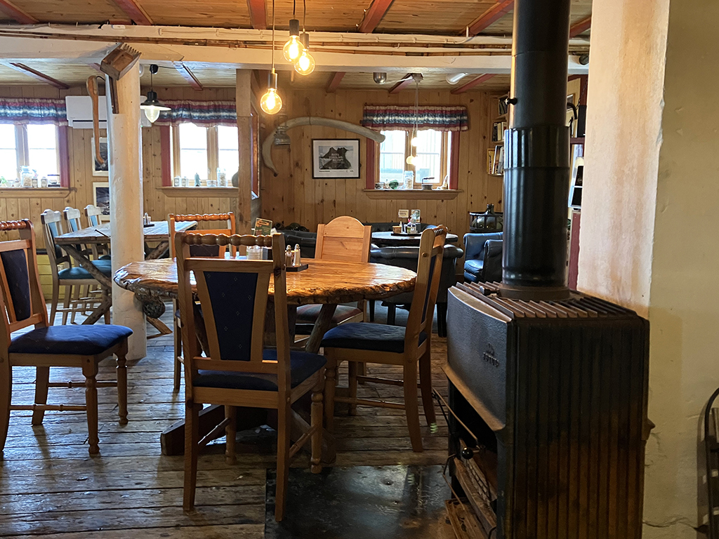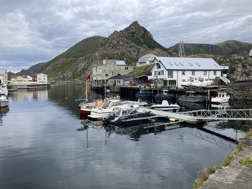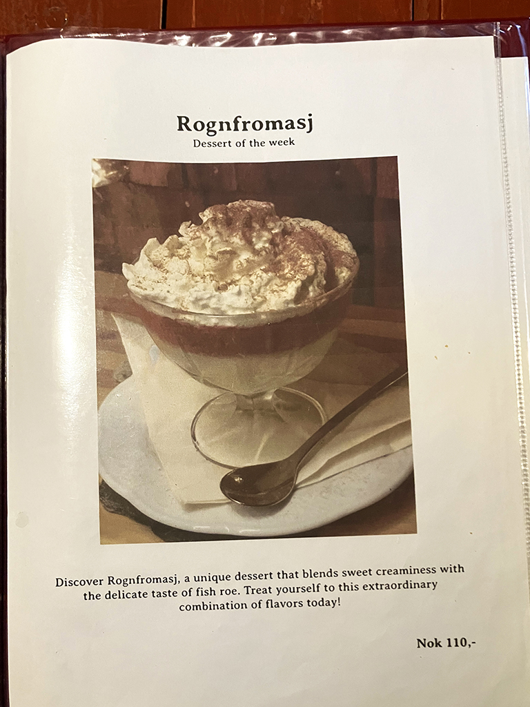 Il y a deux restaurants à Nyksund. Le plus visible est très chouette avec une carte bien étoffée. Malheureusement, aucune carte en anglais, nous avons passé notre chemin. De l’autre côté du port, après un dédale d’escaliers nous avons trouvé le deuxième. Petit, avec peu de plats mais nous y avons bien mangé. J’ai testé le hamburger de renne avec du chou rouge mariné et un chutney maison. Jeff a fait simple, de l’omble-chevalier. Les Norvégiens mangent beaucoup de pommes de terre. Il y en a avec tous les plats et les légumes sont juste ébouillantés, un peu trop « craquants » à notre goût. Pour le dessert, je n’ai pas pris de risque, une gaufre avec crème fraîche et confiture mais Jeff a été plus aventureux ! Un dessert aux œufs de poisson. Et bien en fait, ce n’est pas beurk ! J’ai goûté quand même et ce n’était pas salé, ni n’avait goût de poisson. Bref, surprenant ! Mais, on ne fera pas des kilomètres pour renouveler l’expérience.