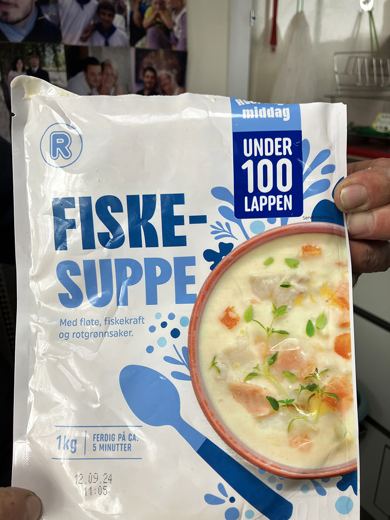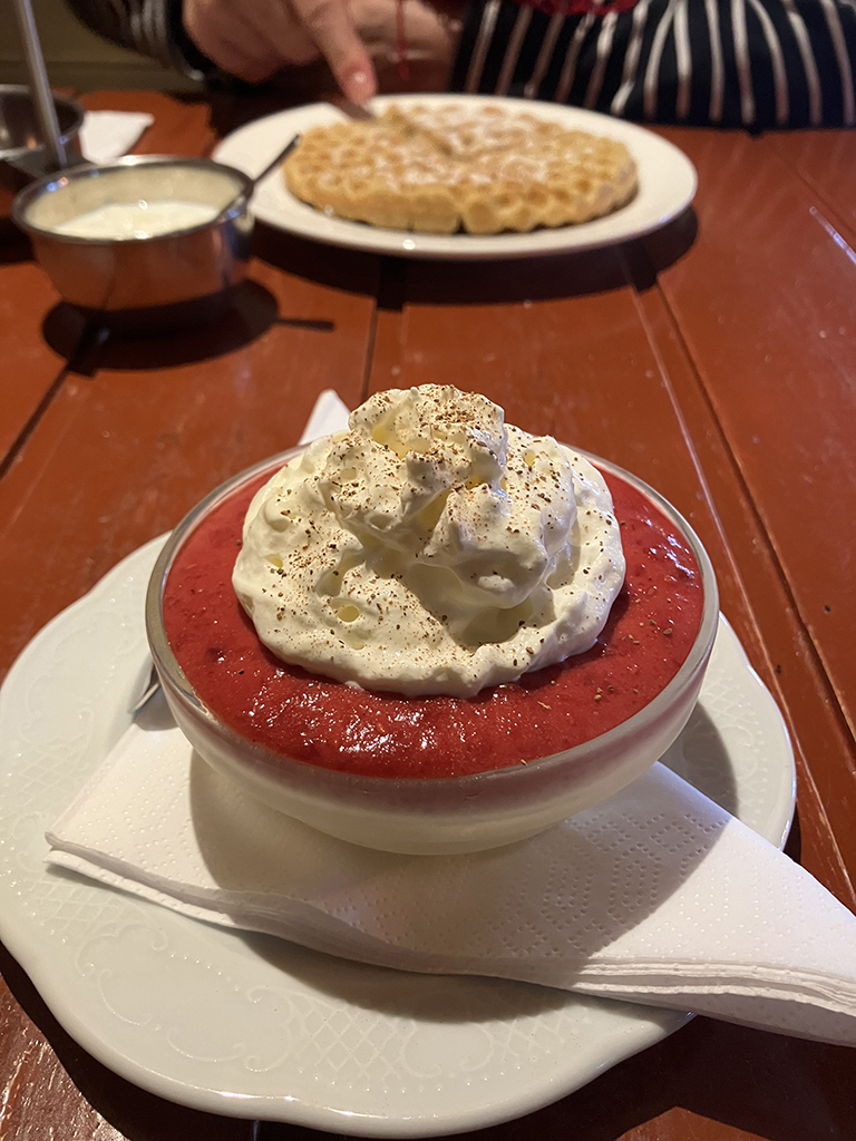 Nous avions entendu parler des gaufres au fromage brun. C’est une « spécialité » des ferrys. A priori, impossible d’en trouver ailleurs. Alors, on a essayé. Bien du bruit pour rien. La gaufre sucrée est beurrée et on y place une tranche de « fromage » de couleur beige foncée. C’est une pâte dure qui chauffée devient molle et collante mais n’apporte aucun goût. C’est pas mauvais, ça a juste le goût de gaufre.