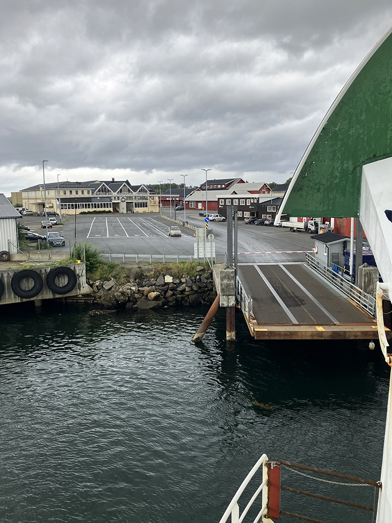 Allez, cette fois-ci, on va prendre le Ferry entre Melbu et Fiskebol sur l’île d’Austvågøya. Après notre première expérience, on est un peu stressé ! Bidouille va-t-il accepter de descendre ? Il est de bon poil ce jour, tout va bien !