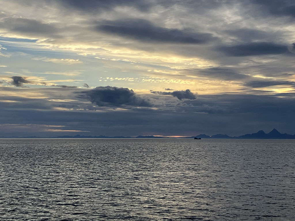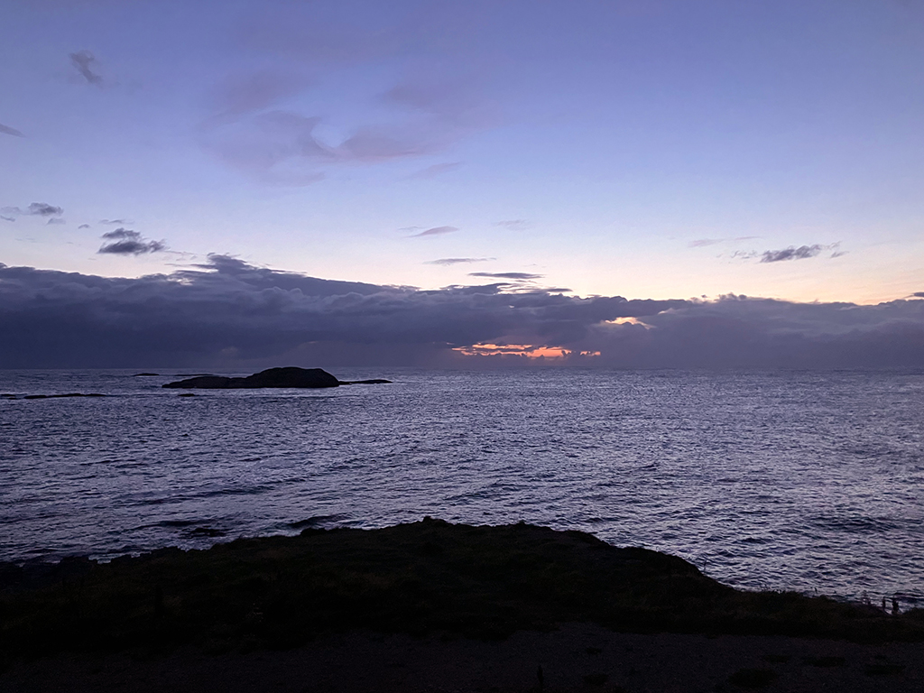 Autre anecdote. Nous avons voulu voir une aurore boréale. D’après une application spécialisée, les conditions étaient réunies pour en voir une vers Andenes. Donc, on s’éloigne de la pollution lumineuse, on trouve un coin avec un visuel dégagé au nord, on scrute la couverture nuageuse et on attend. Bon, on se gèle aussi et pour rien, car la « nuit » n’est pas assez noire ! Bref, à une heure du mat, ne voyant pas le ciel s’assombrir suffisamment, on replie l’appareil photo et on rentre prendre une boisson chaude ! Il va falloir qu’on soit un peu patient. Les jours raccourcissent.