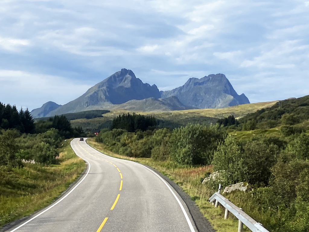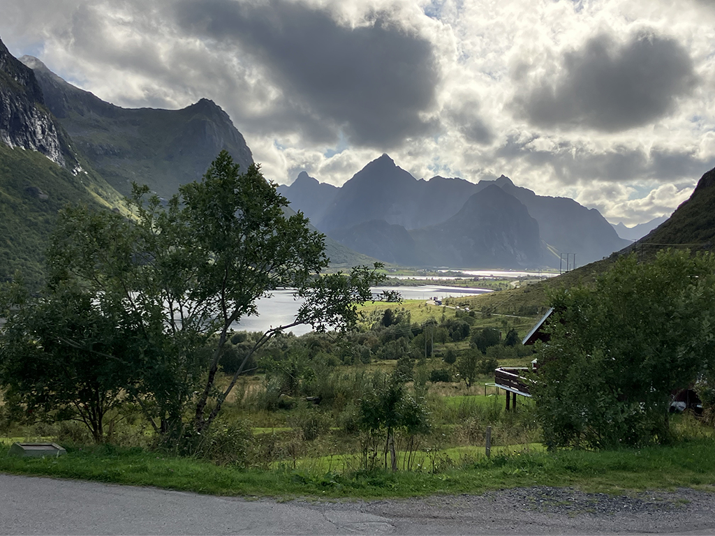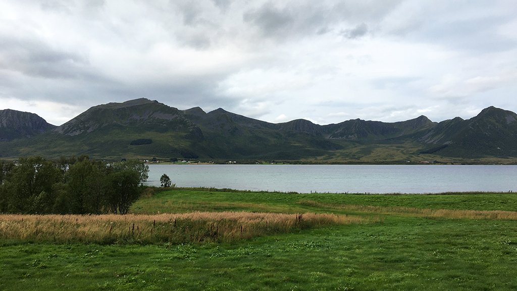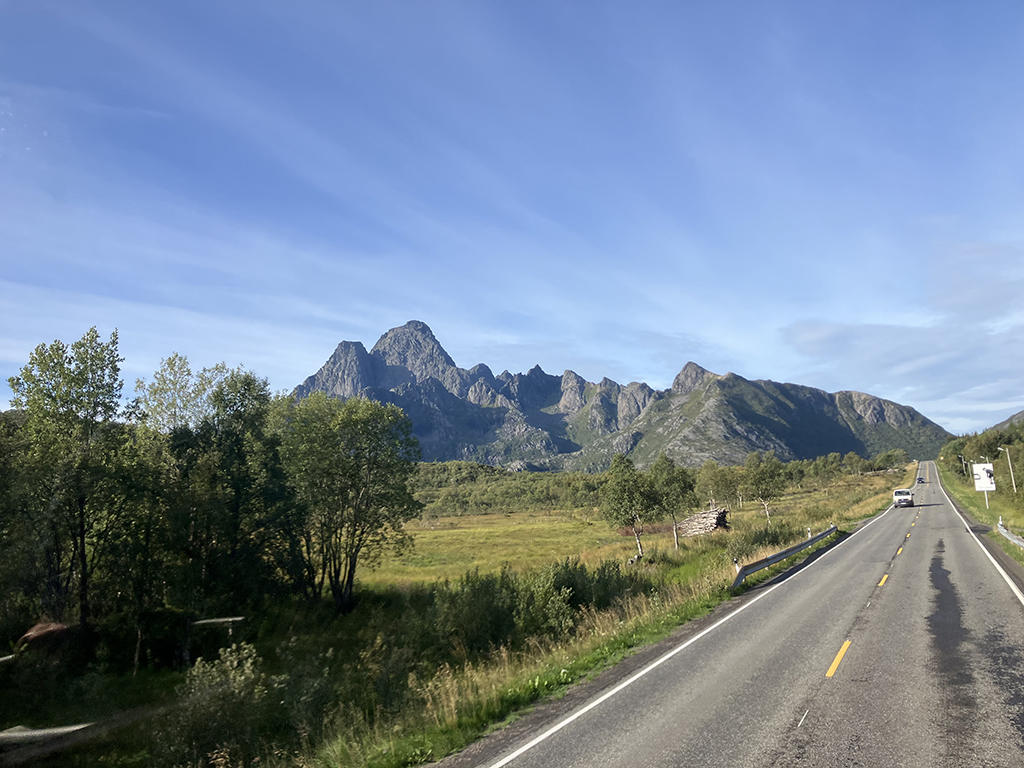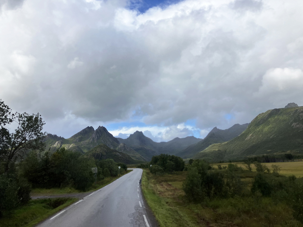 Le ciel est toujours bien chargé. Aussi, inutile d’envisager de faire une des nombreuses randonnées possibles dans les îles. Nous remontons tranquillement jusqu’à Leknes pour trouver un restaurant. Aujourd’hui, nous sommes le 1er Septembre et c’est l’anniversaire de mon Homme ! En plus, demain nous aurons du soleil, donc les paysages seront bien différents. Ici, il faut jouer avec la météo pour bénéficier du meilleur combo : soleil, côtes, ciel bleu et sommets montagneux .