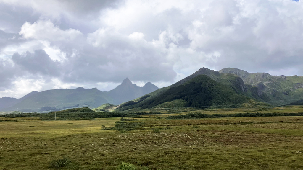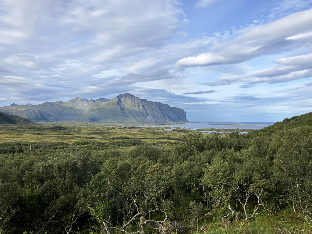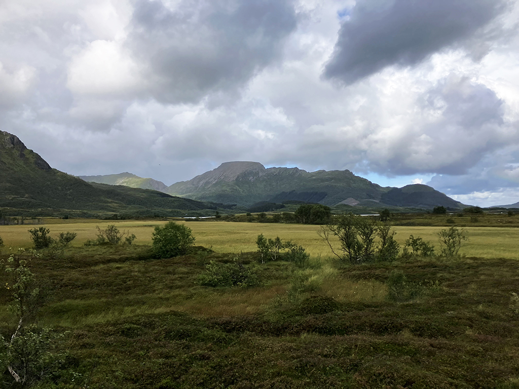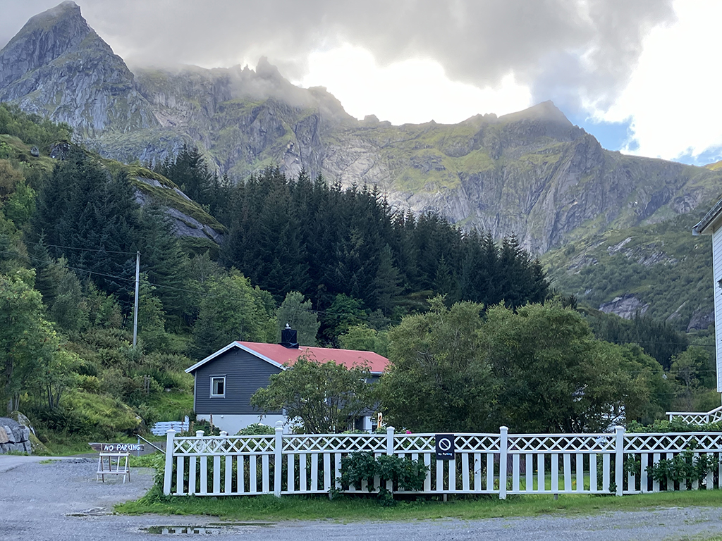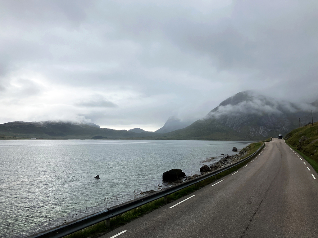 Le ciel est toujours bien chargé. Aussi, inutile d’envisager de faire une des nombreuses randonnées possibles dans les îles. Nous remontons tranquillement jusqu’à Leknes pour trouver un restaurant. Aujourd’hui, nous sommes le 1er Septembre et c’est l’anniversaire de mon Homme ! En plus, demain nous aurons du soleil, donc les paysages seront bien différents. Ici, il faut jouer avec la météo pour bénéficier du meilleur combo : soleil, côtes, ciel bleu et sommets montagneux .