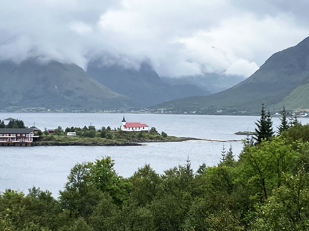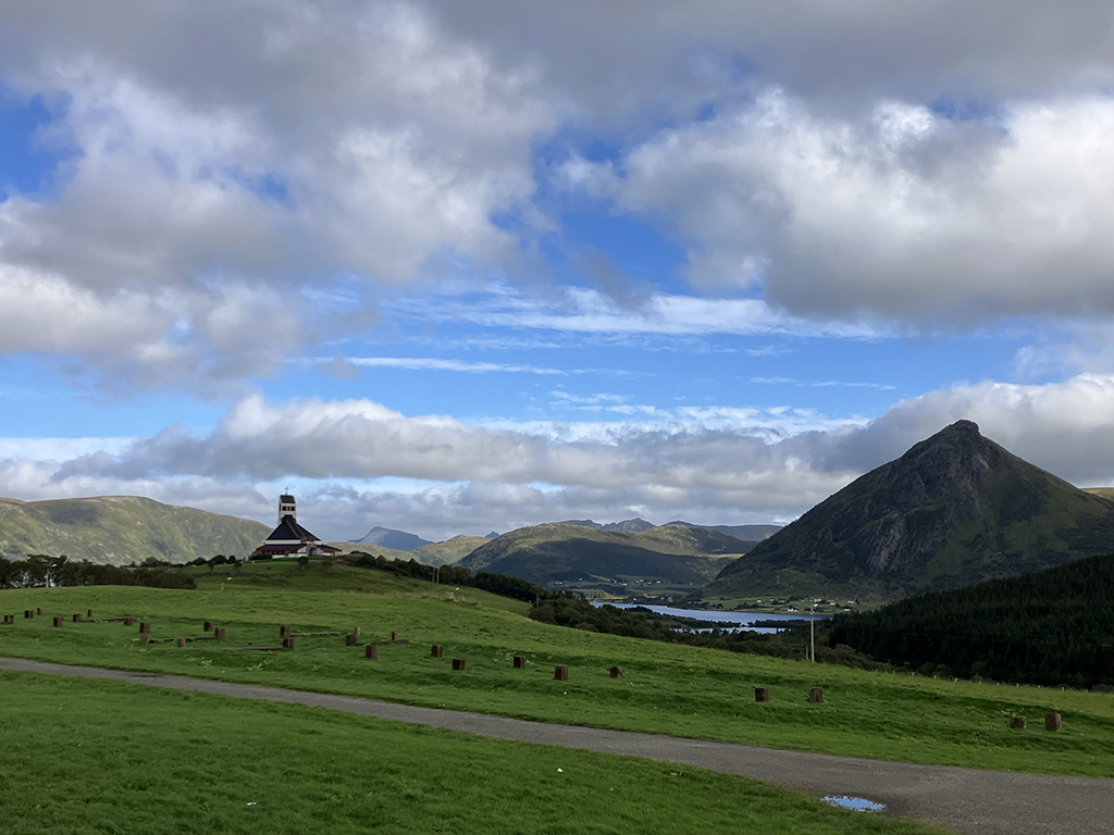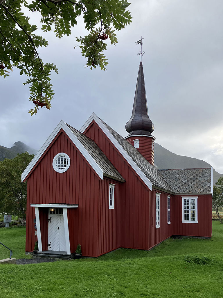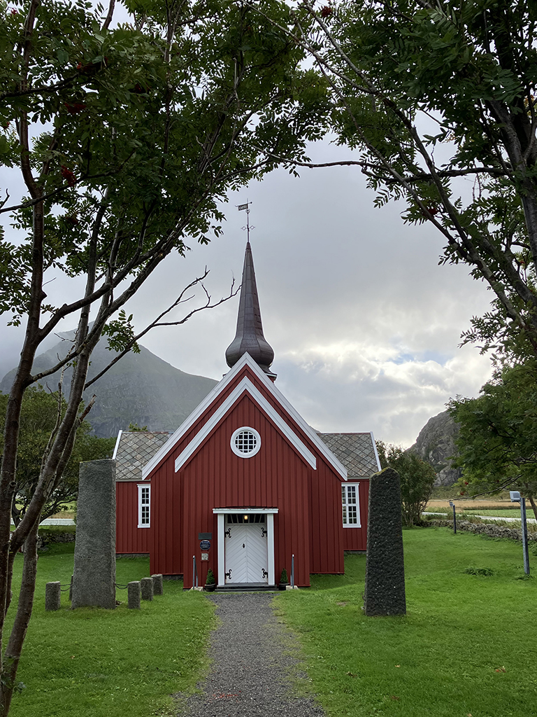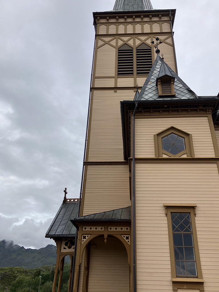 Nous nous arrêtons visiter la « Cathédrale » des Lofoten. Eglise en bois de belle taille , deuxième du pays en nombre de places (1200), elle fut bâtie en1898 pour accueillir les pêcheurs saisonniers. Mais, elle était fermée.